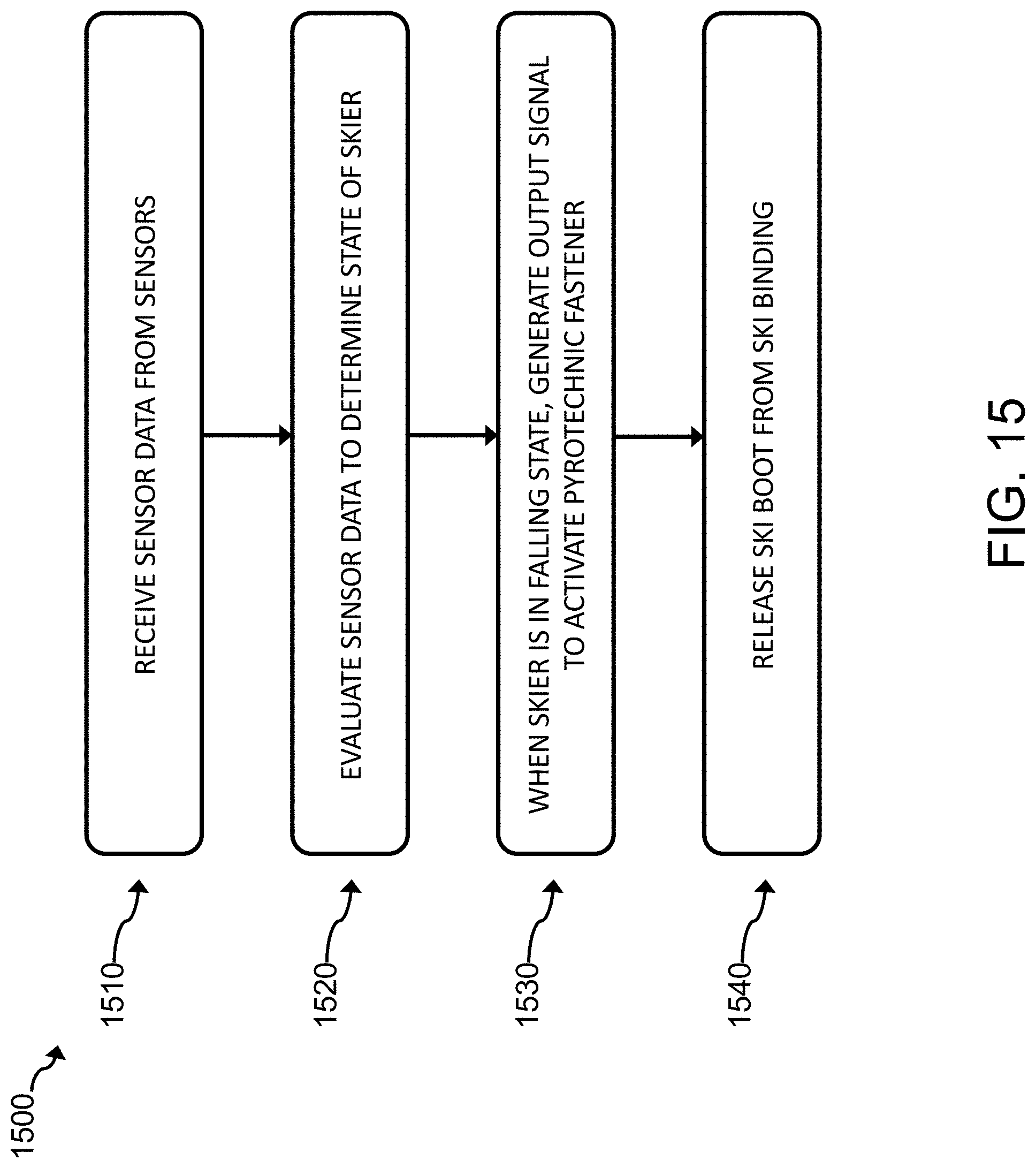 receiving, by a processor-based controller, sensor data from a plurality of sensors disposed on a skier, on the ski boot, and/or on the ski binding; in the processor-based controller, evaluating the sensor data to determine a state of the skier; when the processor-based controller determines that the skier is in a falling state, automatically generating an output signal, with the processor-based controller, to activate a pyrotechnic fastener in the ski binding, the pyrotechnic fastener maintaining a spring, in the ski binding, in a first state that secures the ski boot in the ski binding; generating an explosion with the pyrotechnic fastener, the explosion breaking at least a portion of the pyrotechnic fastener; and transitioning the spring from the first state to a second state that releases the ski boot from the ski binding. 16. The method of 17. The method of 18. The method of 19. The method of 20. The method of 21. An automated method for releasing a ski boot from a ski binding, comprising: