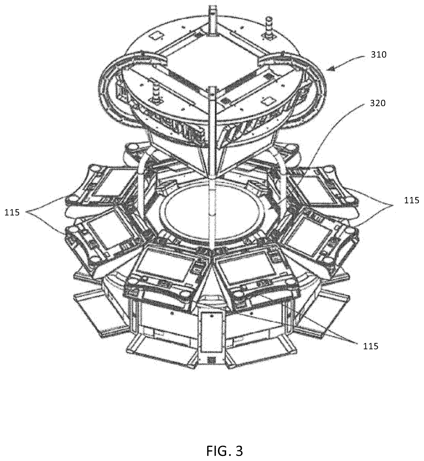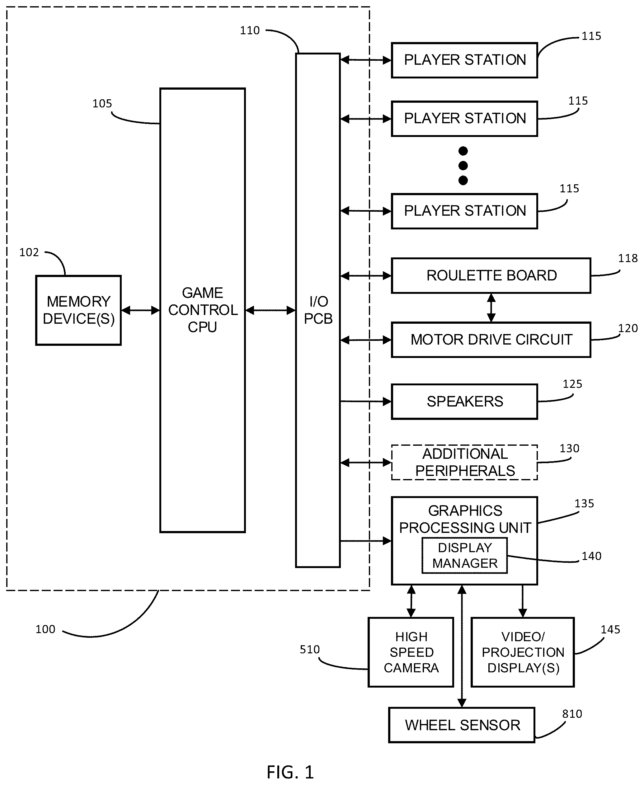 a) receive a communication from at least one of the plurality of player stations indicating a wager has been accepted for a play of a roulette game; b) cause the roulette wheel to spin; c) cause a roulette ball to be launched; d) cause a graphical processing unit to: