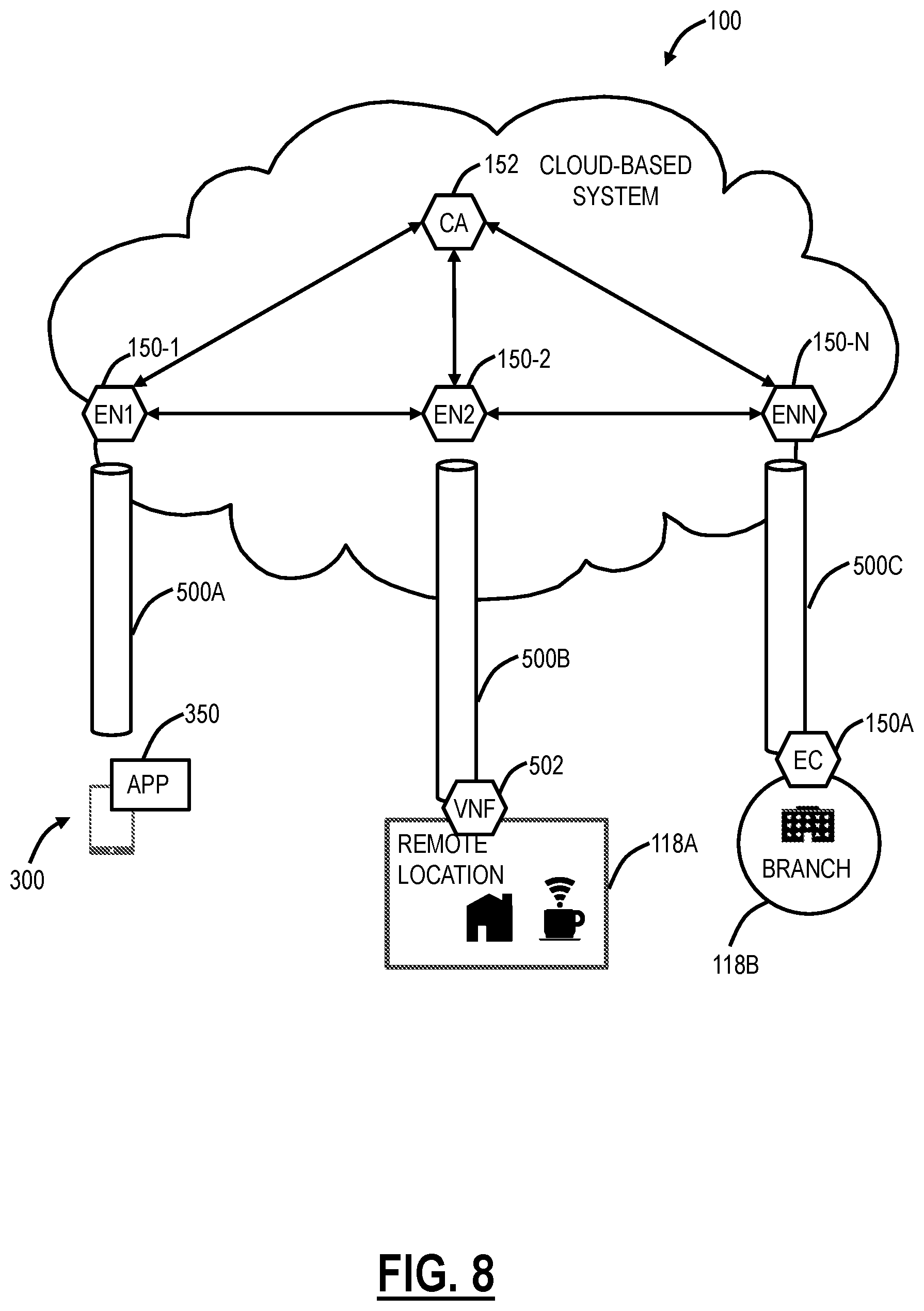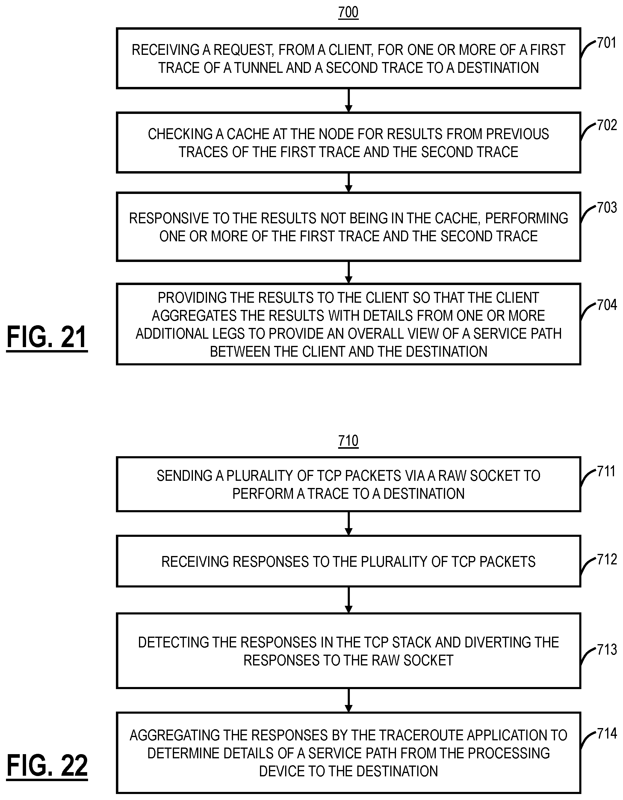 The present disclosure relates generally to networking and computing. More particularly, the present disclosure relates to various techniques for using traceroute with tunnels and cloud-based systems for determining measures of network performance. The trend in Information Technology (IT) includes applications and resources being located in the cloud, users working from home or anywhere, and for the Internet becoming the new corporate network. As such, there is a need for IT to monitor and isolate issues affecting the user-to-cloud application experience. That is, there is a need for IT administrators to have visibility into the network and details of service paths. Various User Experience (UX or UEX) tools and approaches seek to quantify an individual user's satisfaction with a product or service such as a networking application. Examples include End User Experience Monitoring (EUEM) tools, Network Performance Monitoring and Diagnostics Market (NPMD) tools, Application Performance Monitoring (APM) tools, and Digital Experience Monitoring (DEM) tools. One aspect of these tools includes network measurements, such as using a traceroute. There are various tools to collect information about possible network paths followed by traffic. These tools give a holistic view of the complete network path. Traceroute is used “trace routes” of paths and measure packet delays in Internet Protocol (IP) networks. Traceroute is a diagnostic command to find the routes (paths) and measures the latency to each hop. In traceroute, each node is called a hop, and the latency is the round trip from the user's machine to the hop. With increasing network sniffing and network threats, many enterprises use encrypted tunnels. Also, cloud-based systems can forward traffic to the cloud using encrypted tunnels. For example, tunnels can be based on Generic Routing Encapsulation (GRE), Layer Two Tunneling Protocol (L2TP), Internet Protocol (IP) Security (IPsec), Virtual Private Networks (VPN), Hypertext Transfer Protocol (HTTP), Transmission Control Protocol (TCP), etc. Some of these tunnels are opaque to existing tools such as traceroute, causing the wrong details about network state. Also, conventional TCP traceroute applications/tools cannot determine if the destination has been reached as they have no ability to read the response sent by the destination. The conventional traceroute has limitations that it might not be complete, and the results are not accurate for the final hop as the final hop does not provide the processing delay. The traceroute results might not be complete as the final destination might not respond to the probe. The conventional traceroute does not provide the latency between the hops. Routers typically have a very fast forward path as this is done in the hardware, but some routers take significant time to respond to Time to Live (TTL) expired messages as they do this through software. The present disclosure relates to various techniques for using traceroute with tunnels and cloud-based systems for determining measures of network performance. The various techniques are used to detect network hops, packet loss, and latency from a client to a destination as well as discover how the client connects to the Internet and if any proxies or firewalls are present in the path. For determining a connection to the Internet, the present disclosure includes a technique to detect tunnels. For determining proxies or firewalls, the present disclosure utilizes an Application Programming Interface (API) to detect an egress router's IP port on a client's network. Once the client has visibility of the path (i.e., tunnels, proxies, firewalls, etc.), the client can communicate, such as out of band, to request other devices to trace different legs. Note, in various descriptions, the term traceroute or trace can also include PING, such as the My Traceroute (MTR). The present disclosure is illustrated and described herein with reference to the various drawings, in which like reference numbers are used to denote like system components/method steps, as appropriate, and in which: Again, the present disclosure relates to various techniques for using traceroute with tunnels and cloud-based systems for determining measures of network performance. The various techniques are used to detect network hops, packet loss, and latency from a client to a destination as well as discover how the client connects to the Internet and if any proxies or firewalls are present in the path. For determining a connection to the Internet, the present disclosure includes a technique to detect tunnels. For determining proxies or firewalls, the present disclosure utilizes an Application Programming Interface (API) to detect an egress router's IP port on a client's network. Once the client has visibility of the path (i.e., tunnels, proxies, firewalls, etc.), the client can communicate, such as out of band, to request other devices to trace different legs. Note, in various descriptions, the term traceroute or trace can also include PING, such as the My Traceroute (MTR). § 1.0 Example Cloud-Based System Architecture The cloud-based firewall can provide Deep Packet Inspection (DPI) and access controls across various ports and protocols as well as being application and user aware. The URL filtering can block, allow, or limit website access based on policy for a user, group of users, or entire organization, including specific destinations or categories of URLs (e.g., gambling, social media, etc.). The bandwidth control can enforce bandwidth policies and prioritize critical applications such as relative to recreational traffic. DNS filtering can control and block DNS requests against known and malicious destinations. The cloud-based intrusion prevention and advanced threat protection can deliver full threat protection against malicious content such as browser exploits, scripts, identified botnets and malware callbacks, etc. The cloud-based sandbox can block 
