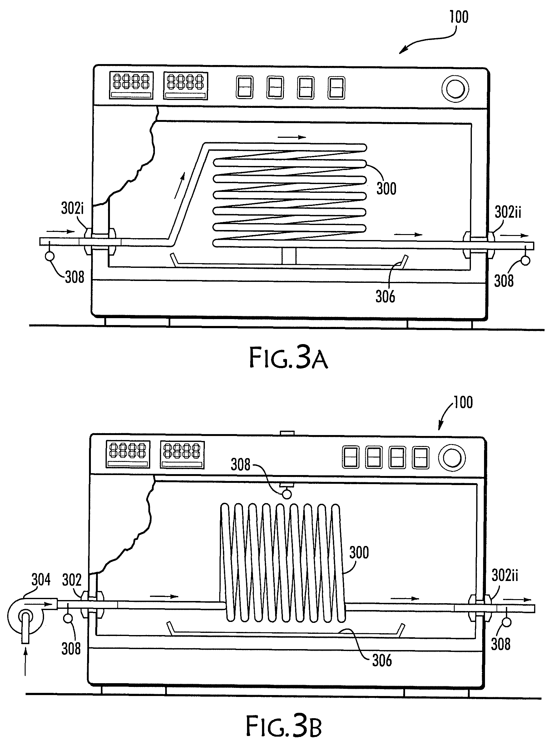 FIGS. 3A and 3B are schematics of a liquid waste treatment module 104 of an integrated, hybrid microwave system 100, in accordance with an exemplary embodiment of the invention. In an embodiment of the invention, flowing liquids are treated in the system 100 by passing the liquid through a coil 300 which passes through the hybrid microwave. Optionally, the coil 300 passes through a susceptor box 200 (not shown). In an embodiment of the invention, the coil 300 is adapted to suit the treatment required by the liquid material. For example, the diameter of the coil (tubing) and/or the number of loops can be used to control the resident time of the liquid to be treated (as an example, the more loops, the longer possible time of treatment exposure). A pump system 304 is optionally used to control the liquid material volume and/or flow rates into and out of the system 100, which also could be used to affect treatment times. Optionally, return tubing is provided to re-cycle liquid material through the system 100. Optionally, the tubing is used to connect more than one system 100 together.