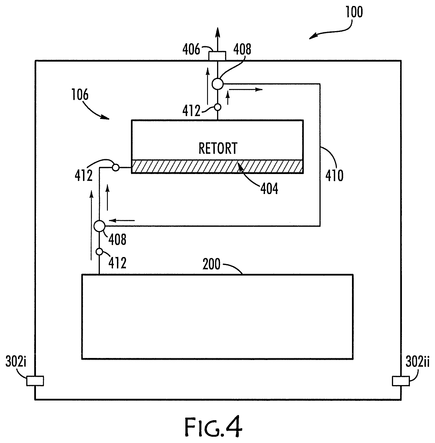While FIG. 4 shows a susceptor box 200 and tubing extending from the box 200 to the retort 402, in some embodiments of the invention, the retort 402 is connected directly to a coil 300 through which gaseous materials are flowing for treatment, where the gaseous materials are not merely off-gases.