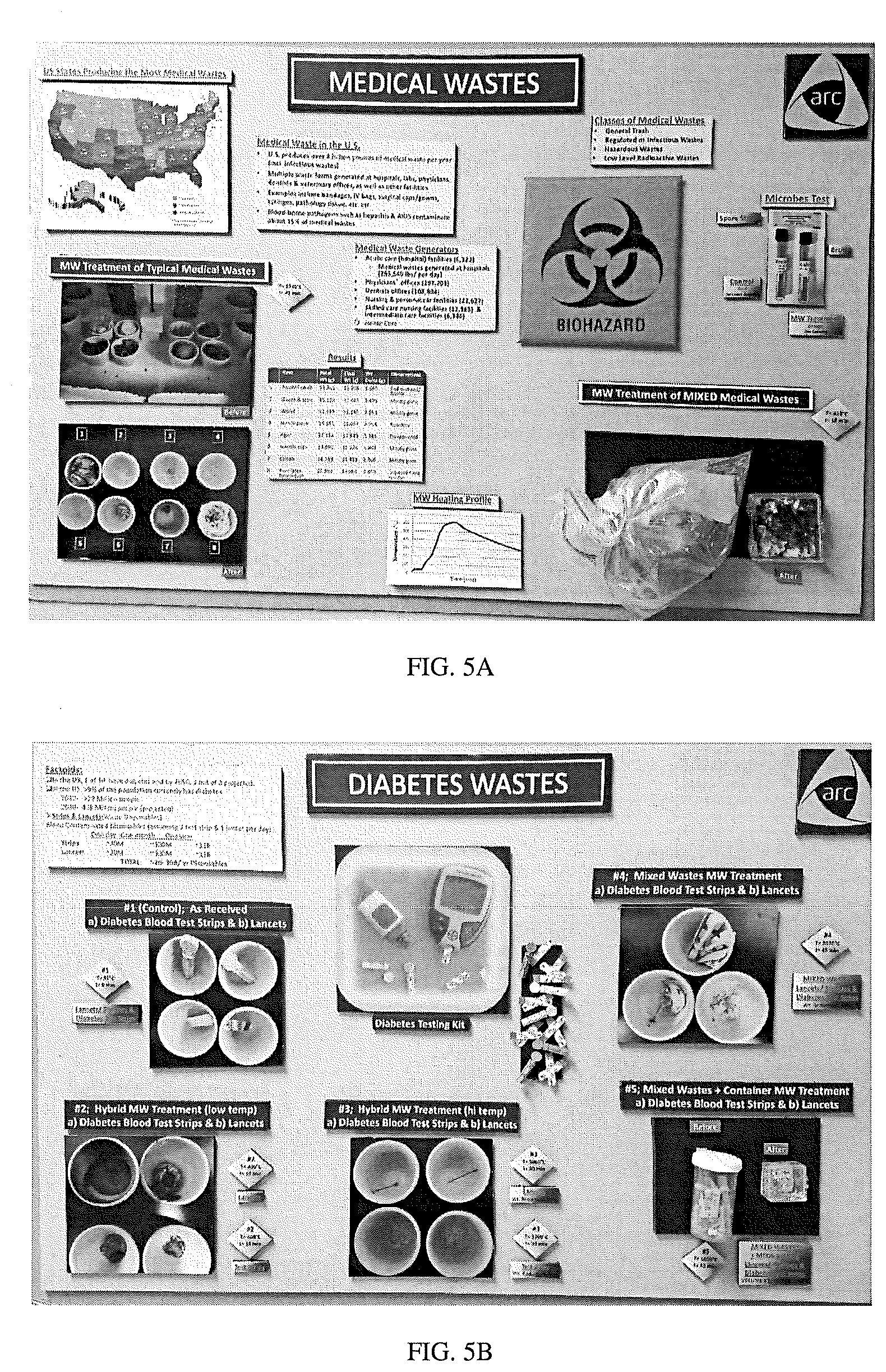 FIGS. 5A and 5B show images of pictures of treatment, destruction/volume reduction of various medical wastes, in accordance with an exemplary embodiment of the invention.