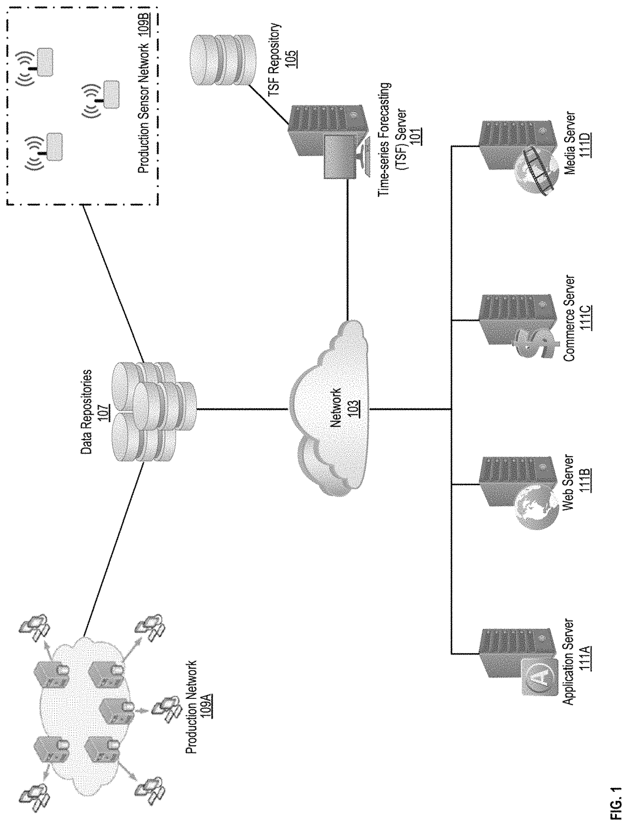 where yiis the ithobserved or sampled data point of a testing set and ŷiis a forecasted data point. In some instances, a forecast accuracy score for an entrant forecasting model can be computed by calculating a Mean Absolute Error (MAE): where n is the number of pairs (yi, ŷi) used during a testing phase of an entrant forecasting model. MAE measures the average magnitude of a set of errors |ei| in a set of forecasted data points |ŷi| as the average of the absolute difference between forecasted data points and actual observations in which all individual differences have equal weight. In some instances, a forecast accuracy score for an entrant forecasting model can be computed by calculating a Root Mean Squared Error (RMSE): where n is the number of pairs (yi, ŷi) used during a testing phase of an entrant forecasting model. RMSE measures the average magnitude of the error as the average of squared differences between forecasted data points and actual observations. In RMSE errors eiare squared before they are averaged. RMSE grants a relatively high weight to large forecast errors. Accordingly, TSF server 101 can favor entrant forecasting models with forecast accuracy scores based on RMSE in instances when large errors are particularly undesirable. MAE and RMSE are some examples of measures that can be used to compute forecast accuracy scores. In some instances, TSF server 101 can use more than one technique to evaluate forecast accuracy of entrant forecasting models. Further forecast accuracy techniques include computing mean absolute percentage errors (MAPE), mean absolute scaled errors (MASE), normalized root mean square error (NRMSE), coefficient of valuation (CV), mean of forecasted values (MFV), standard deviation of forecasted values (SFV), and other suitable measures for the assessment of accuracy of forecasted data points. The logic flow is then directed to conditional statement 615 where TSF server 101 verifies whether the current entrant forecasting model is the last entrant forecasting model in a set of entrant forecasting models. If the current entrant forecasting model is the last entrant forecasting model of the set, then the process ends. If, however, the current entrant forecasting model is not the last entrant forecasting model then, the process continues at 601. In some instances, TSF server 101 can determine at 603 that there are insufficient samples to perform testing of an entrant forecasting model. In such a case, TSF server 101 trains the entrant forecasting model with any available observations or samples of time series data points. Then, the trained entrant forecasting model is executed to produce a set of forecasted data points at 611. In some instances, TSF server 101 computes a forecast accuracy score at 613, based on forecasting fitness measures, for example, by using an information criterion computed from the trained entrant forecasting model. Some examples of information criteria that can be used to compute such a fitness measure include criteria based on Akaike information criterion (AIC) (including AIC corrected information criterion), Bayesian information criterion (BIC), and other suitable information criterion. In some other instances, TSF server 101 computes a forecast accuracy score at 613 based on a comparison of the set of forecasted data points with time series data points acquired at a later period of time than the time when the training dataset was sampled. Thereafter, the logic flow is directed to conditional statement 615 as discussed above. TSF server 101, stores each of the trained entrant forecasting models and their computed forecast accuracy scores in memory (e.g., TSF repository 105, in TSF server 101 uses multiple strategies to define training and testing datasets from samples of a time series. Two examples of such strategies are discussed with reference to In some instances, TSF server 101 defines training datasets from a sampled time series by selecting one or more time periods included in the time series, for instance, training datasets 701A, 701B, and 701C in In some instances, samples of a time series can include anomalous or outlier data points that are not representative of the data points of a time series, for example the vertex in the pronounced minimum point 705. When training datasets are strongly characterized by anomalous data points, forecasting accuracy of a forecasting model can be impaired. Therefore, in some instances, TSF server 101 trains entrant forecasting models with more than one training dataset. Moreover, large outliers/anomalies in the observations can cause a false negative when detecting seasonality. In some implementations, anomalies such as the vertex in the pronounced minimum point 705 are removed from observations or time series data points to determine seasonality characteristics. In such a case, data point 705 is removed only during the execution of seasonality detection processes discussed with reference to data analyzer and filtering engine 217 ( In some instances, TSF server 101 defines testing datasets from a sampled time series by selecting one or more time periods included in the time series, for instance, testing periods A, B, and C respectively labeled as 703A, 703B, and 703C in TSF server 101 computes forecasting accuracy scores for each entrant forecasting model during testing periods, e.g., testing periods 703A, 703B, and 703C. Forecasting accuracy scores are generally computed as a function of a comparison between a forecasted data point for time i with a time series data point sampled or observed at time i. In some instances, TSF server 101 computes an overall forecasting accuracy score for a given entrant forecasting model by computing descriptive statistics (e.g., mean, mode or other suitable descriptive statistics) on a set of forecasting accuracy scores computed for an entrant forecasting model. Example techniques to compute forecasting accuracy scores were discussed above with refere