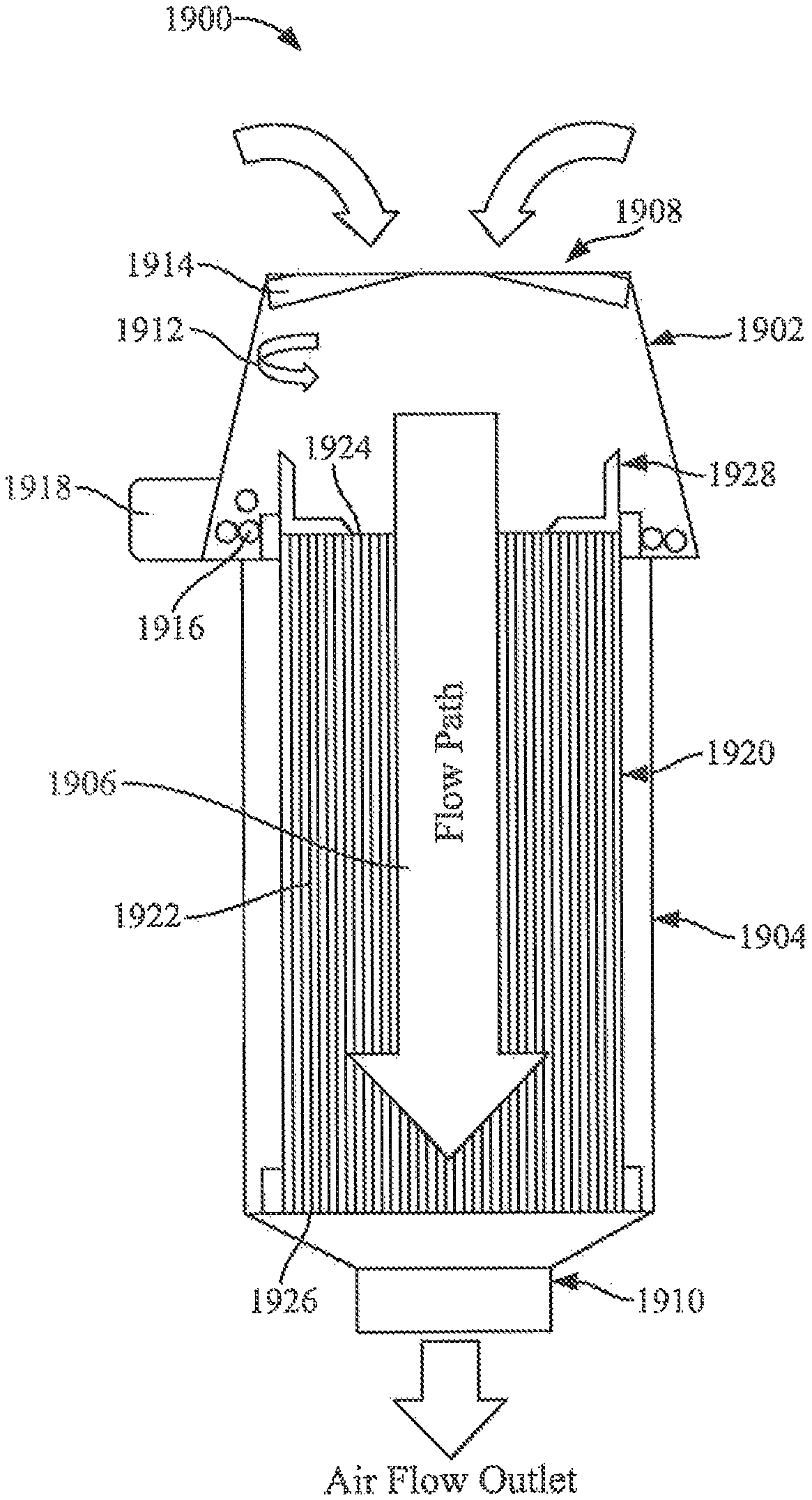 [0046]As shown in FIG. 19, the filter element 1920 includes a vortex finder 1928. The vortex finder 1928 comprises a wall that extends from an inlet face of the filter media 1922 or from the first end cap and extends into the pre-cleaner housing 1902. In arrangements where the filter element 1920 is a cylindrical filter element, the vortex finder 1928 comprises a circumferential wall, with the circumferential wall forming an uninterrupted loop (e.g., a circular uninterrupted loop). The vortex finder 1928 prevents contaminant 1916 separated from the air in the pre-cleaner housing 1902 from entering the filter element 1920. The vortex finder 1928 may be integrated with the filter element 1920 (e.g., as a urethane or overmolded part coupled to the first end cap 1924).