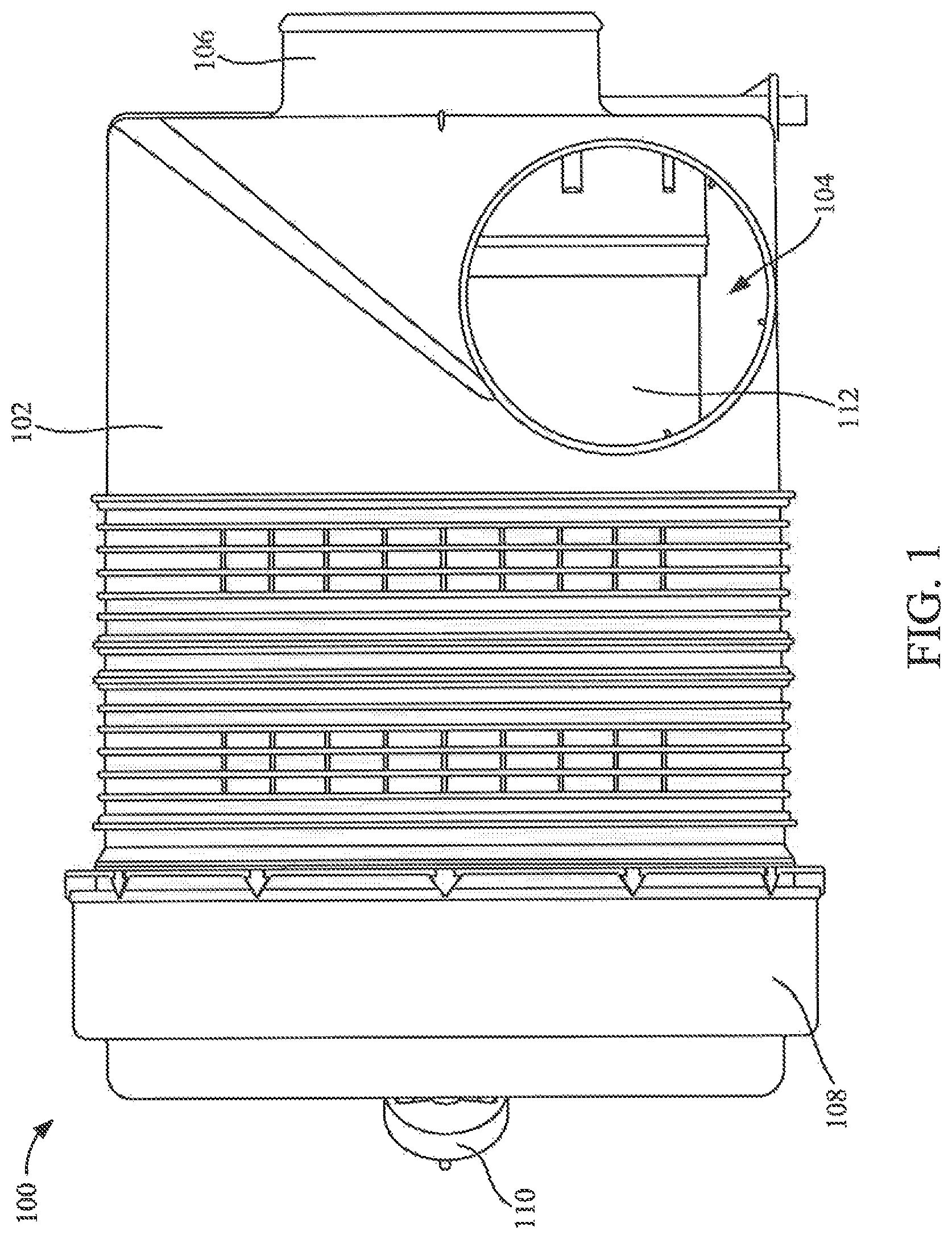 [0026]Referring to FIG. 1, a side view of an air filtration system 100 is shown according to an example embodiment. The air filtration system 100 includes a cylindrical housing 102 forming a central compartment. The housing 102 includes a radial air inlet 104 and an axial air outlet 106. The radial air inlet 104 and the axial air outlet 106 are positioned near a first end of the housing 102. The housing 102 includes a cover 108. The cover 108 is removably coupled to a second end of the housing 102. The second end of the housing 102 is opposite the first end of the housing 102. The cover 108 includes a dust ejection port 110. A cylindrical filter element 112 is positioned within the central compartment of the housing 102. The cylindrical filter element 112 includes a wound filter media and is arranged for axial flow filtration. That is, air to be filtered flows into a first axial face of the filter element 112 (i.e., the inlet face of the filter element 112), the air passes through the wound filter media, and filtered air exits the filter element through a second axial face of the filter element 112 (i.e., the outlet face of the filter element 112). The second axial face of the filter element 112 is positioned adjacent to the axial air outlet 106. The first axial face of the filter element 112 is positioned adjacent to the cover 108.