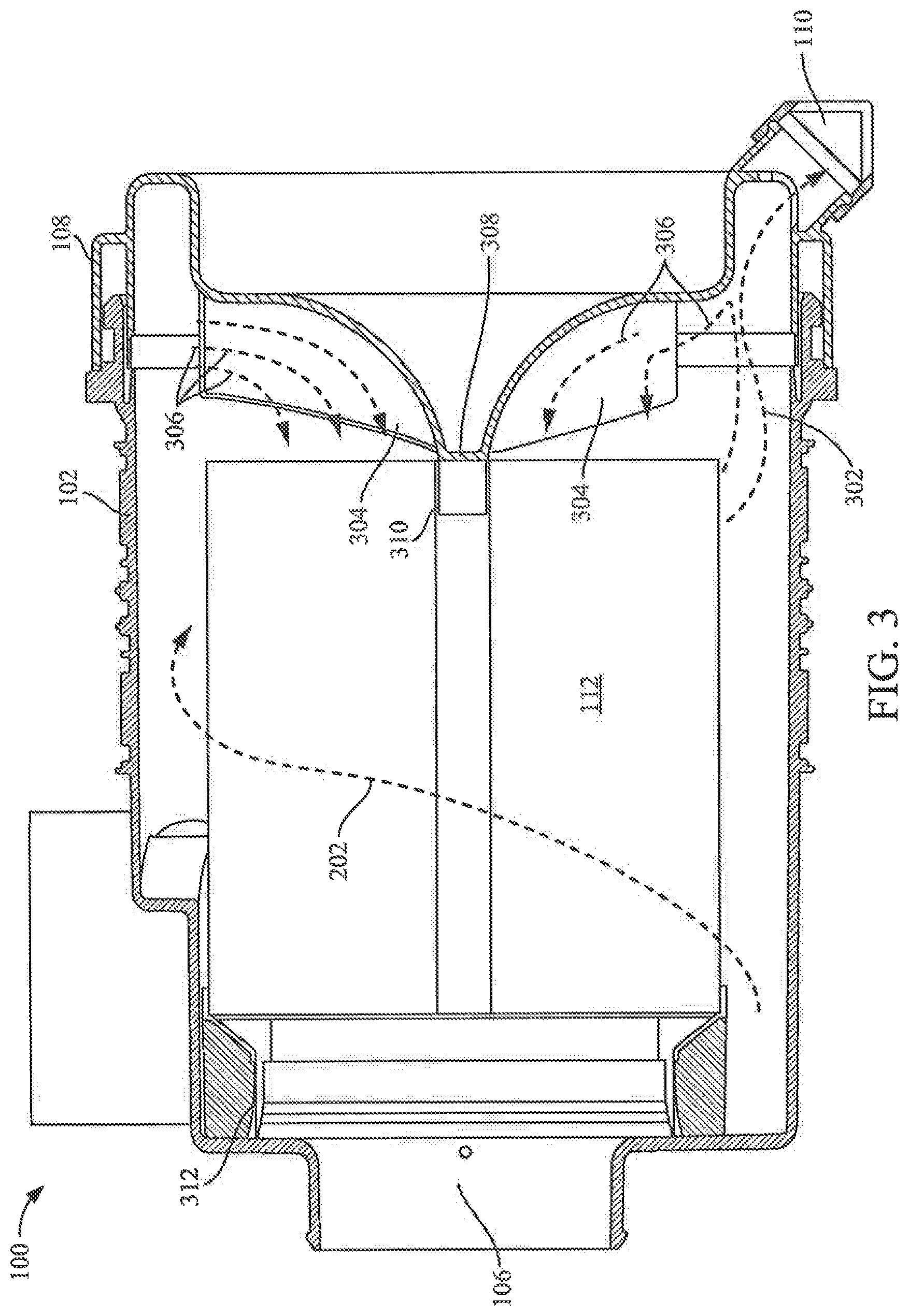 [0029]As shown in FIGS. 2 and 3, air to be filtered enters the filtration system 100 through the radial air inlet 104 and follows flow path 202. The air impacts the sidewall of the filter element 112. The air is then routed around the filter element 112 in a swirling manner as shown by flow path 202 because the filter element 112 is an axial flow filter element, not a radial flow filter element. In some arrangements, the sidewall of the filter element 112 is an impermeable sleeve that protects the outer surface of the filter element 112 from damage during shipping and installation. In other arrangements, the side wall of the filter element 112 is composed of permeable filter media. In such arrangements, a small quantity of the air may pass through the filter element side wall. The swirling flow path 202 separates at least a portion of the contaminants (shown as arrow 302) from the air, such as dust and dirt, through the centrifugal force generated by the swirling air flow. The separated contaminants fall to the dust ejection port 110. Accordingly, the swirling flow path 202 functions as a cyclonic pre-cleaner.