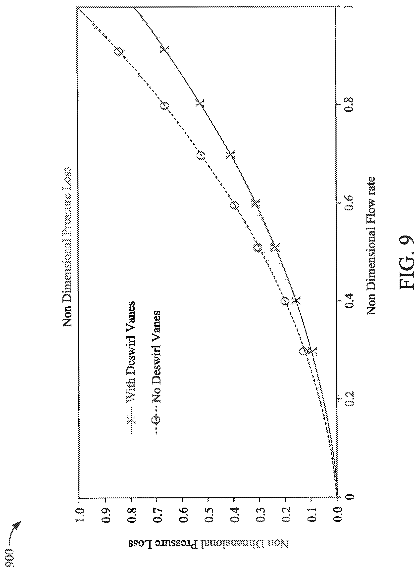 [0033]As discussed above, the inclusion of the de-swirl vanes 304 reduces the pressure drop caused by the filtration system 100. FIGS. 9 through 15 provide example air flow analyses showing the reduced pressure drop in filtration systems employing the de-swirl vanes 304. As shown in FIG. 9, a line graph 900 of non-dimensional pressure loss vs. non-dimensional flow rate is shown for two filtration systems: a first filtration system having de-swirl vanes (X) and a second filtration system without de-swirl vanes (O). The first filtration system may be, for example, filtration system 100. As such, the first filtration system includes de-swirl vanes (e.g., de-swirl vanes 304). The second filtration system is substantially the same as the first filtration system (in arrangement, size, and operating parameters), except the second system does not have de-swirl vanes. As shown in graph 900, the second filtration system experiences a higher non-dimensional pressure loss than the first filtration system.