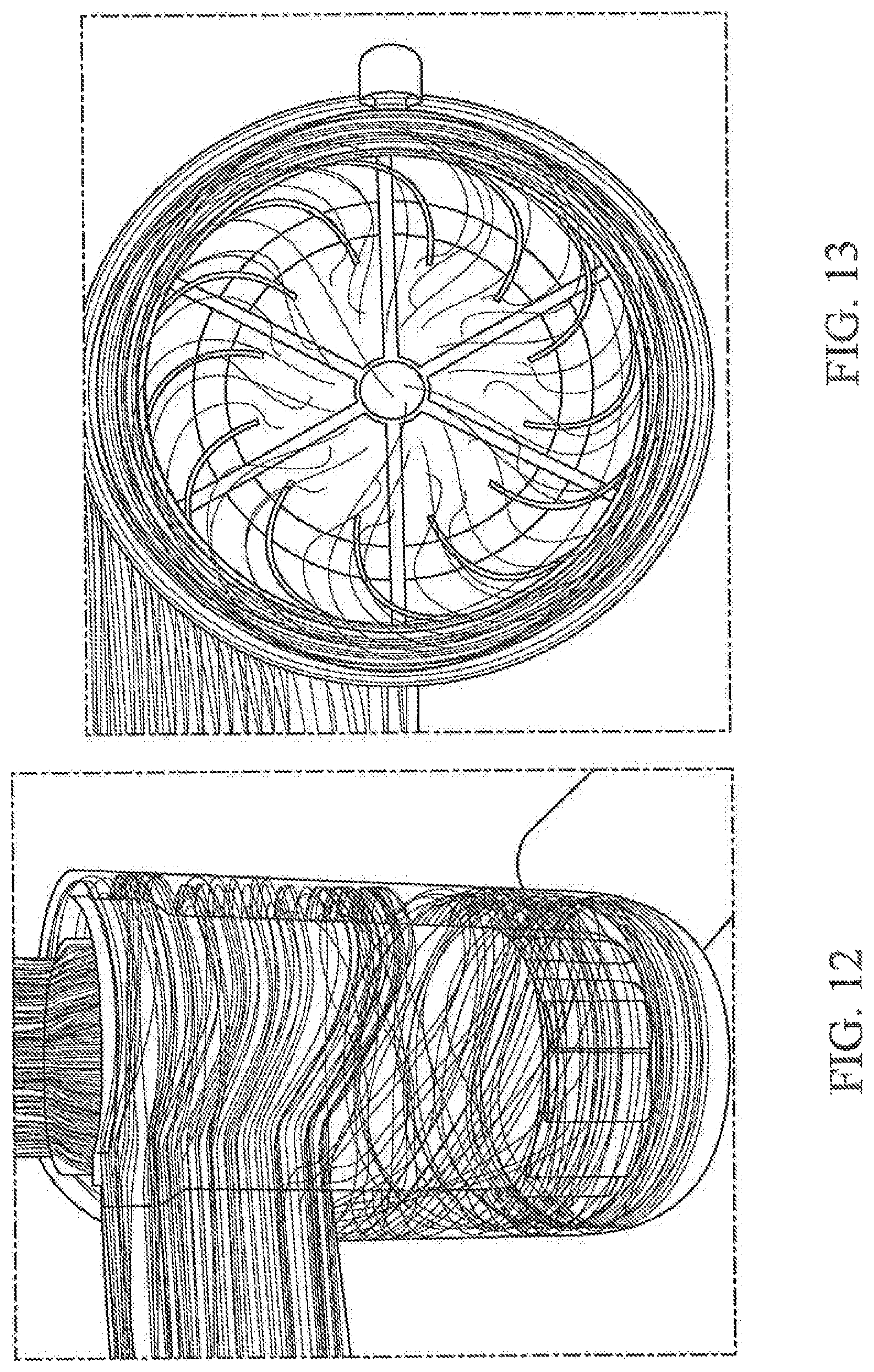 [0034]Referring to FIGS. 10 through 13, air flow diagrams of the first filtration system and the second filtration system are shown to further demonstrate the more efficient flow of the first filtration system. As shown in FIGS. 10 and 11, which demonstrate example air flow paths for the second filtration system without the de-swirl vanes, the air flow enters the inlet face of the filter element 112 in a swirling manner. This is not optimal because the filter element 112 is an axial flow filter element. The non-optimal air flow into the filter element 112 contributes to the increased pressure drop of the second filtration system. As shown in FIGS. 12 and 13, which demonstrate example air flow paths for the first filtration system having the de-swirl vanes 304, the air flow is turned from a swirling flow into a substantially axial flow prior to entering the inlet face of the filter element. Accordingly, when the de-swirl vanes 304 are employed, the air enters the filter element 112 in a more-optimal air flow path than in arrangements without the de-swirl vanes 304.