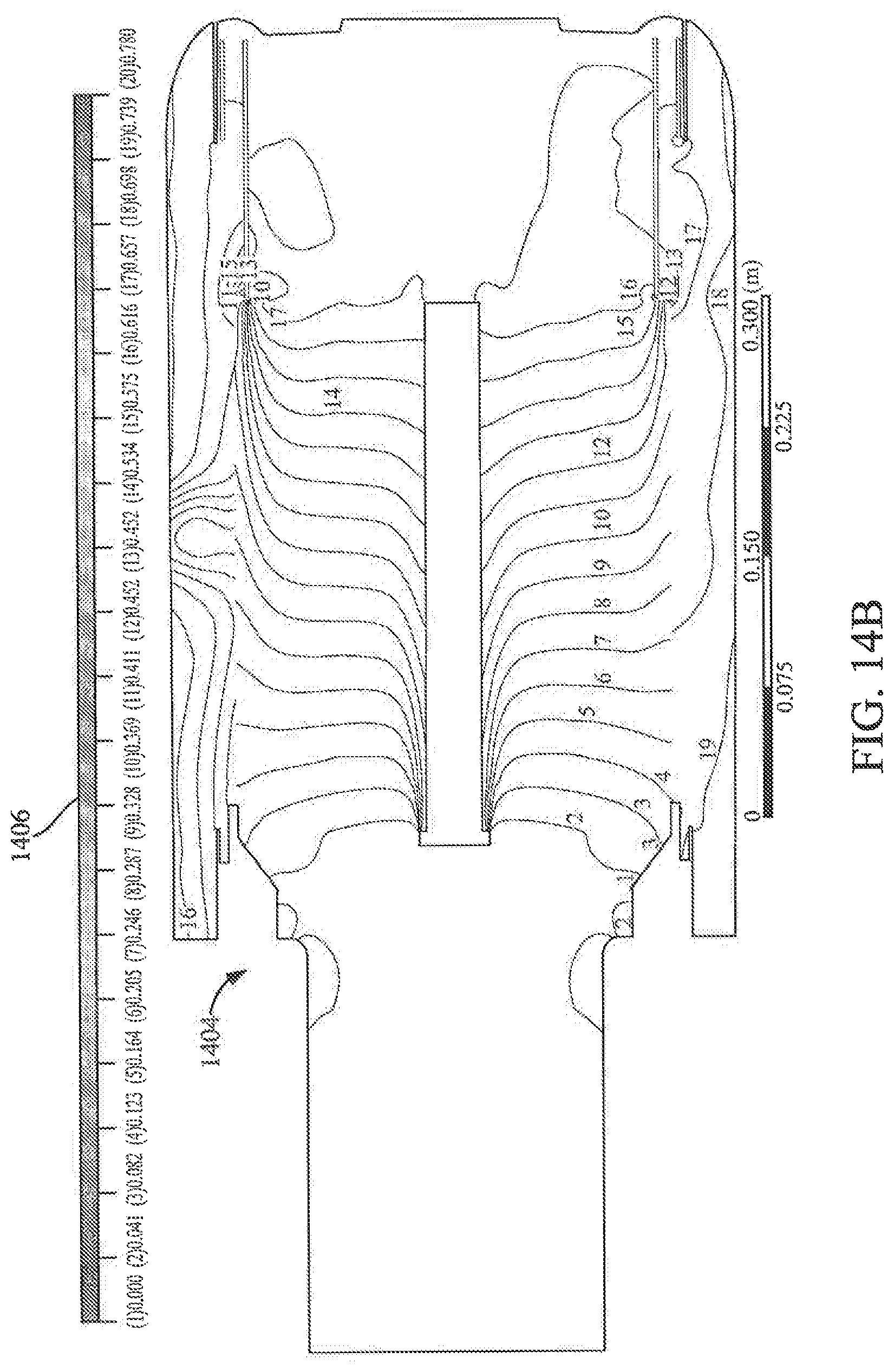[0035]Referring to FIGS. 14A and 14B, pressure contour analysis diagrams are shown comparing the operational air pressures of the first filtration system with the de-swirl vanes 304 (shown at 1404 in FIG. 14B) to the second filtration system without the de-swirl vanes 304 (shown at 1402 in FIG. 14A). A scale of non-dimensional pressures is shown at 1406. As shown in FIGS. 14A and 14B, the first filtration system with the de-swirl vanes 304 experiences a less drastic pressure drop at the inlet face of the filter element than the second filtration system.
