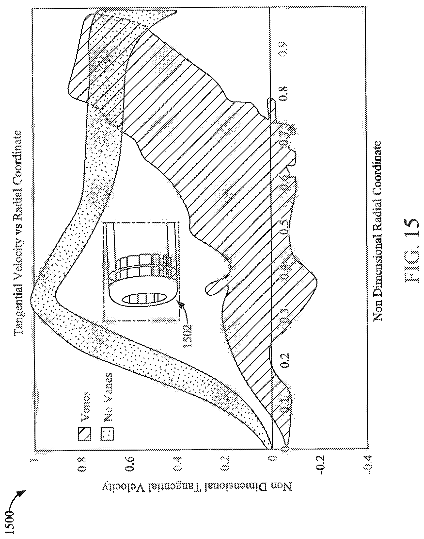 [0036]Referring to FIG. 15, a tangential velocity distribution 1500 taken at a plane midway between the filter element 112 inlet and housing 102 end wall is shown for the first filtration system (having the de-swirl vanes 304) and the second filtration system (without the de-swirl vanes 304). As shown in the tangential velocity distribution 1500, tangential velocity is reduced by the de-swirl vanes 304 of the first filtration system (i.e., the free-vortex core 1502) where non-dimensional V-tan approaches 1 is suppressed.