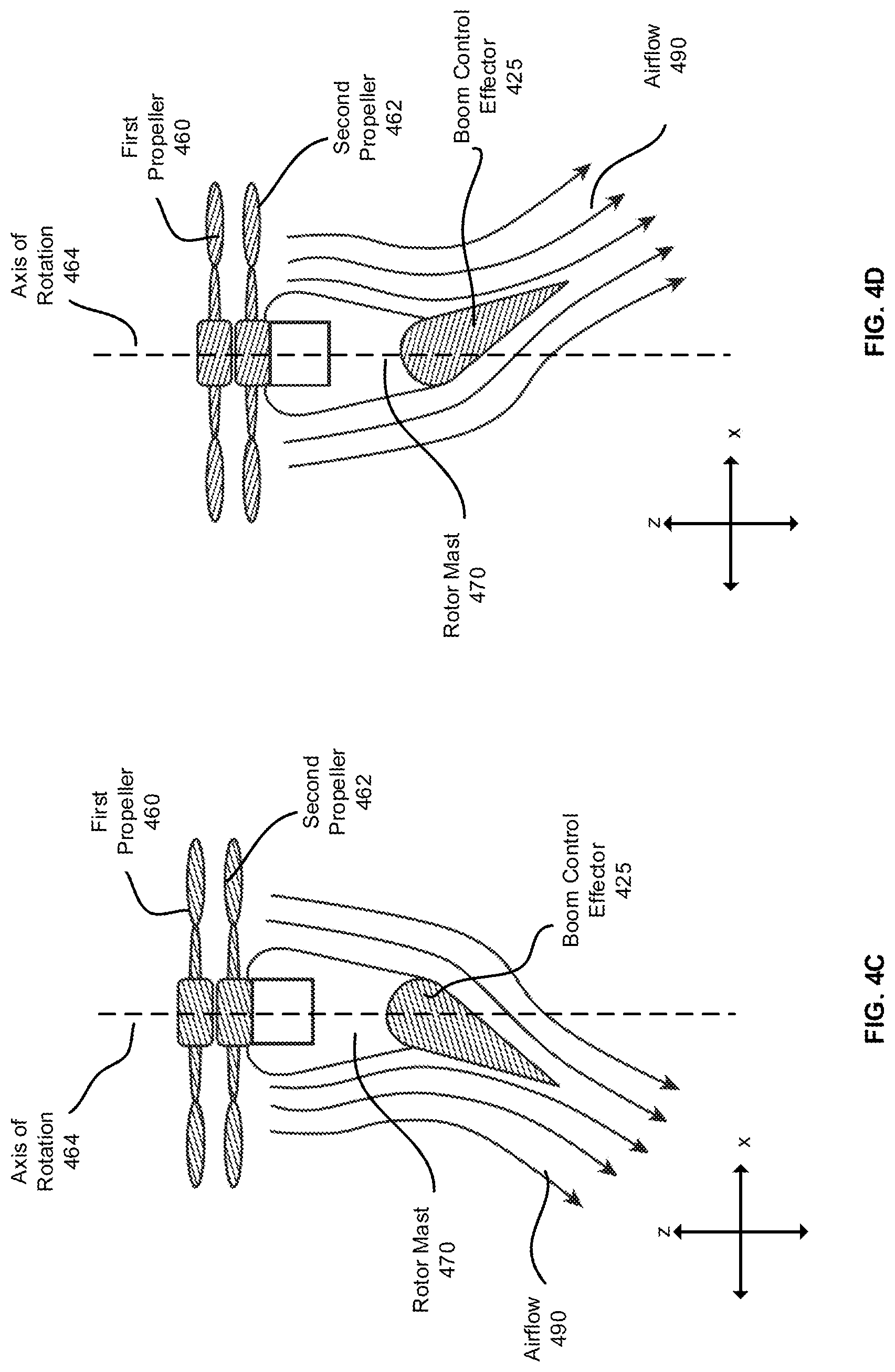 a fuselage; a front wing and a rear wing mounted to the fuselage, each wing having a port segment and a starboard segment extending outward and backward from the fuselage; a first inboard boom attached at a first point along the starboard segment of the front wing and attached at a second point along the starboard segment of the rear wing; a second inboard boom attached at a first point along the port segment of front wing and at a second point along the port segment of the rear wing; a set of propellers including a first propeller, a second propeller, and a third propeller, wherein the first propeller and the second propeller are coupled to the front wing and the third propeller is coupled to the rear wing; a tail extending from the rear of the fuselage, the tail arranged substantially orthogonal to the rear wing; a cruise propeller attached to the tail, the cruise propeller configured to rotate in a plane substantially perpendicular to a rotational plane of the set of propellers; a first wingtip boom coupled to a free end of the starboard segment of the rear wing; and a second wingtip boom coupled to a free end of the port segment of the rear wing, wherein one of the first wingtip boom or the second wingtip boom is configured as a resonator tuned to a frequency of the third propeller during a mode of operation. 2. The aircraft of 3. The aircraft of 4. The aircraft of 5. The aircraft of 6. The aircraft of 7. The aircraft of 8. The aircraft of 9. The aircraft of 10. The aircraft of 11. The aircraft of 12. The aircraft of 13. The aircraft of 14. The aircraft of 15. The aircraft of 16. The aircraft of 17. An aircraft comprising: