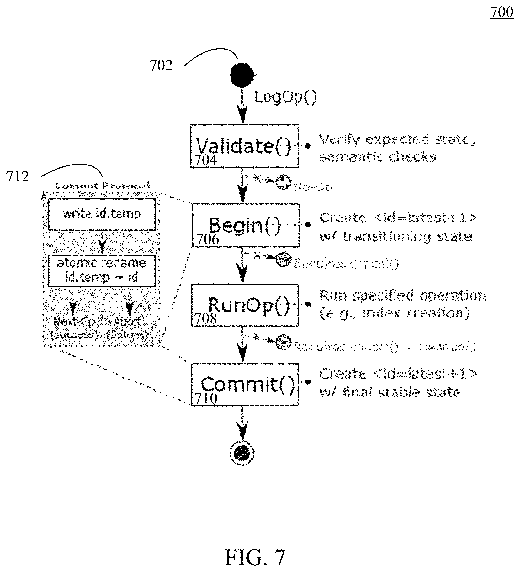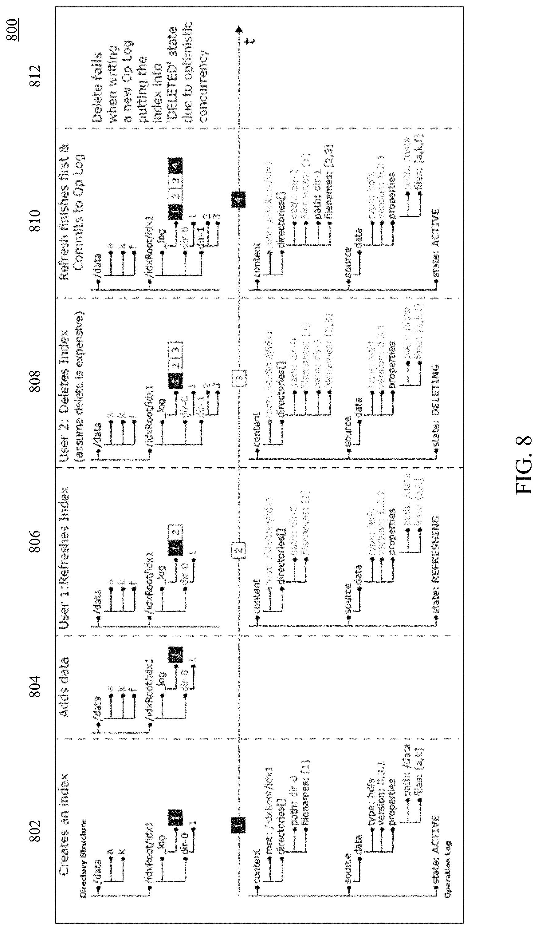 Having described the various APIs available in embodiments, discussion now turns to serverless index management enabled by the disclosed embodiments. As mentioned above, an advantage is a low-cost multiengine indexing subsystem that allows for concurrent index maintenance operations on an index that can be invoked by multiple engines. Although embodiments may be implemented with a server to mediate such operations, other embodiments described herein may simplify implementation by making index management “serverless” i.e., embodiments do not require a standalone server dedicated to index management tasks. The serverless functionality is achieved, in part, by storing all index information (e.g., metadata, operations on an index) in the data lake, and having that index track its own state through an index operation log incorporated into the index, and through other updates to its own metadata. Despite being serverless, embodiments enable concurrent updates through optimistic concurrency control (as described in further detail below). Further description of embodiments now turns to further description of one of these aspects: index metadata on the lake. Interoperability is complex, as every query engine has to agree on what constitutes an index, which may require agreement between developers (and organizations/companies) working in different silo-ed ecosystems. Because the latter problem is much harder in reality, embodiments described herein prioritize a low-friction configuration for exposing index-related metadata (e.g., contents, state etc.) in a way that allows for easy integration. Exposing the state of an index or the list of operations invoked on an index through traditional means, such as a catalog service or a transaction manager service, guarantees strong consistency. However, this approach has a few major operational implications. First, it brings in service dependencies and live-site support overheads. Second, it makes integration complex because now every new engine has to depend on a third-party service. Finally, it introduces operational costs of running the service. In consideration of these downsides, embodiments described herein trade-off metadata consistency for easier operational maintenance, i.e., the ground truth of information of an index is stored on the data lake. There are numerous ways of specifying the index information that need be stored. For example, Contents 504 may include the type and type-specific information of the derived dataset that is useful in instantiating appropriate index interpretation logic, such as name, kind, configuration (e.g., indexed and included columns plus their types), content (e.g., physical location and layout). Lineage 506 may include information used to track lineage of the derived dataset, e.g., HDFS data source being indexed, information needed to refresh the index with minimal information from the user, information needed to perform index/view selection, and descriptive history of an index. State 508 may include state information pertaining to the derived dataset, e.g., global information such as Active and Disabled, and transient information such as Creating and Deleted. Including the raw query plan information in rawPlan node 516 of covering index 502 offers a number of advantages. First, the raw query plan enables support for transparent index refreshes (e.g., by invoking the rebuild( )API described above in relation to Covering index 502 also includes a state node 518 which, as mentioned above, tracks the state of the index thereby enabling embodiments to be serverless. There are numerous ways of managing index state under a serverless paradigm. For example, Because embodiments are implemented in a serverless paradigm, there is of course no server to maintain or track index states. Accordingly, embodiments manage index states by according to the state transitions illustrated in index state machine 600 of Creating 602: Assuming no index exists, the state machine starts in state empty/DNE 616. When a user invokes the createindex( ) API as described above in conjunction with Active 612: Once the index is created successful, the index transitions to state active 612 and becomes visible (the index is not visible when it is in state creating 602). An index ordinarily spends most of its time in state active 612. Refreshing 608: An existing index may be refreshed/rebuilt via the indexRebuild( ) API described above. Although the terms refresh and rebuild are basically used interchangeably herein, the term “refresh” is often applied an incremental rebuild. Note, refreshing does not block index visibility—consumers of the index may continue to access the current active copy of the index until refreshing is finished. Deleting 606: A user can delete an index using the deleteIndex( ) API described above. During the delete operation, the index enters state deleting 606. As described above, a delete operation is a soft delete only (for the sake of speed) and has the effect of making the index invisible/unusable. Deleted 614: Upon completion of the deleteIndex( ) call, the index enters state deleted 614. Restoring 604: Because a delete is only a soft delete, a restoreIndex( ) command may restore the index at which point the index enters state restoring 604 and upon completion, the index again enters state active 612. Again, the index is not visible when it is in the Restoring state. Optimizing 610: A user can further choose to optimize the index via an optimizeindex( ) API. For example, one optimization is index compaction, where (small) index blocks generated incrementally are merged into larger ones to improve index read efficiency. In a multi-user scenario, clearly some index states conflict with one another (i.e., the index cannot take on certain states for different users at the same time). For example, if an index is in state deleting 606, refreshing 608, or optimizing 610 in one user session, the cannot be in state restoring