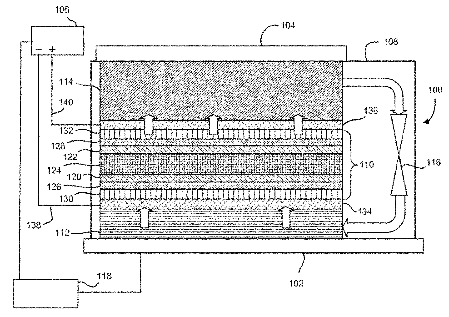 In any case, the electrochemically active component(s) is pumped across the membrane electrode assembly of the compressor 110. In particular, electrons are stripped from the component(s) at the anode collector 130, and the ions are transported across the anode 120, the electrolyte 124, and toward the cathode 122 due to the electrical potential applied across the collectors 130, 132 from the power supply 106. Next, the ions are recombined with the electrons at the cathode collector 132 to reform the gas at a higher pressure.