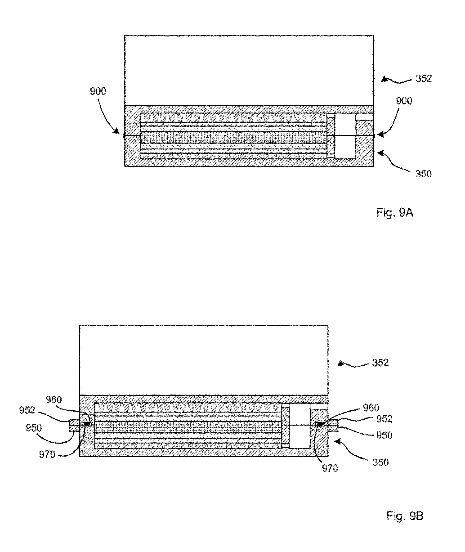 In some implementations, as shown in FIG. 9A, the housing portions 350, 352 are soldered or welded 900 around the perimeter of the interface 354 to provide the hermitic seal. In this implementation, it is also possible to subsequently saturate the interface 354 after it has been soldered or welded 900 with a suitable adhesive such as epoxy. In other implementations, as shown in FIG. 98, the housing portions 350, 352 are joined at aligned flanges 950, 952 using suitable connectors (such as bolts and nuts, not shown) and the hermetic seal is provided along an O-ring or a gasket 960 provided in a groove 970 around one or more of the housing portions 350, 352.