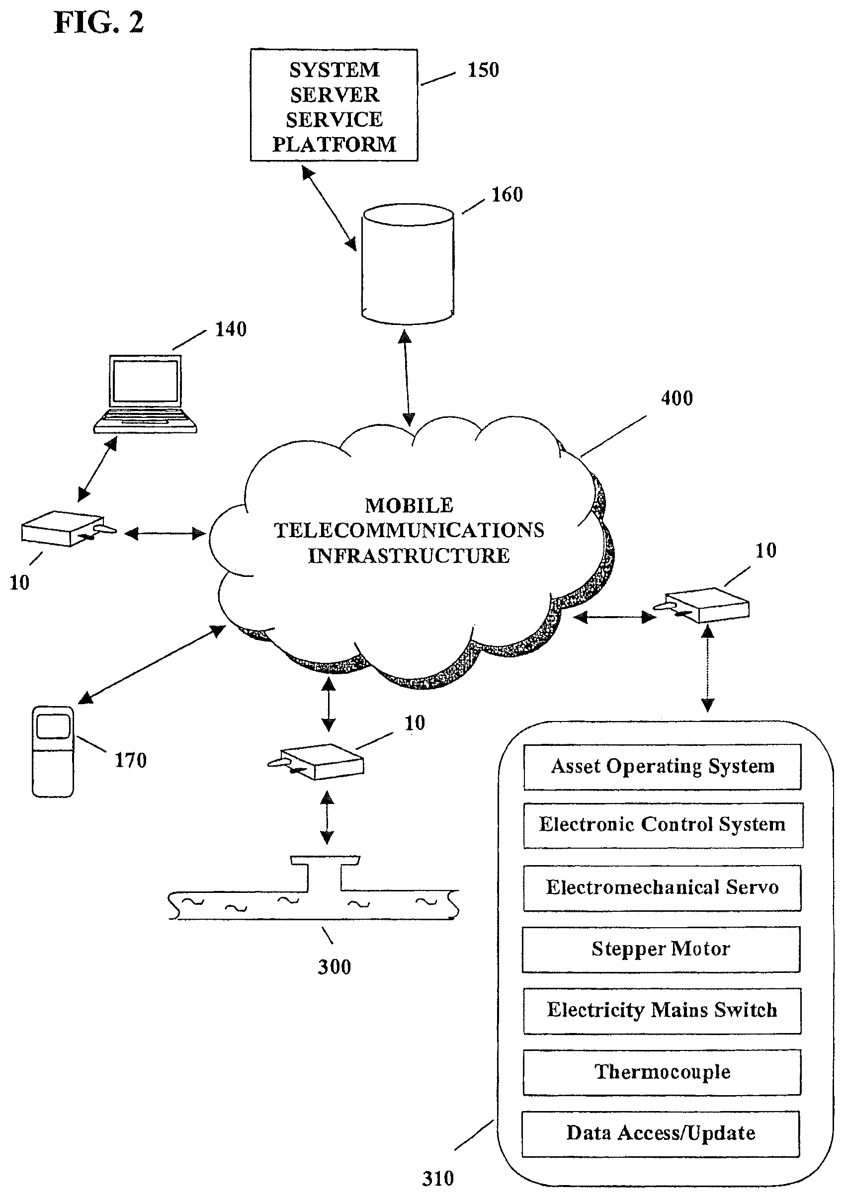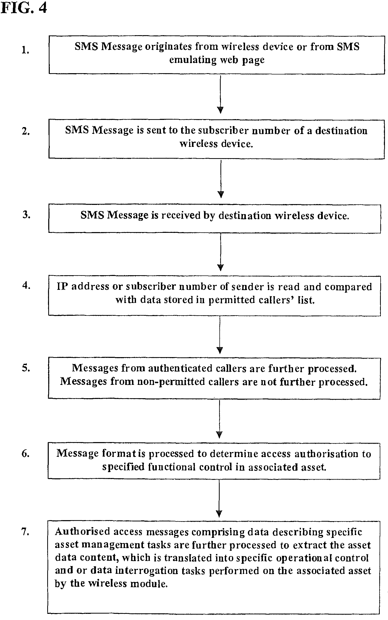 3. The message further comprises a data block which specifies the particular asset management tasks performed by the wireless module upon the associated asset such that data is read from or sent to a specific functional element within the associated asset via the port module (90) for the purpose of determining the status of that functional element or for effecting change in that functional element. The data processing means is fully programmed with the capability to communicate with each and every functional element within the associated asset. The specific data describing the operating system of the associated asset and data which relates to the method by which asset data is accessed and read by the wireless module (10), following authentication of the sender of the message and validation of the access authorisation, is stored in the memory module and is available to the data processing means (60). Consequently, each coded message comprises a predetermined format which is fully processed by the data processing means (60) with reference to the stored data in the memory module (70) and, in the case that the message is authenticated and authorised, the data component of the message is processed to access data from a specific memory location of the wireless module or associated asset and or to effect a specific change in the said wireless module or associated asset. In this way the data processing means (60) and the controlled access of information through the port module (90) are key to the system and method of the invention. With reference to the preceding description, it will be clear to those skilled in the art that the level of authentication and or authorisation will be directly related to the particular asset management application. In more general terms, the invention provides a solution for switching off devices remotely and rendering them inoperable, such as laptop computers and thereby preventing unauthorised access of stored data. In other situations, the operational characteristics of the asset, such as a car engine performance, can be monitored remotely, and provided to a vehicle service centre for analysis. Moreover, the same in-vehicle module can provide positional information, by way of an integrated Satellite Navigation Global Positioning System chipset, as well as affording the capability to lock down the vehicle control system when the vehicle is stationary. In other applications such as where a wireless module can be used to communicate with a server, or where a system server is connected to the mobile telecommunications infrastructure the same server based remote asset management system can provide consumer services such as the means to program solid-state digital video broadcasting DVB-T recorders. In such a service, for example, a consumer can register the make and model of their solid-state video broadcasting device and their interest in a certain type of television programme with the network-based server. At any time during the day, the consumer may receive a data message on a mobile phone or via E-mail indicating that a potentially interesting programme will be broadcast, and the request whether the network based server should communicate data instructions to the wireless module associated with the digital video recorder to record the broadcast. For example, the consumer need only reply with a simple message and the network-based server can proceed to compile and communicate the complex data message to the wireless module associated with the said recorder. In the area of remote facilities management, the remote asset management system provides a solution for an improved fire alarm and home security network for communicating directly with homeowners or directly with the emergency services in the case that there may be a fire at the location or when an unauthorised intruder has been detected. Furthermore, the same wireless local area network can be extended for the remote control of diverse consumer devices. A wireless telecommunications based fire alarm provides the means to achieve intelligent fire surveillance in areas where only radio network coverage is possible such as in remote areas where no fixed telecommunications infrastructure is present. In addition to the provision of network-based remote asset monitoring systems, the invention also provides a telecommunications solution for determining the location of sought assets as well as the authentication of assets, vehicles and persons. The invention may make use of the existing wireless telecommunications infrastructure such as that operating according to the GSM Telecoms standard or the WCDMA Telecoms standard as well as the pager network. The module-server architecture operates seamlessly and transparently with the existing wireless networks, thereby making the remote asset management service available wherever there is wireless network coverage. Furthermore, the invention may make use of the text message service provided by the wireless telecommunications networks such as the Short Message Service in GSM. In this way, asset management commands can be sent easily and efficiently between each wireless module associated with the asset and the network-based server. Moreover, the choice of SMS enables any person who is authorised to communicate with the asset, to communicate with the network server and or the asset wireless module from an SMS-enabled mobile phone, an SMS-enabled wireless PDA, or via an SMS-message despatch internet website. The Short Message Service (SMS), as defined within the GSM digital mobile telecommunications standard has several unique features: