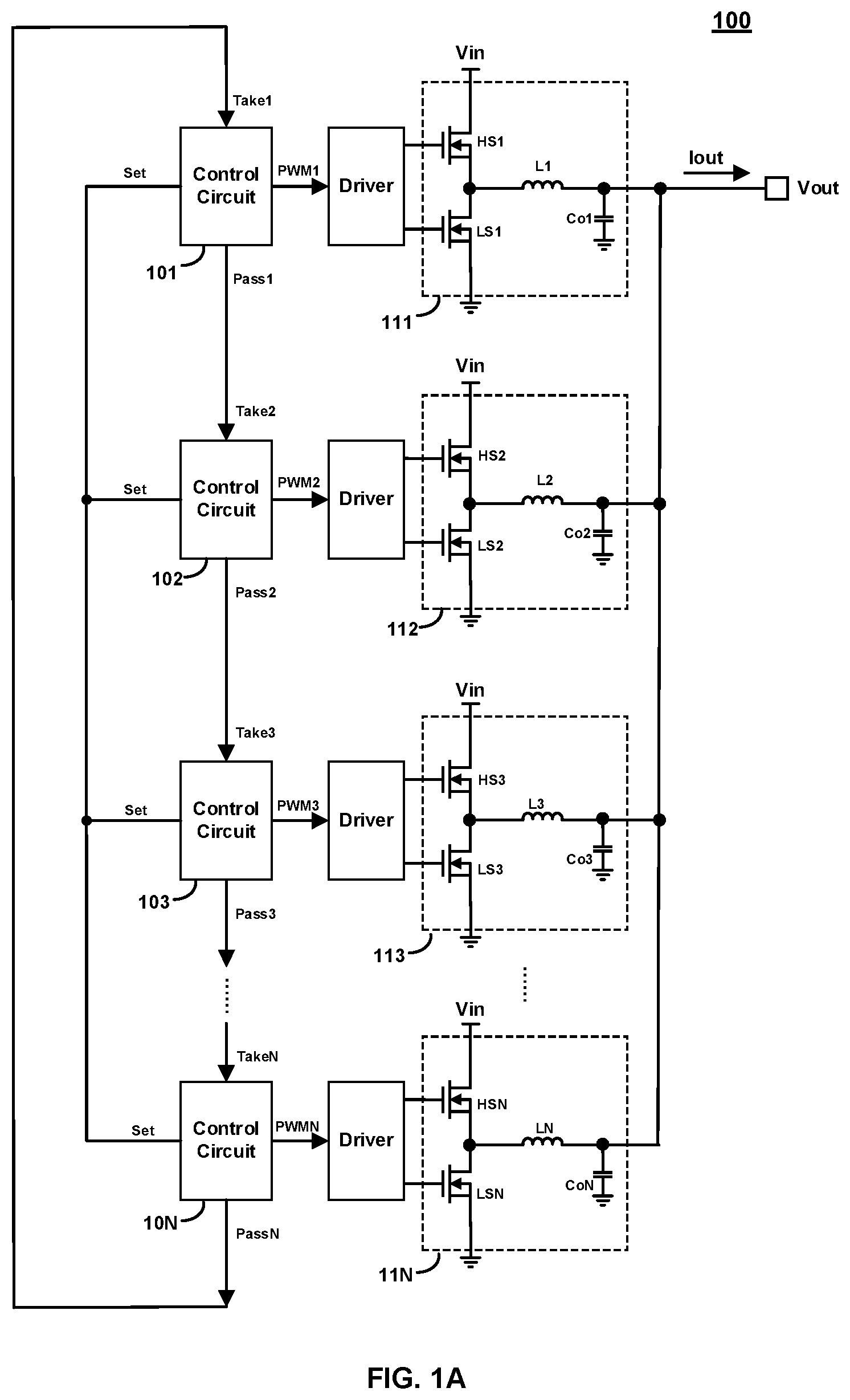 a first terminal configured to share a phase control signal; a second terminal configured to receive a phase input signal from a previous control circuit in the daisy chain; and a third terminal configured to provide a phase output signal to a latter control circuit in the daisy chain, wherein the phase output signal has a first pulse in normal operation; wherein the control circuit is configured to provide the phase control signal when it is configured as a master control circuit, and is configured to receive the phase control signal when it is configured as a slave control circuit; and wherein if the control circuit is configured as a master control circuit and a fault condition is detected in the control circuit, the control circuit will change into a slave control circuit and generate a second pulse on the phase output signal of the control circuit. 18. The control circuit of 19. The control circuit of 20. The control circuit of 21. The control circuit of 22. The control circuit of 23. The control circuit of 24. The control circuit of 25. The control circuit of a master control unit configured to generate the phase control signal; a fault detection configured to detect whether there exists a fault condition in the control circuit, and generate a fault detection signal; a master slave determination circuit configured to determine whether the control circuit is configured as a master control circuit or a slave control circuit, and generate a master slave determination signal to control the master control unit; and a switch control circuit coupled to the fault detection circuit and the master slave determination circuit, and configured to generate the phase output signal and a switch control signal for controlling a corresponding one of the plurality of switching circuits, based on the phase control signal, phase input signal, fault detection signal and master slave determination signal.