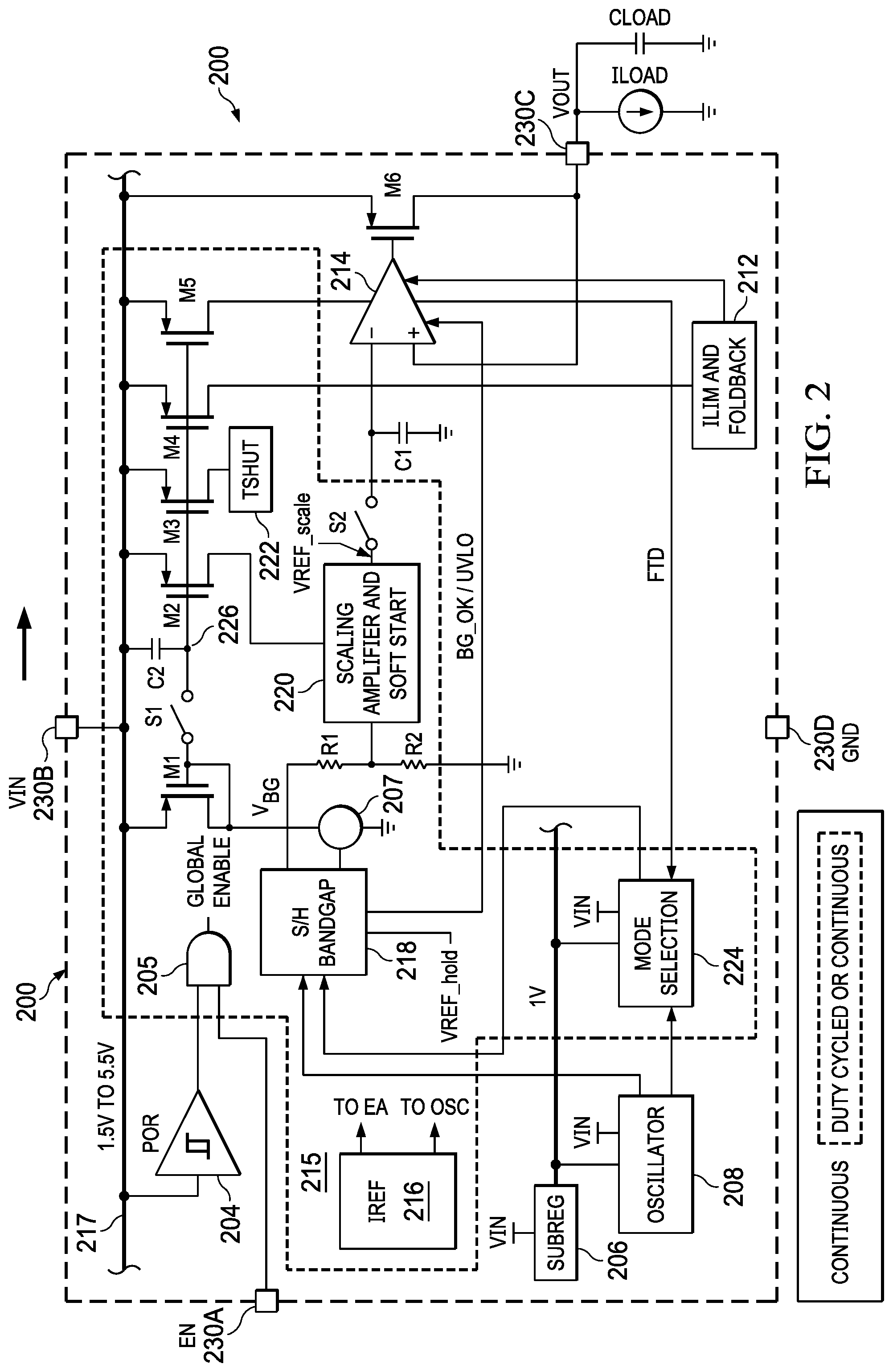 In Table 1, three difference modes are used, a low power (duty cycle) mode is used for Iload values below 300 uA. For Iloads between 300 uA and 10 mA, a medium power mode with a continuous reference is used. For Iloads greater than 10 mA, a high power mode with a continuous reference is used.