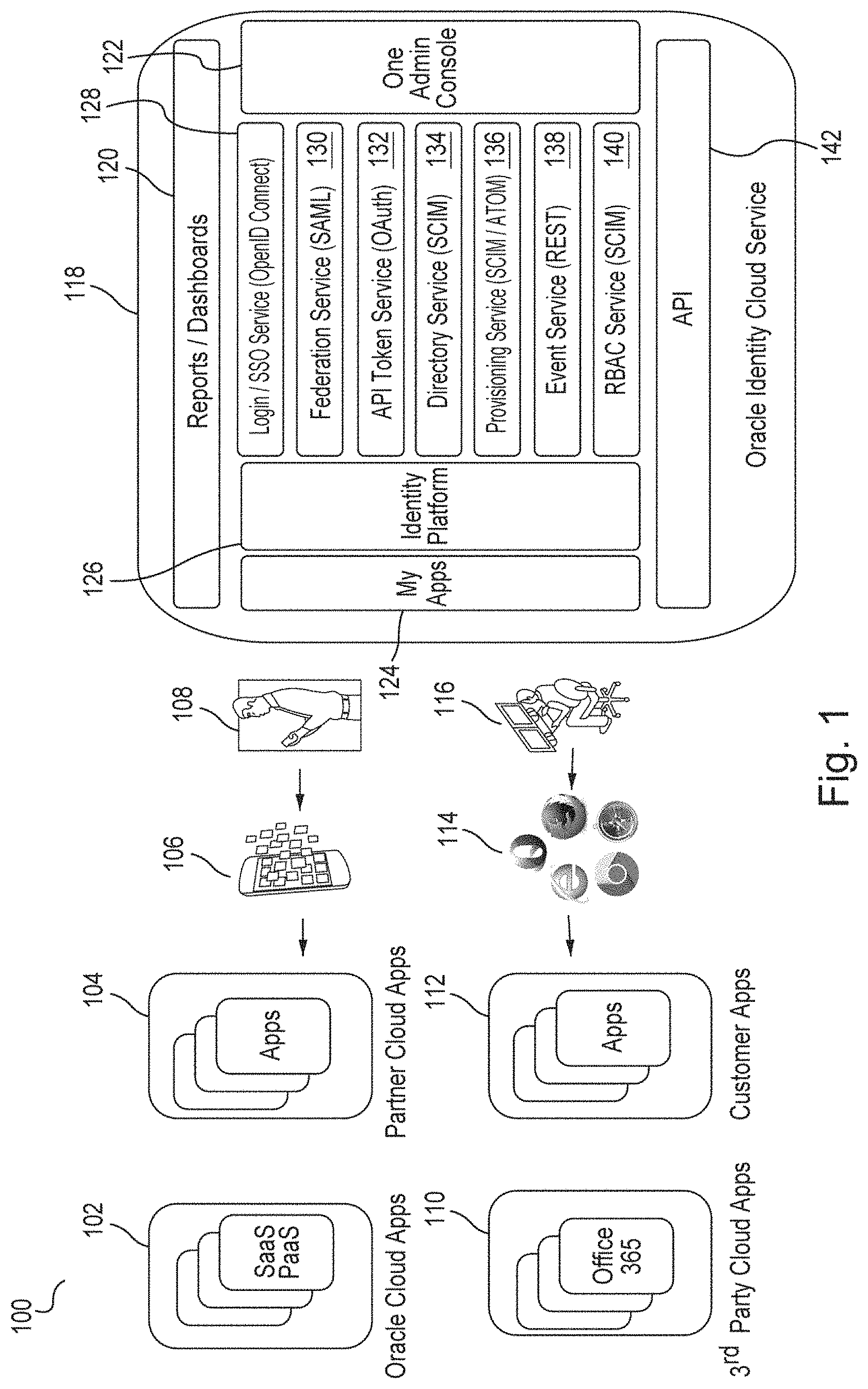When striping every table to configure different columns in a same database for different tenants, one table may include all tenants' data mixed together. In contrast, one embodiment provides a tenant-driven data tier. The embodiment does not stripe the same database for different tenants, but instead provides a different physical database per tenant. For example, multi-tenancy may be implemented by using a pluggable database (e.g., Oracle Database 12c from Oracle Corp.) where each tenant is allocated a separate partition. At the data tier, a resource manager processes the request and then asks for the data source for the request (separate from metadata). The embodiment performs runtime switch to a respective data source/store per request. By isolating each tenant's data from the other tenants, the embodiment provides improved data security. In one embodiment, various tokens codify different tenancies. A URL token may identify the tenancy of the application that requests a service. An identity token may codify the identity of a user that is to be authenticated. An access token may identify multiple tenancies. For example, an access token may codify the tenancy that is the target of such access (e.g., an application tenancy) as well as the user tenancy of the user that is given access. A client assertion token may identify a client ID and the client tenancy. A user-assertion token may identify the user and the user tenancy. In one embodiment, an identity token includes at least a claim indicating the user tenant name (i.e., where the user lives). In one embodiment, an access token includes at least a claim indicating the resource tenant name at the time the request for the access token was made (e.g., the customer), a claim indicating the user tenant name, a claim indicating the name of the OAuth client making the request, and a claim indicating the client tenant name. In one embodiment, an access token may be implemented according to the following JSON functionality: In one embodiment, a client assertion token includes at least a claim indicating the client tenant name, and a claim indicating the name of the OAuth client making the request. The tokens and/or multiple tenancies described herein may be implemented in any multi-tenant cloud-based service other than IDCS. For example, the tokens and/or multiple tenancies described herein may be implemented in SaaS or Enterprise Resource Planning (“ERP”) services. In the embodiment of In the embodiment of By enforcing security both for outside access to IDCS and within IDCS, customers of IDCS can be provided with outstanding security compliance for the applications they run. In the embodiment of In the IDCS cloud environment, applications communicate by making network calls. The network call may be based on an applicable network protocol such as HTTP, Transmission Control Protocol (“TCP”), User Datagram Protocol (“UDP”), etc. For example, an application “X” may communicate with an application “Y” based on HTTP by exposing application “Y” as an HTTP Uniform Resource Locator (“URL”). In one embodiment, “Y” is an IDCS microservice that exposes a number of resources each corresponding to a capability. When “X” (e.g., another IDCS microservice) needs to call “Y”, it constructs a URL that includes “Y” and the resource/capability that needs to be invoked (e.g., https:/host/Y/resource), and makes a corresponding REST call which goes through web routing tier 912 and gets directed to “Y”. In one embodiment, a caller outside the IDCS may not need to know where “Y” is, but web routing tier 912 needs to know where application “Y” is running. In one embodiment, IDCS implements discovery functionality (implemented by an API of OAuth service) to determine where each application is running so that there is no need for the availability of static routing information. In one embodiment, an enterprise manager (“EM”) 922 provides a “single pane of glass” that extends on-premise and cloud-based management to IDCS. In one embodiment, a “Chef” server 924 which is a configuration management tool from Chef Software, Inc., provides configuration management functionality for various IDCS tiers. In one embodiment, a service deployment infrastructure and/or a persistent stored module 928 may send OAuth2 HTTP messages to IDCS web routing tier 912 for tenant lifecycle management operations, public cloud lifecycle management operations, or other operations. In one embodiment, IDCS infrastructure services tier 916 may send ID/password HTTP messages to a public cloud notification service 930 or a public cloud storage service 932. Cloud Access Control—SSO One embodiment supports lightweight cloud standards for implementing a cloud scale SSO service. Examples of lightweight cloud standards are HTTP, REST, and any standard that provides access through a browser (since a web browser is lightweight). On the contrary, SOAP is an example of a heavy cloud standard which requires more management, configuration, and tooling to build a client with. The embodiment uses OpenID Connect semantics for applications to request user authentication against IDCS. The embodiment uses lightweight HTTP cookie-based user session tracking to track user's active sessions at IDCS without statefull server-side session support. The embodiment uses JWT-based identity tokens for applications to use in mapping an authenticated identity back to their own local session. The embodiment supports integration with federated identity management systems, and exposes SAML IDP support for enterprise deployments to request user authentication against IDCS. The example embodiment of Generally, an Identity Metasystem is an interoperable architecture for digital identity, allowing for employing a collection of digital identities based on multiple underlying technologies, implementations, and providers. LDAP, SAML, and OAuth are examples of different secur