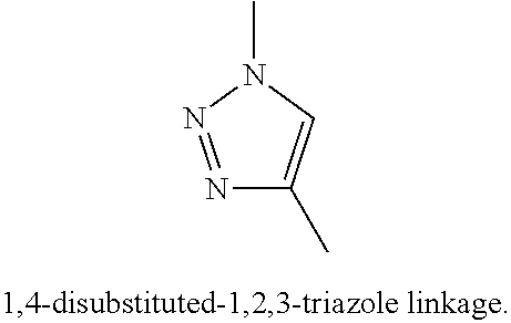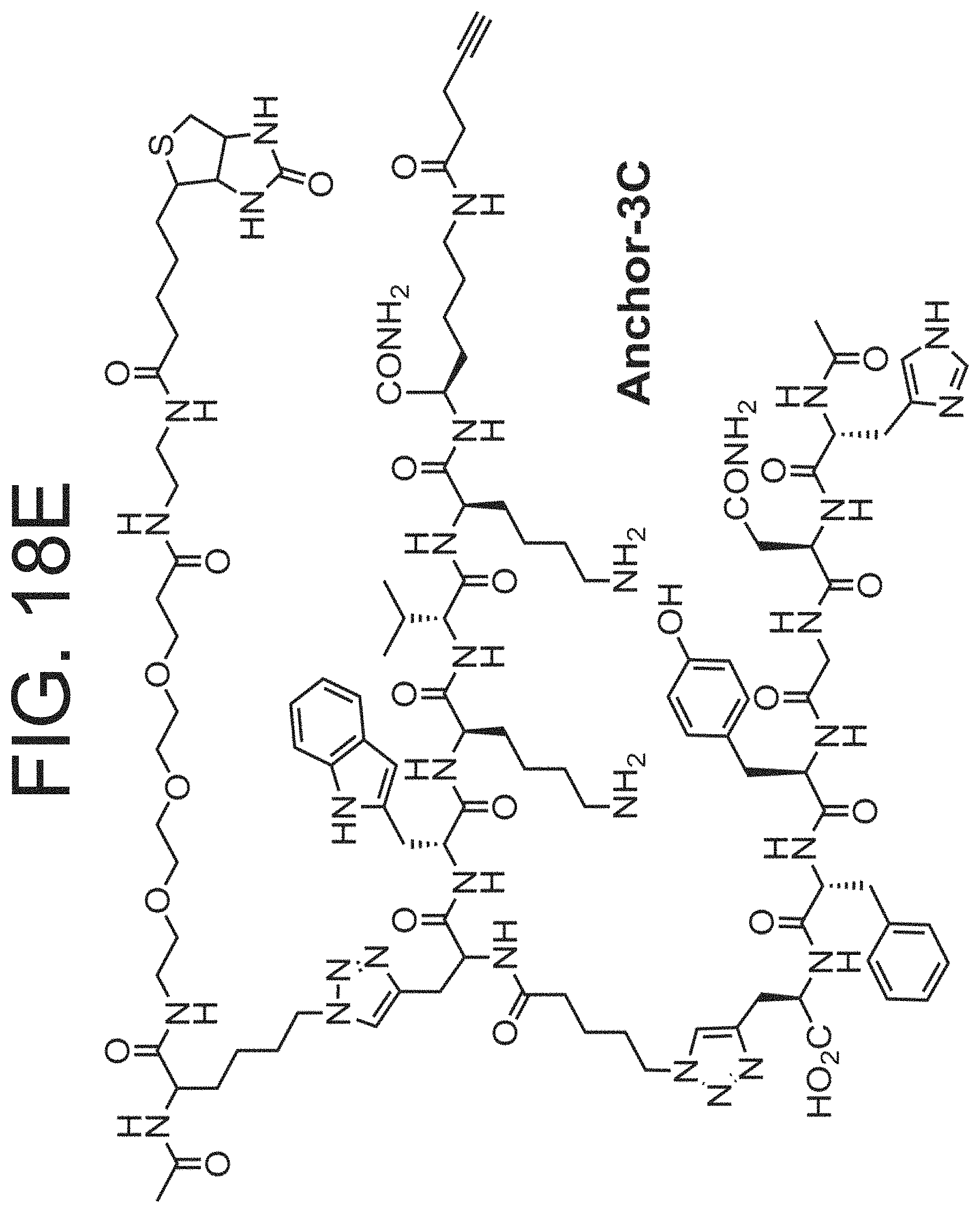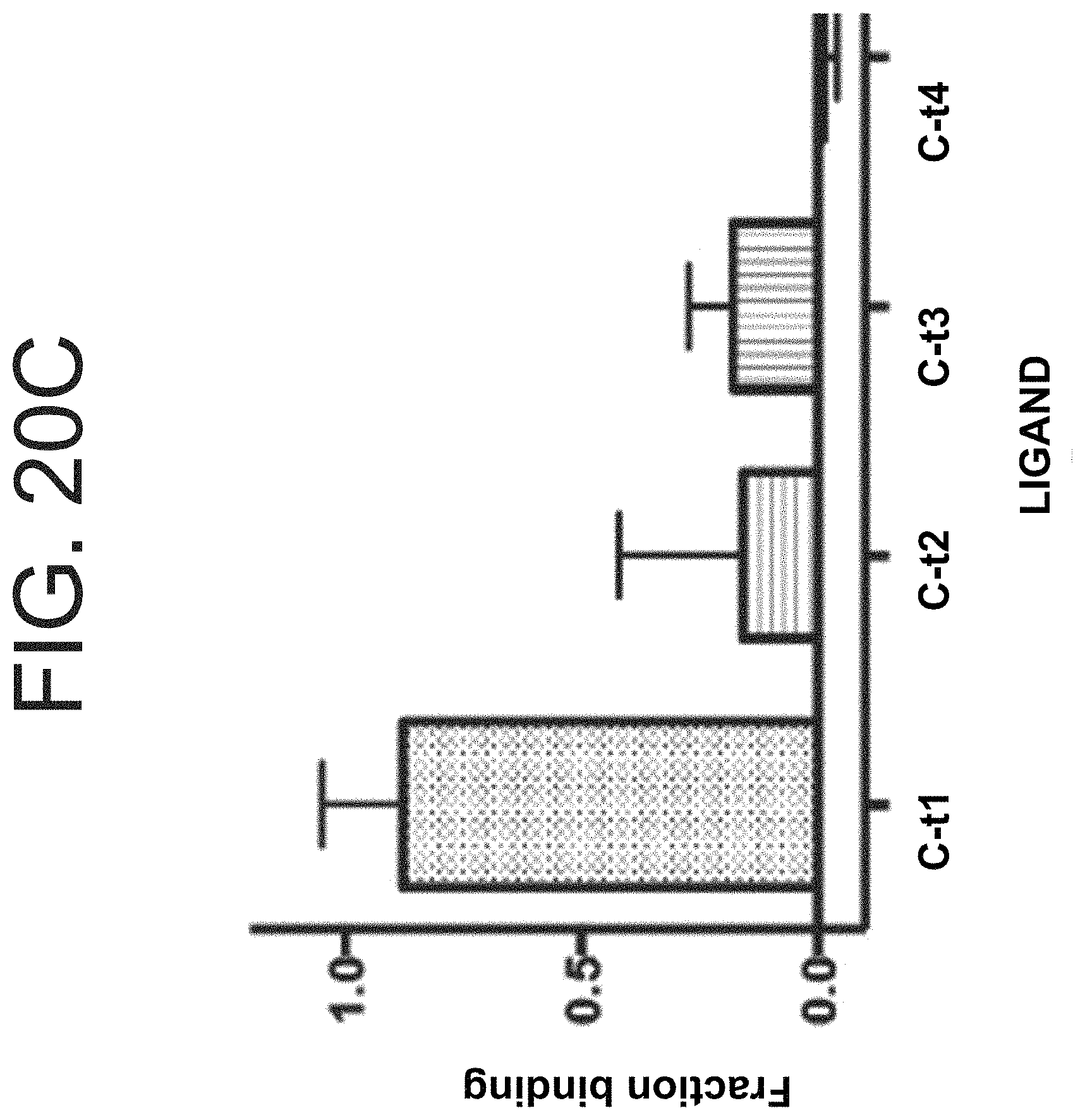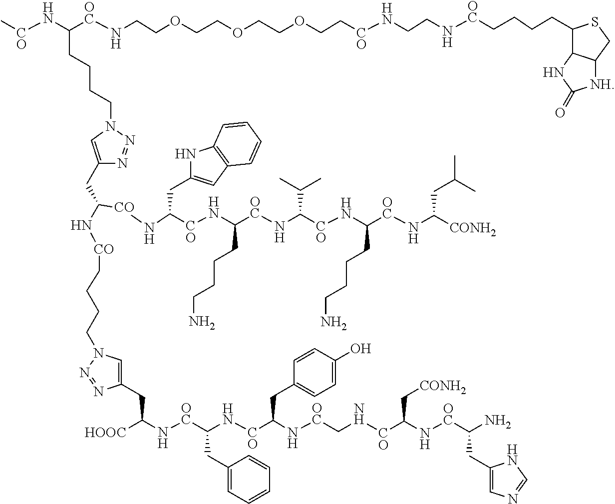 OBOC peptide libraries used in screens. Unique Fraction Formula Components sequences Screened Library A: D- SEQ ID NO:32 X = 18 D amino acids 1,889,568 40% for 1 ligand screen Pra-XXXXX- except D-Met and D- 80% for 3 ligand screen for N- 10% M-TG Cys tL Library B: SEQ ID NO:33 X = 18 D amino acids 1,889,568 40% for 2 ligands XXXXX-D- except D-Met and D- Pra-10% M-TG Cys Library C: L- SEQ ID NO:34 X = 18 D amino acids 1,889,568 80% for 3 ligand screen for C- Az4-XXXXX- except D-Met and D- tL 10% M-TG Cys Example 5.2: Screen for Bi-L