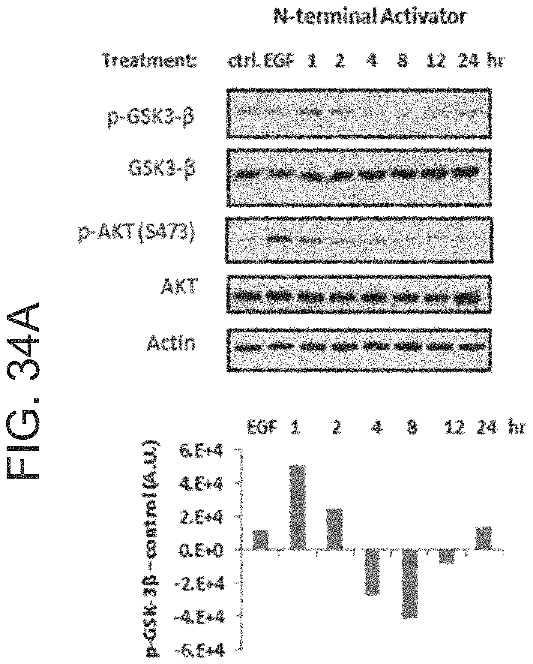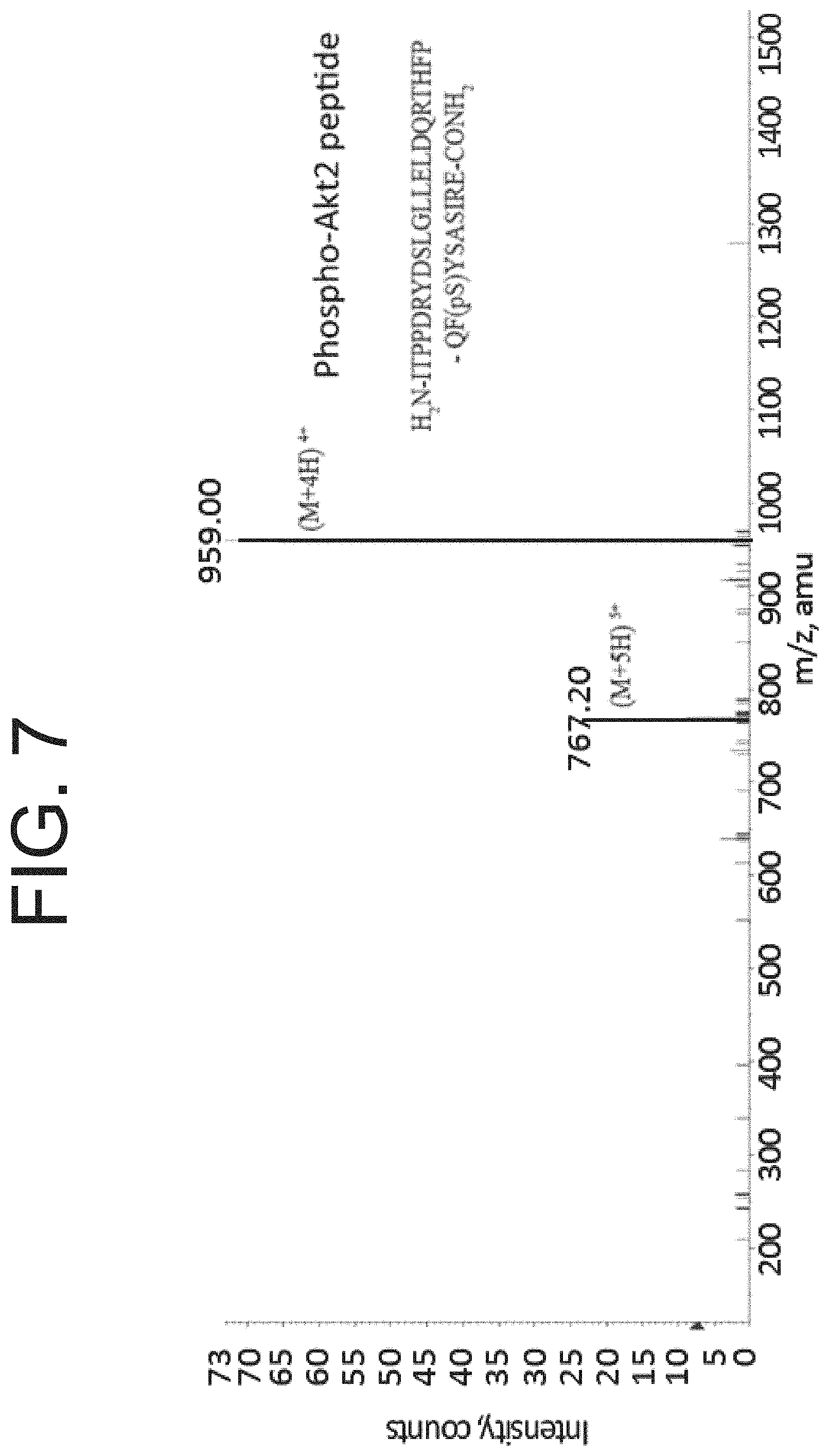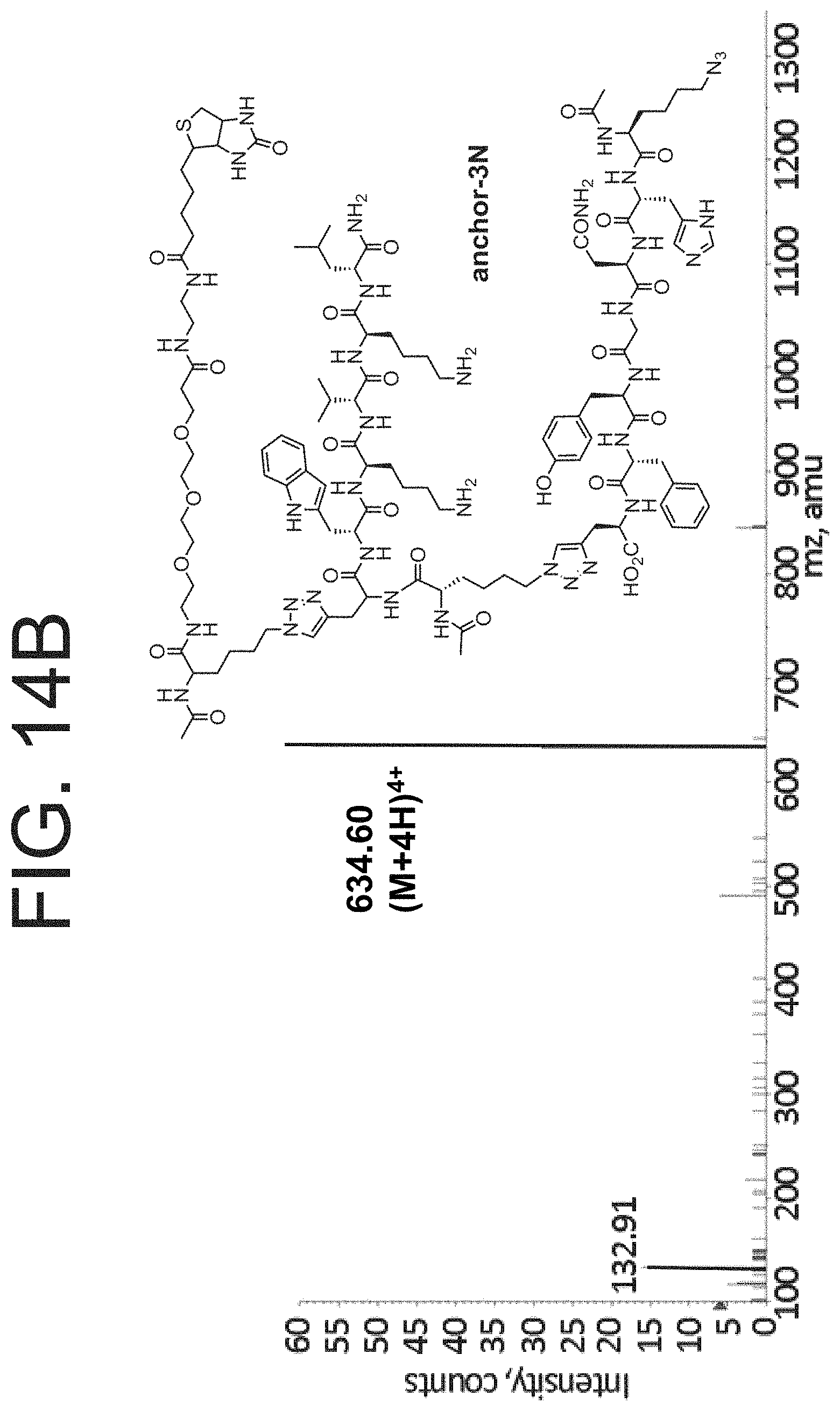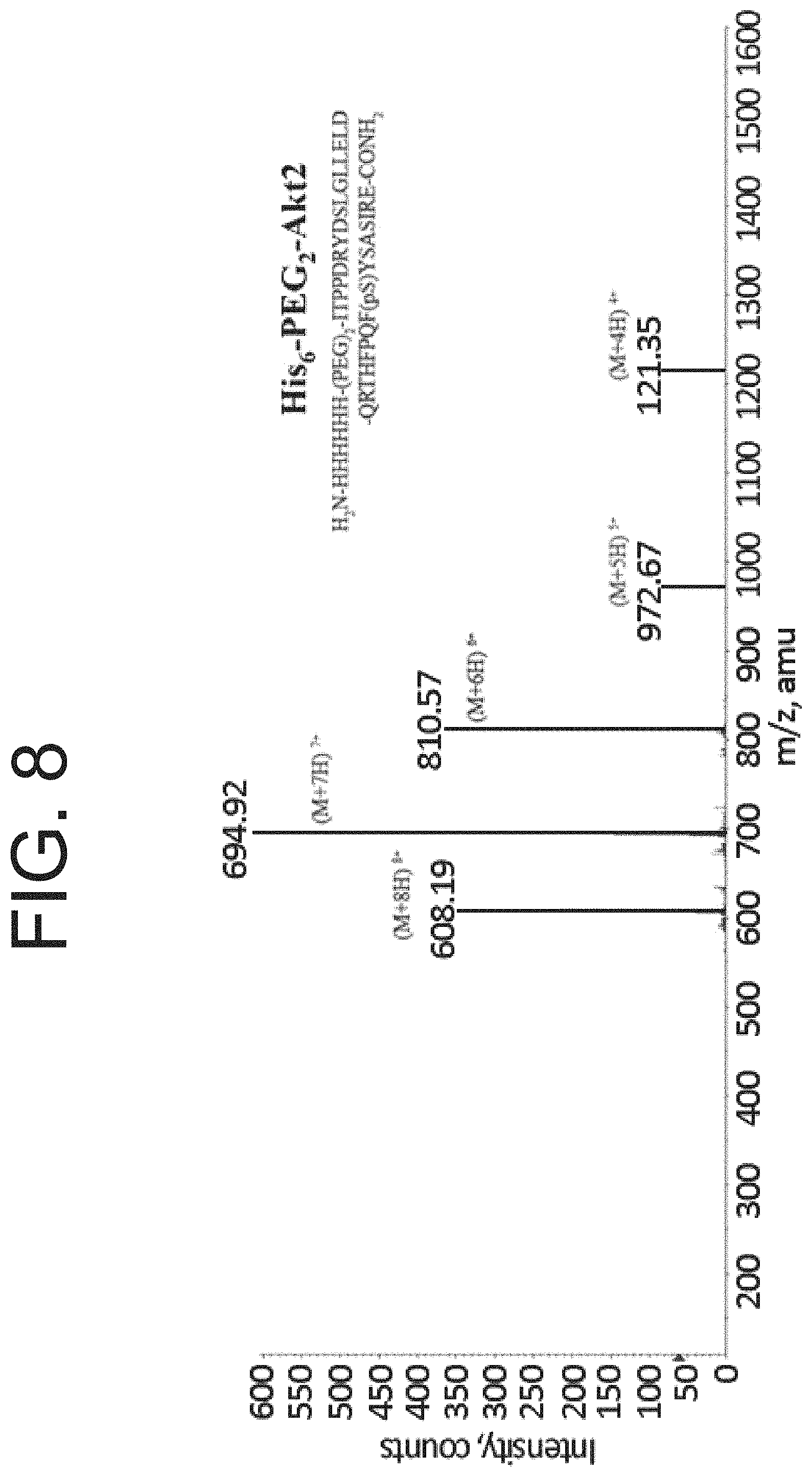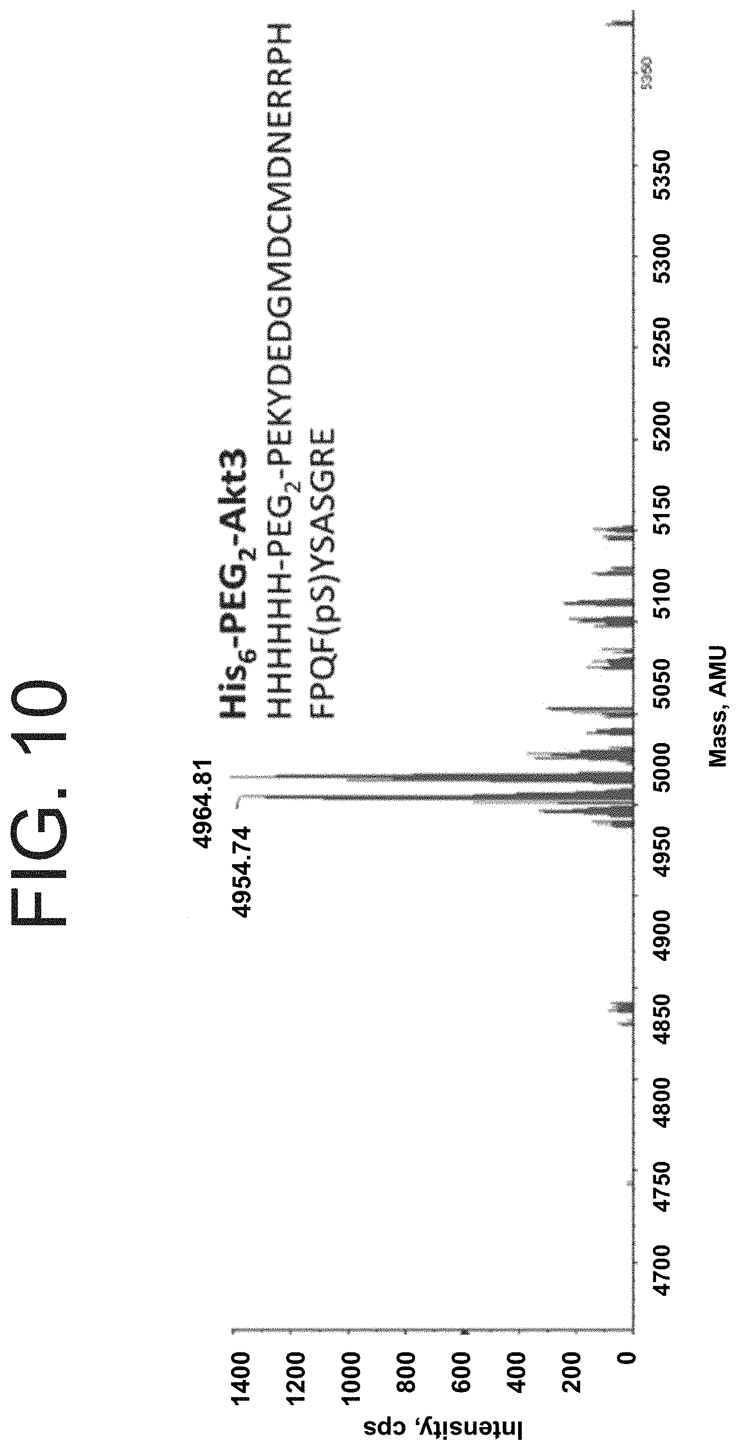In certain embodiments, one or more of the above steps may be omitted. For example, in certain embodiments a known anchor ligand is used. In these embodiments, step (a) is omitted, and the known anchor ligand is used to identify the secondary ligand in step (b). In those embodiments where the target protein is Akt, the anchor ligand may comprise the peptide sequence corresponding to the 32 amino acid long C-terminal polypeptide fragment of Akt2 (amino acids 450-481) that contains a phosphorylated serine 474 residue (pS474). In certain embodiments, this anchor ligand may be modified with an N- or C-terminal biotin prior to step (b). In certain embodiments, steps (b)(ii) to (b)(vi) are repeated one time, resulting in production of a capture agent triligand. In certain embodiments, the first, second, and any additional pluralities of candidate peptides comprise a “one bead one compound” (OBOC) peptide library, wherein the peptides comprise 5 to 7 D-amino acid residues and coupled with a D-propargylglycine at the N-terminus. In certain embodiments, the pluralities of candidate peptides may be different. In other embodiments, one or more of the pluralities may contain the same peptide pool. In certain embodiments, the secondary ligand is covalently bound to the anchor ligand, and the tertiary ligand is covalently bound to the secondary ligand. In another embodiment, the secondary and tertiary ligands are covalently bound to the anchor ligand. In certain embodiments, the methods provided herein utilize a known peptide target. In a particular embodiment, the peptide target comprises the sequence ITPPDRYDSLGLLELDQRTHFPQF(pS)YSASIRE (SEQ ID NO:15). In a particular embodiment, the peptide target comprises the sequence HFPQF(pS)YSASIRE (SEQ ID NO:26). In certain embodiments, the anchor ligand used for the screening process may be modified with a biotin. For example, the anchor ligand used for the screening process may be Biotin-PEG5-LIGAND-Pra. In one embodiment, the screening/preparation process comprises the following steps: