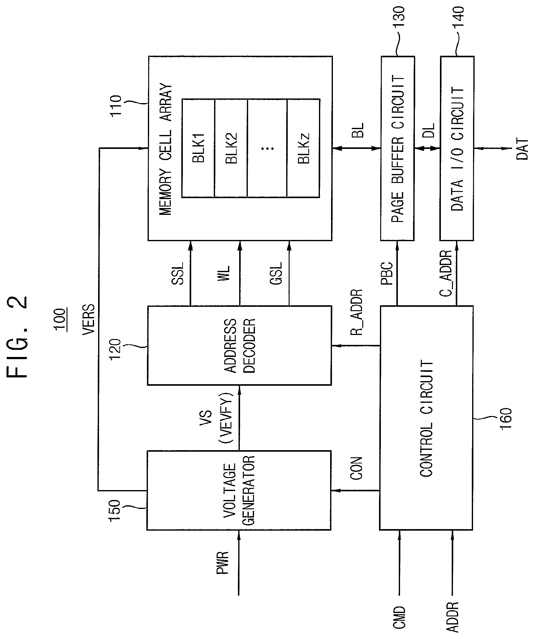 Referring to FIG. 25, a nonvolatile memory device or a memory device 2000 may have a chip-to-chip (C2C) structure. The C2C structure may refer to a structure formed by manufacturing an upper chip including a memory cell region or a cell region CELL on a first wafer, manufacturing a lower chip including a peripheral circuit region PERI on a second wafer, separate from the first wafer, and then bonding the upper chip and the lower chip to each other. Here, the bonding process may include a method of electrically connecting a bonding metal formed on an uppermost metal layer of the upper chip and a bonding metal formed on an uppermost metal layer of the lower chip. For example, when the bonding metals may include copper (Cu) using a Cu-to-Cu bonding. The example embodiment, however, may not be limited thereto. For example, the bonding metals may also be formed of aluminum (Al) or tungsten (W).