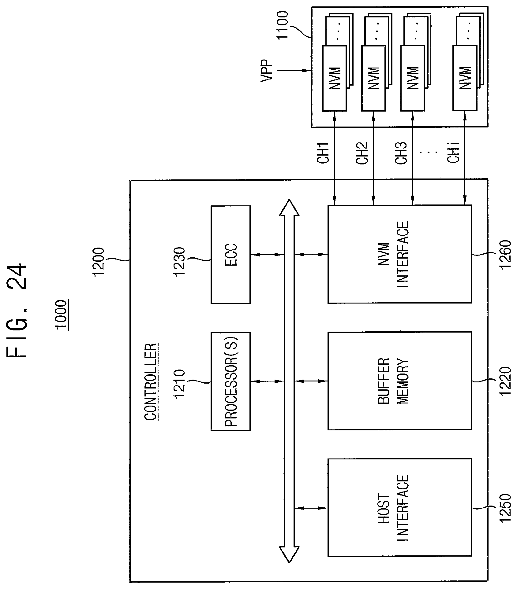 Referring to FIG. 24, a storage device 1000 may include a plurality of nonvolatile memory devices 1100 and a controller 1200. For example, the storage device 1000 may be any storage device such as an embedded multimedia card (eMMC), a universal flash storage (UFS), a solid state disc or solid state drive (SSD), etc.
