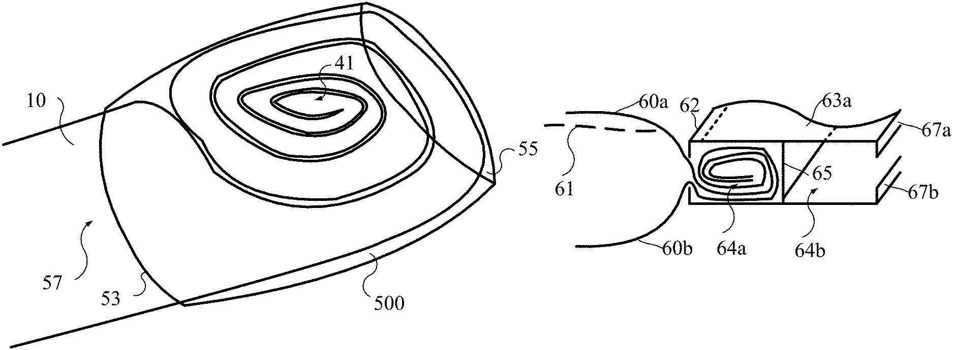 [0078]A second cavity 64b is shown for ease of explanation and includes features similar to the first cavity 64a. The second cavity 64b may also receive a rolled end of a tube in a way similar to that of the first cavity 64a as explained above. The cavities 64a, 64b may be separated by an inner wall 65 of the connector 63. In embodiments where only a single cavity (e.g., first cavity 64a) is needed, the inner wall 65 of the connector 65 may remain to maintain the first cavity 64a. As shown, a cavity 64, and specifically referring to second cavity 64b as a reference, includes an upper retaining lip 67a and a lower retaining lip 67b. Other embodiments may include only a single retaining lip 67 per cavity 64. A retaining lip 67 secures the rolled end of a tube within a cavity 64 to prevent removal of the rolled end when pulled upon in a direction away from the connector 63. Further, when the tube is filled, a side 60 of the tube expands against a retaining lip 67 and the rolled portion expands within the cavity 64 against the retaining lip 67 and walls (e.g., 65) within the cavity to prevent the rolled end of the tube from being removed, and thus also sealing the end of the tube within the cavity 64 to prevent the release of fluid 61 within the tube.
