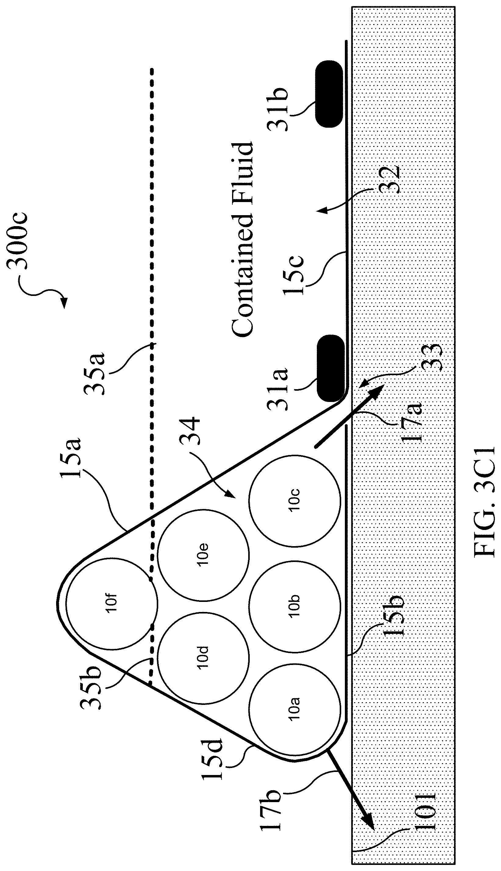[0056]As shown in FIG. 3C1, a seepage gap 33 may exist between the portion 15b of the vapor barrier extending from the front base of the dike section 300c under tube 10c to the rear base and the portions 15a,15c of the vapor barrier extending down the front face to the front base and into the containment area. As the level 35a of the contained fluid 32 rises within the containment area, contained fluid may seep into the ground 101 beyond the portion 15c of vapor barrier extending into the containment area. In turn, the contained fluid may seep up from the ground 101 through the gap 33 and into the interior 34 of the vapor barrier wrapping the tubes 10. Additionally, the contained fluid may seep into the interior 34 at overlapping sections of vapor barrier 15 along the dike section 300c or via punctures that may occur in the extended portion 15c of the vapor barrier in the containment area and/or portion 15a of the vapor barrier extending down the front face.