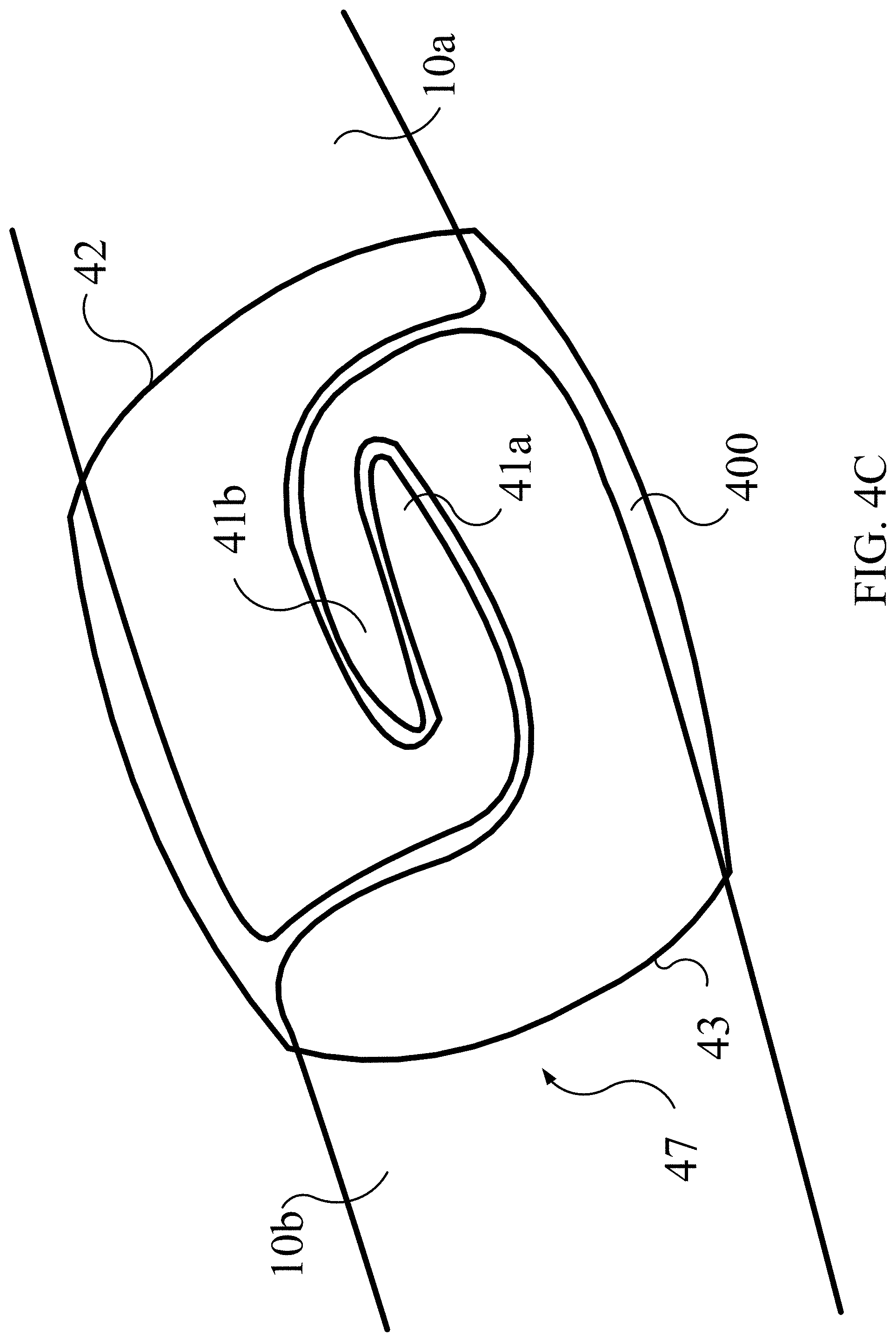 [0064]FIG. 4A, FIG. 4B, and FIG. 4C are diagrams illustrating an integrated vapor barrier 400 of a flexible containment tube 10 according to example embodiments. As shown in FIG. 4A, a tube 10 comprises an integrated vapor barrier 400 disposed proximate to an end 41 of is flexible body. Straps, anchors, and/or additional vapor barrier as described previously may work in conjunction with the integrated vapor barriers to hold abutting tubes together to form dike sections from abutted tubes of any length.