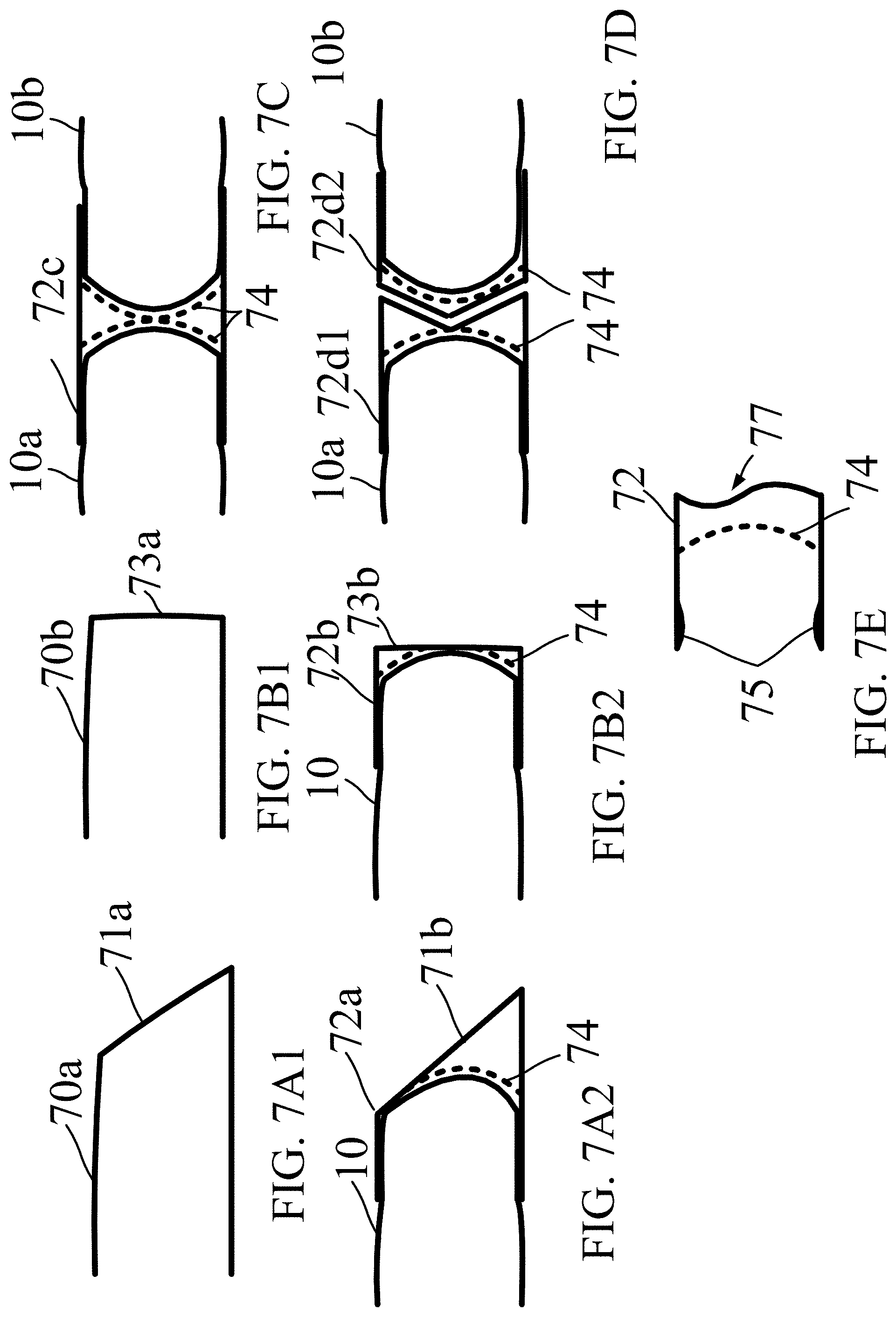 [0085]Referring to FIG. 7A2 as another example, tube abutment 72a includes a slanted end 71b. The slanted end 71b enables abutment in configurations similar to that of the tube 70a in FIG. 7A1 constructed with a slanted tube end 71a. Additionally, the tube abutment 72a may include a cavity for inserting a flexible containment tube 10 with a round end (or other shaped end). Thus, when filled, the tube 10 may expand against the walls of the cavity of the tube abutment 72a. In one embodiment, the cavity is shaped 74 to conform to the round end of the tube 10. Other embodiments of a tube abutment 72a may include a cavity shaped 74 to conform to other tube end types such as 71a, and 73b, of FIG. 7A1 and FIG. 7B1, respectively.