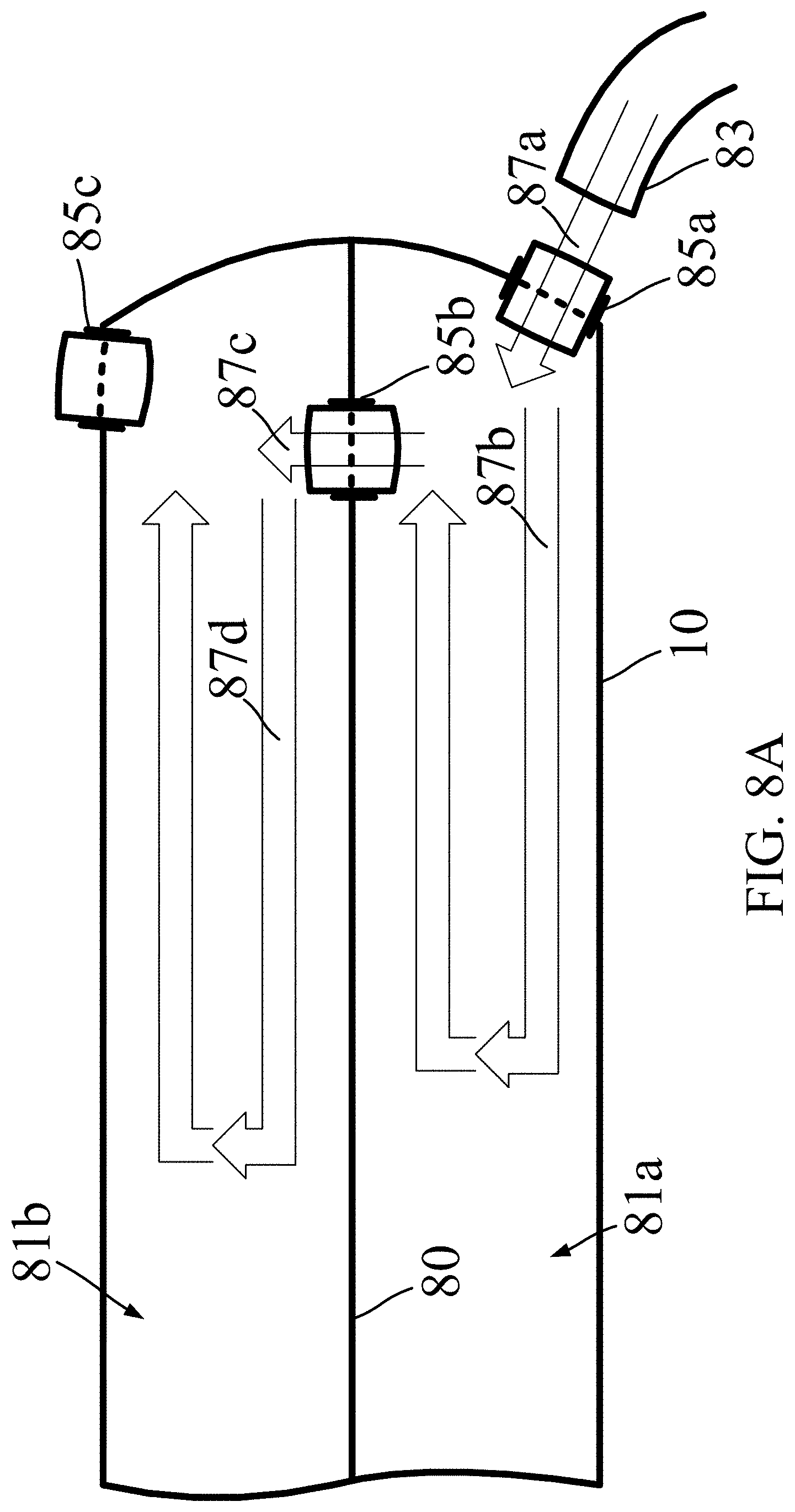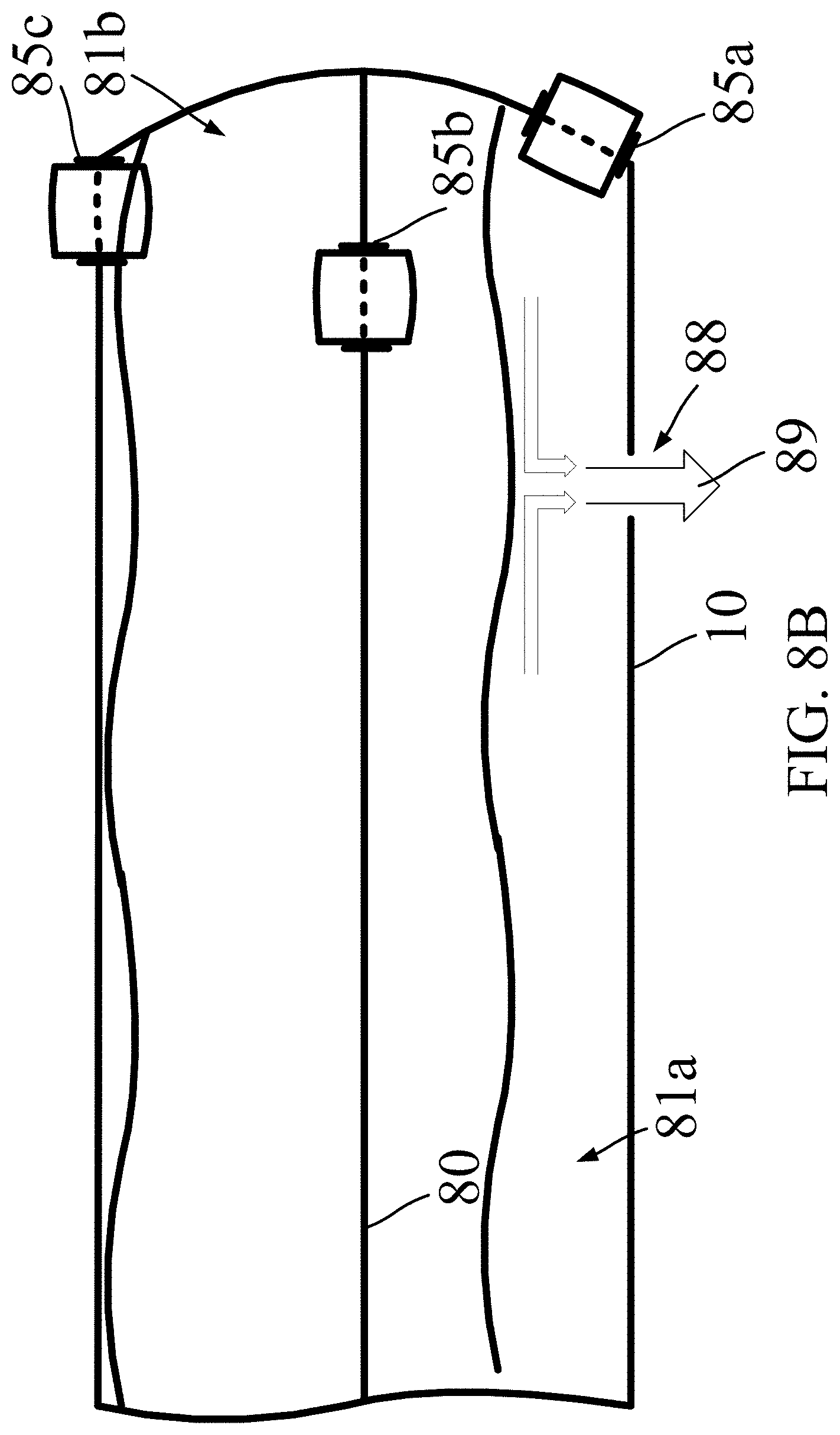 [0090]FIG. 8A is a diagram illustrating an example tube configuration for filling a flexible containment tube 10 with a valve system, according to one embodiment. As shown, tube 10 includes an inner membrane 80 forming multiple chambers 81 within a single tube 10. In FIG. 8A, a single inner membrane 80 is shown forming a lower chamber 81a and an upper chamber 81b. An inner membrane 80 may be formed of a material similar to that of the tube body 10, and as such, may be watertight to separate the fluids in each chamber 81. A valve 85 may be disposed within the membrane 80 to facilitate the flow of fluid from one chamber to the next, but not vice versa. For example, valve 85b may facilitate the flow of fluid 87c from the lower chamber 81a to the upper chamber 81b but not from the upper chamber to the lower chamber.