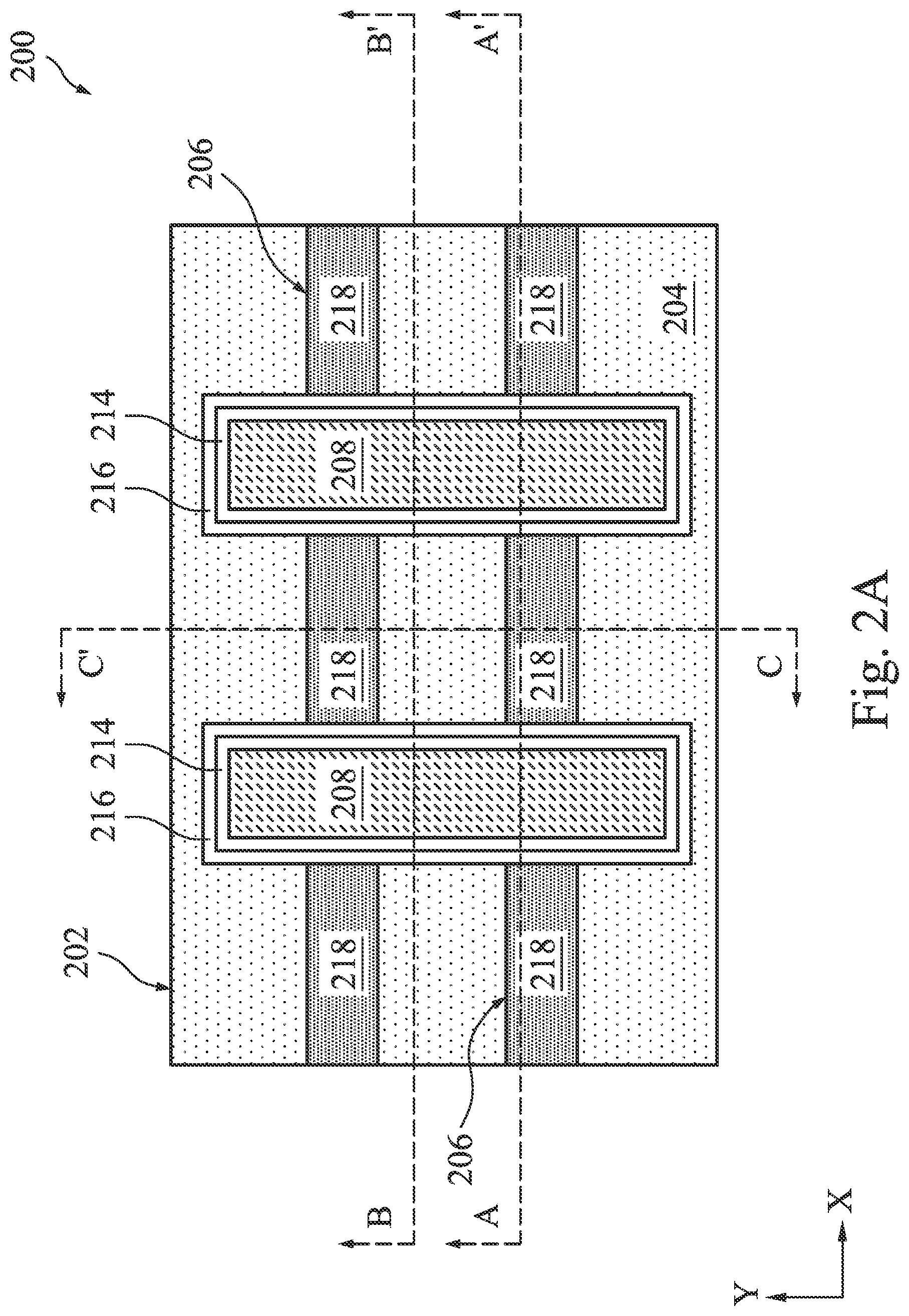 FIG. 2A is a top view of a semiconductor structure at a fabrication stage constructed according to some embodiments.