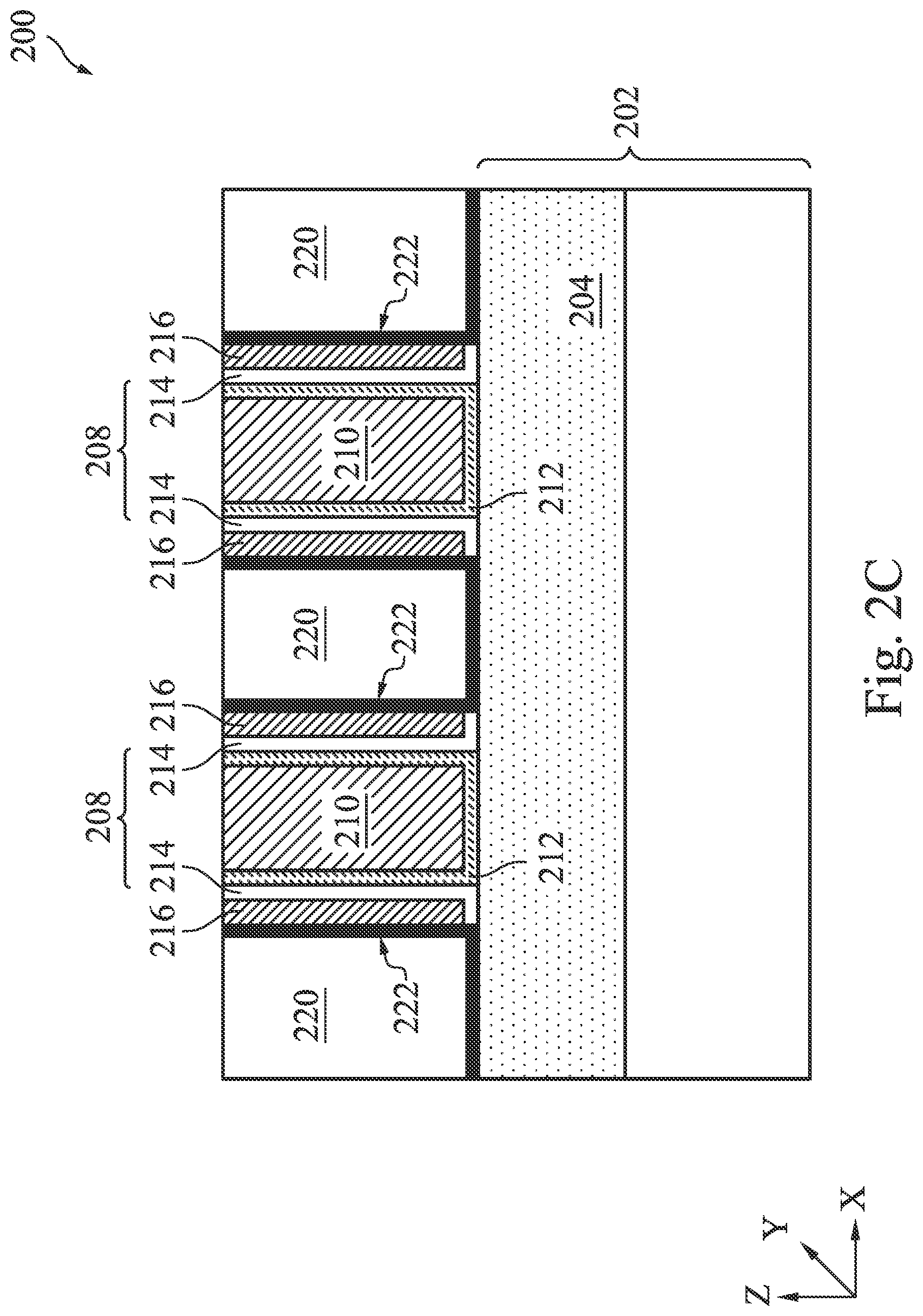 Still referring to FIGS. 2A-2D, the method 100 proceeds to an operation 108 by forming gate stacks 208 on the semiconductor substrate 202. Each of the gate stacks 208 further includes a gate electrode 210 and a gate dielectric layer 212. In the present embodiment, the gate stacks 208 have elongated shapes and are oriented in the second direction (Y direction). Each of the gate stacks 208 may be disposed over multiple fin active regions 206. Especially, the gate stacks 208 are disposed on the fin active regions 206 and extended onto the STI features 204. Thus, each of the gate stacks 208 includes portions landing on the fin active regions 206 and portions landing on the STI features 204. The operation 108 also includes forming an inner gate spacer 214, an outer gate spacer 216, source/drain (S/D) features 218, and an interlevel dielectric (ILD) layer 220. The operation 108 further includes multiple operations according to some embodiments. In the present embodiment, the operation 108 further includes operations 110, 112, 114, 116 and 118, which are further described below with reference to FIG. 1 and FIGS. 2A-2D.