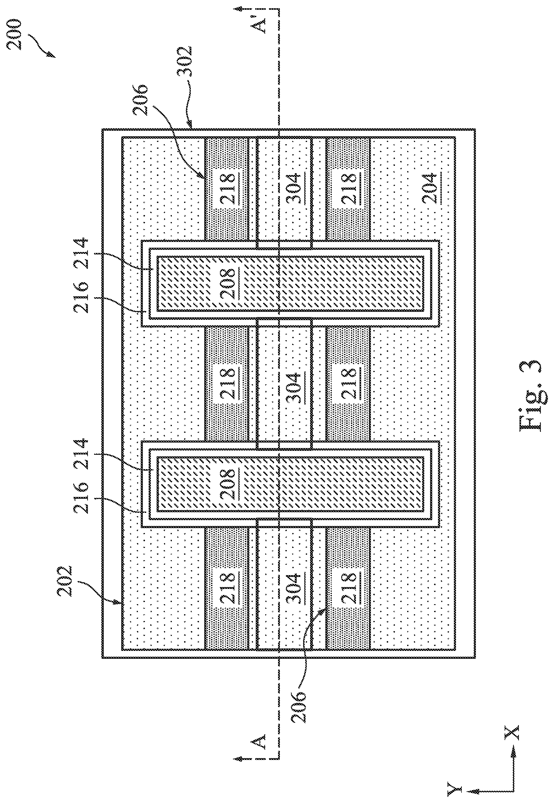 FIG. 3 is a top view of the semiconductor structure at a different fabrication stage constructed according to some embodiments.