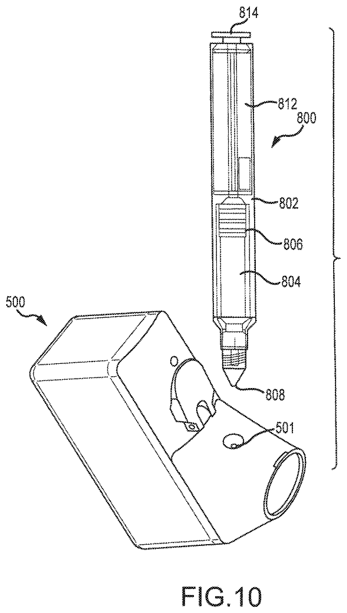 a housing comprising two lateral faces and a plurality of side walls extending between the two lateral faces, the housing defining a mouthpiece on one of the plurality of side walls and a liquid receptacle fluidly coupled to the mouthpiece, wherein the liquid receptacle defines an opening that extends through an exterior surface of one of the plurality of side walls of the housing at an inlet end of the opening and that is configured to receive the dosage of liquid from the tip of the dispensing mechanism; an aerosol generator disposed within the housing, wherein during use the aerosol generator aerosolizes the dosage of liquid as a user inhales, the aerosol generator comprising:
