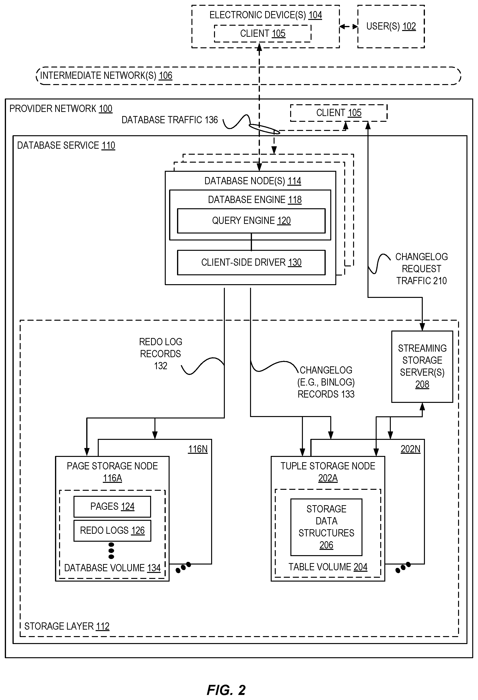 In some embodiments, the operations 600 further include receiving, at the head node from the one or more page storage nodes, one or more data pages generated based at least in part on the one or more redo log records; receiving, at the head node, a second database statement to read data from the database; and processing, at the head node, the second database statement using the one or more data pages. In some embodiments, the operations 600 further include receiving, at a streaming storage server of the distributed database that is implemented by a third one or more electronic devices, a request involving a change log associated with the first database; obtaining, by the streaming storage server, data from one or more data structures of the one or more tuple storage nodes; and transmitting response data that is based at least in part on the obtained data. In some embodiments, the one or more data structures include one or more change log indexing data structures storing change log data and further include one or more transaction indexing data structures storing transactional metadata associated with the change log data.