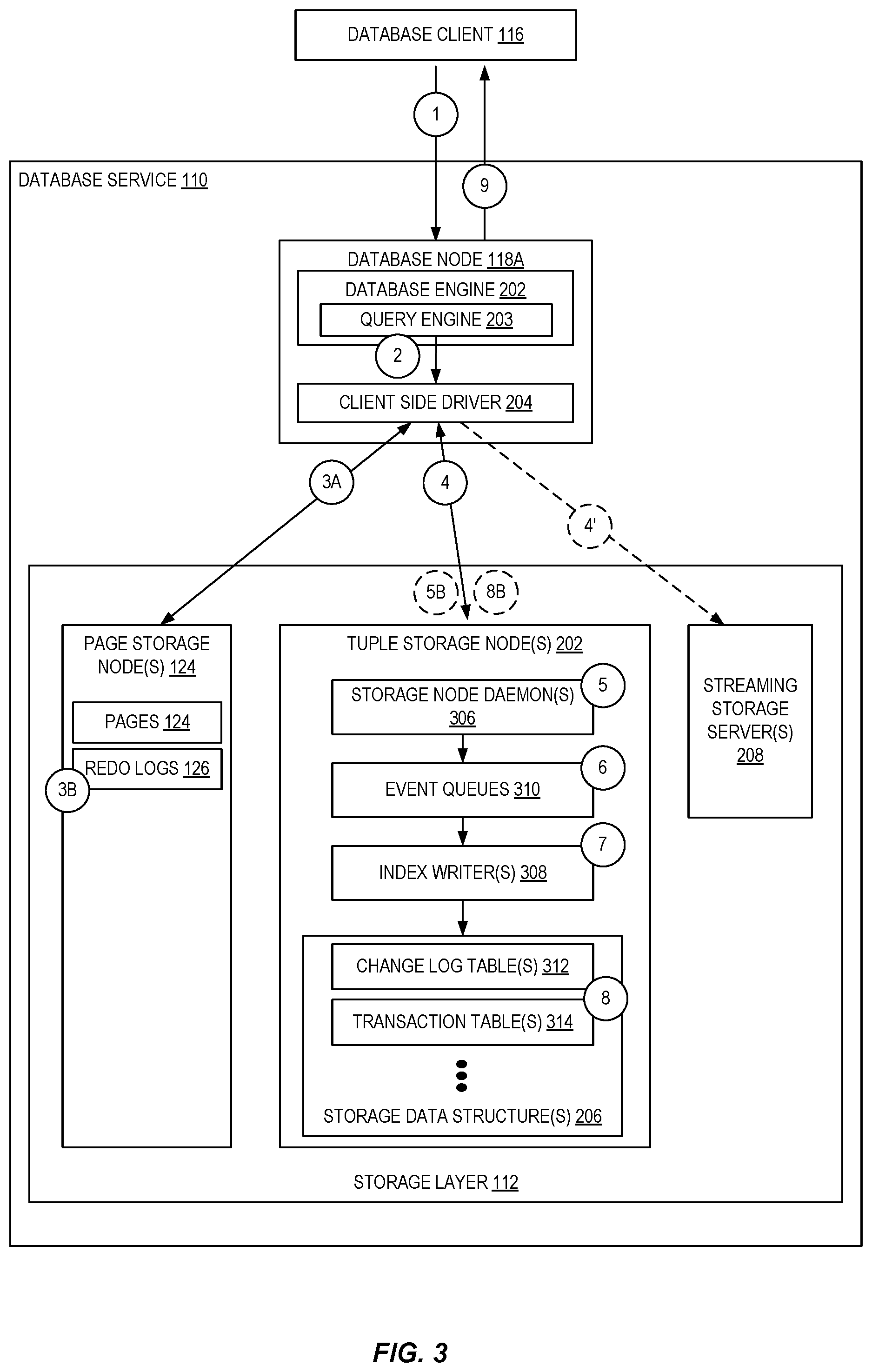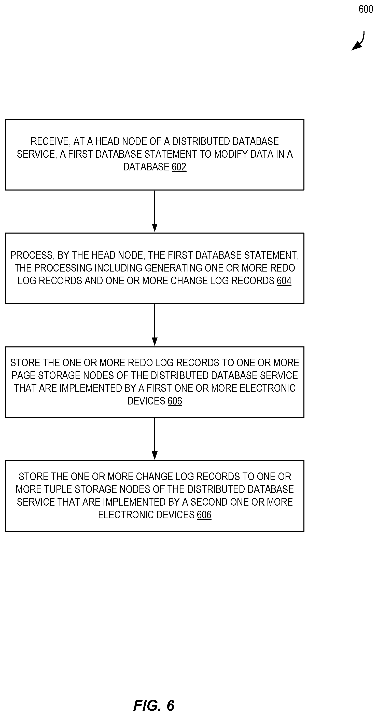 The operations 600 further include, at block 606, storing the one or more redo log records to one or more page storage nodes of the distributed database service that are implemented by a first one or more electronic devices; and, at block 608, storing the one or more change log records to one or more tuple storage nodes of the distributed database service that are implemented by a second one or more electronic devices.