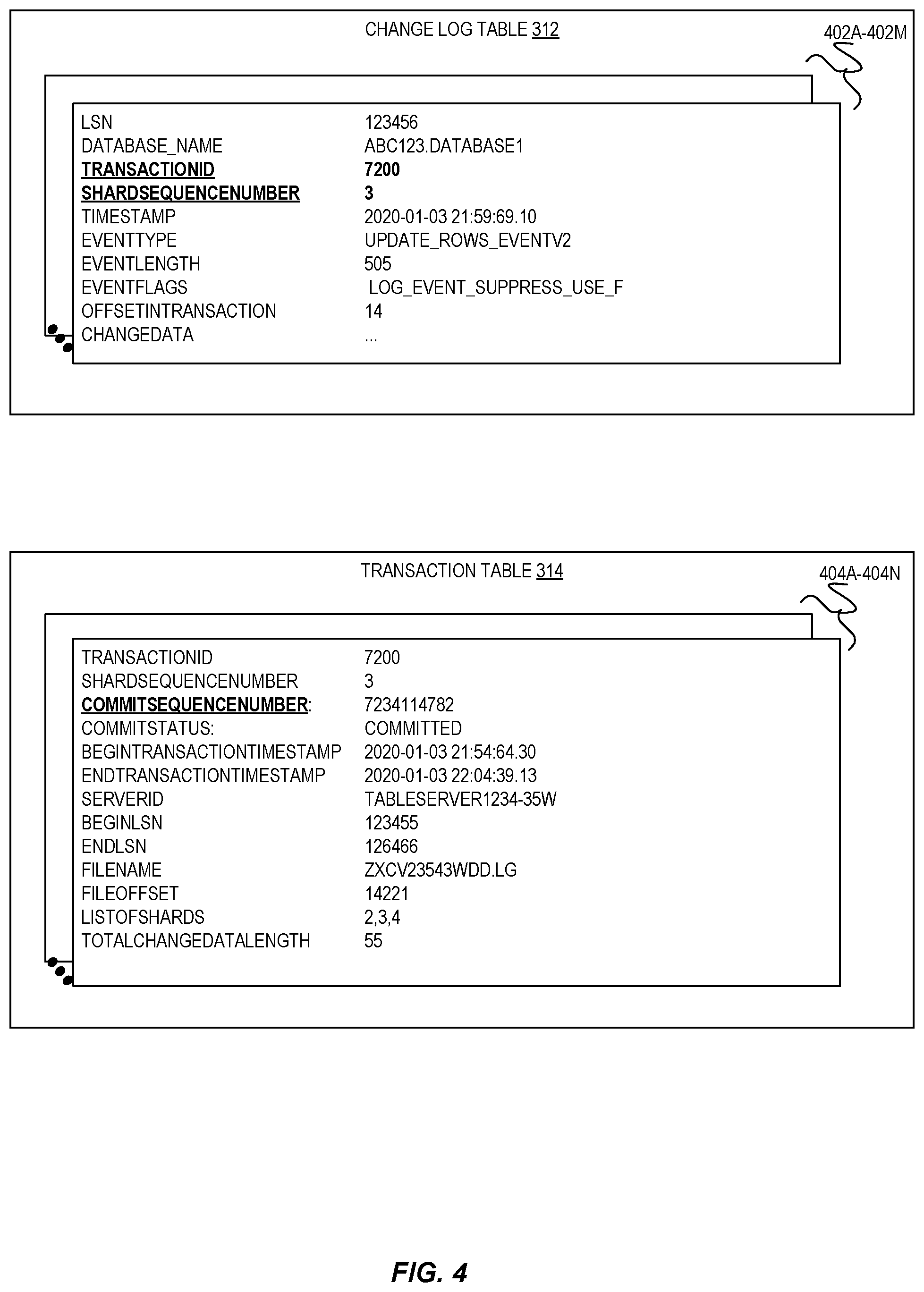 As another example, transaction data pertaining to the change log events may be stored in a transaction table 314 as records 404A-404N. In some embodiments, each record includes one or more of the following fields: a transaction ID, a shard sequence number, a commit sequence number (the global sequence number of committed transactions), a commit status (e.g., committed or rolled back or started), a begin transaction timestamp, an end transaction timestamp, a server ID of the server that committed the transaction, a begin LSN, an ending LSN, a file name, a file offset, a list of associated shards, a total change data length, etc. In some embodiments, this table may be indexed over one or more columns—e.g., over the commit sequence number.