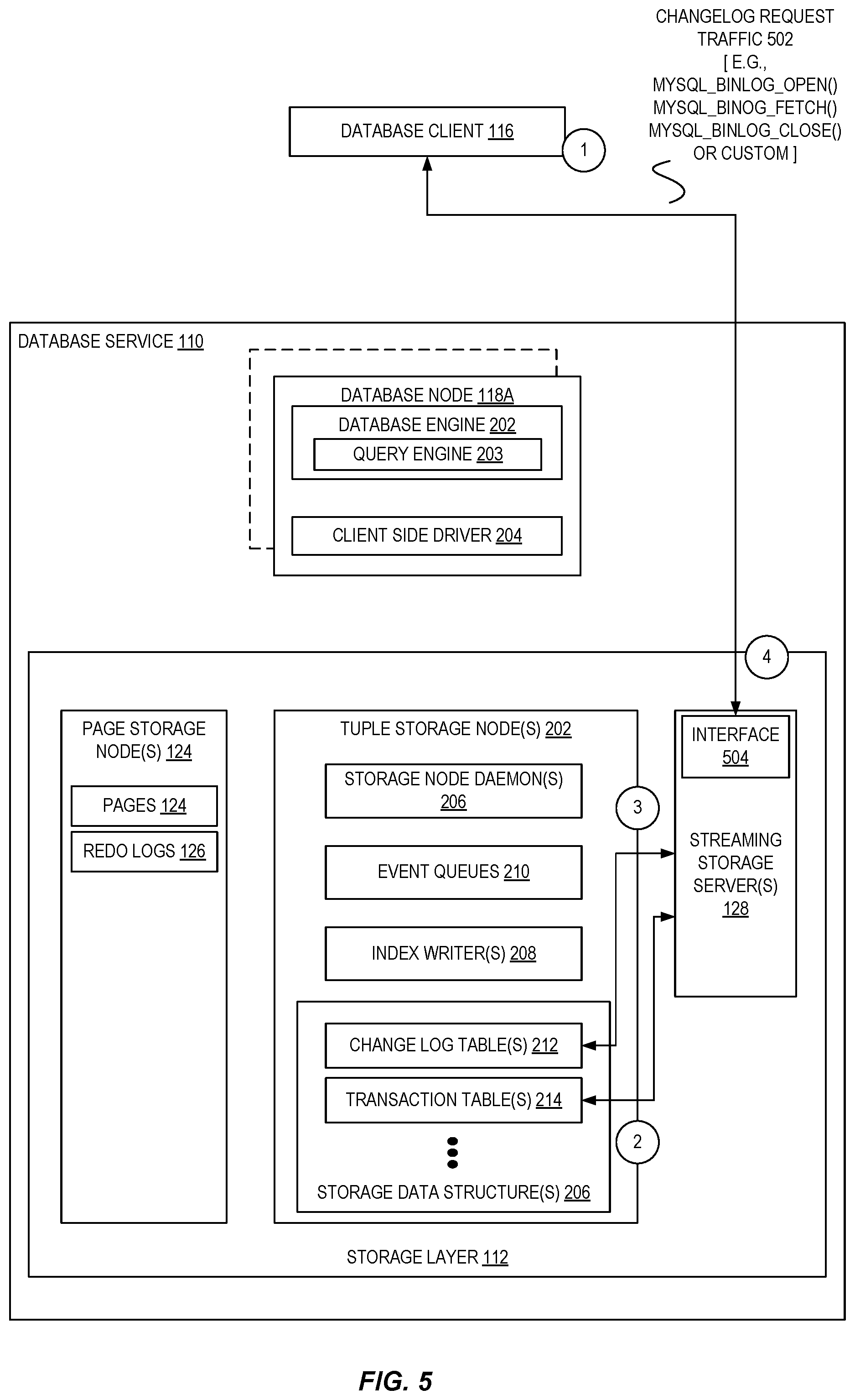 For example, the streaming storage server(s) 208 expose a change log interface 504 to clients 116, which could support existing change log-associated requests 502 (e.g., mysql_binlog_open( ), mysql_binlog_fetch( ), mysql_binlog_close( ), etc.) or even custom change-log associated requests. Thus, the database client 116 at circle (1) may issue one or more change log requests to an address (e.g., a network address) associated with the streaming storage server(s) 208—instead of issuing it to the database node(s) 118. For example, the database client 116, may issue a request to fetch a set of change logs from a particular offset at circle (1).