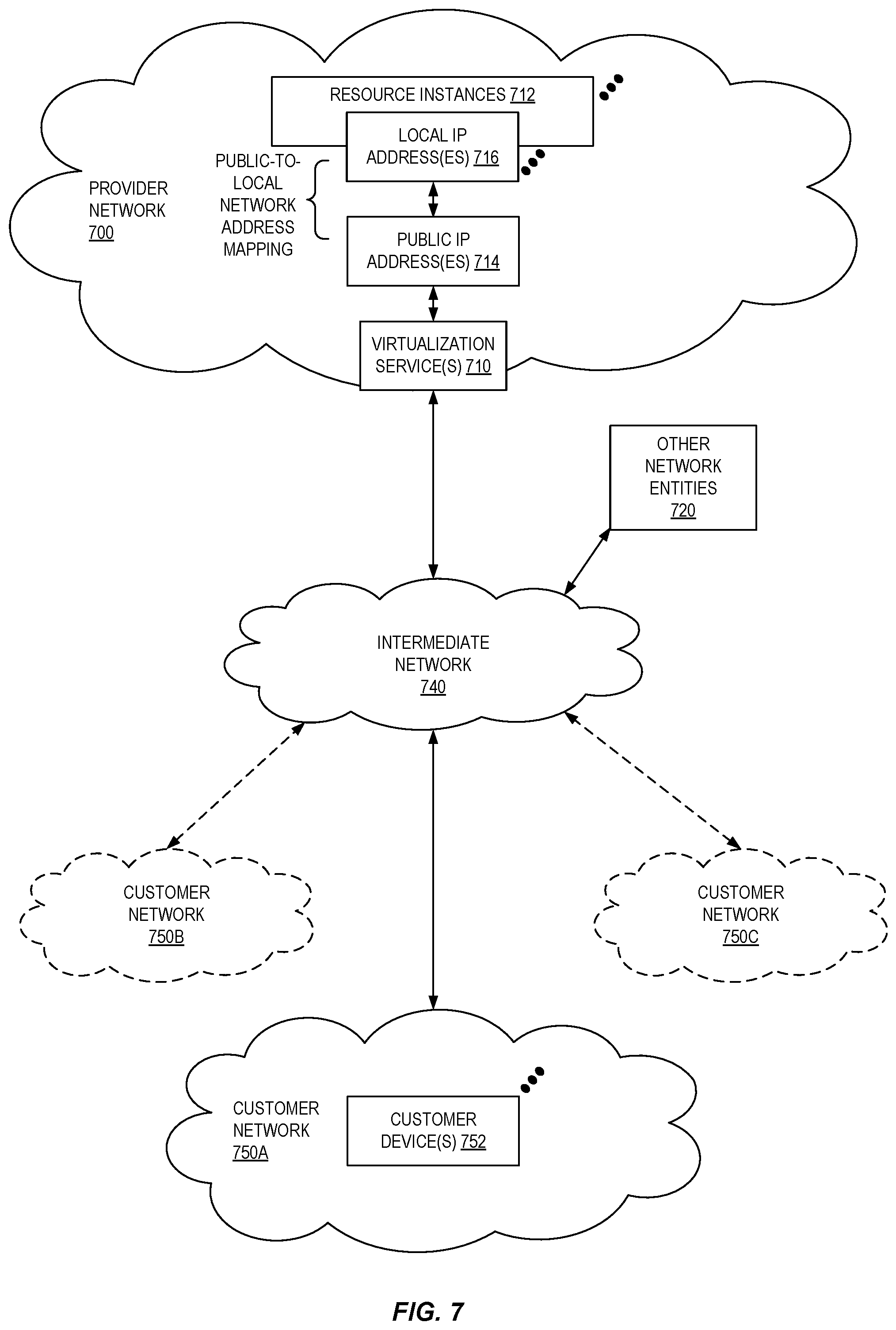 Conventionally, the provider network 700, via the virtualization services 710, may allow a customer of the service provider (e.g., a customer that operates one or more client networks 750A-750C including one or more customer device(s) 752) to dynamically associate at least some public IP addresses 714 assigned or allocated to the customer with particular resource instances 712 assigned to the customer. The provider network 700 may also allow the customer to remap a public IP address 714, previously mapped to one virtualized computing resource instance 712 allocated to the customer, to another virtualized computing resource instance 712 that is also allocated to the customer. Using the virtualized computing resource instances 712 and public IP addresses 714 provided by the service provider, a customer of the service provider such as the operator of customer network(s) 750A-750C may, for example, implement customer-specific applications and present the customer's applications on an intermediate network 740, such as the Internet. Other network entities 720 on the intermediate network 740 may then generate traffic to a destination public IP address 714 published by the customer network(s) 750A-750C; the traffic is routed to the service provider data center, and at the data center is routed, via a network substrate, to the local IP address 716 of the virtualized computing resource instance 712 currently mapped to the destination public IP address 714. Similarly, response traffic from the virtualized computing resource instance 712 may be routed via the network substrate back onto the intermediate network 740 to the source entity 720.