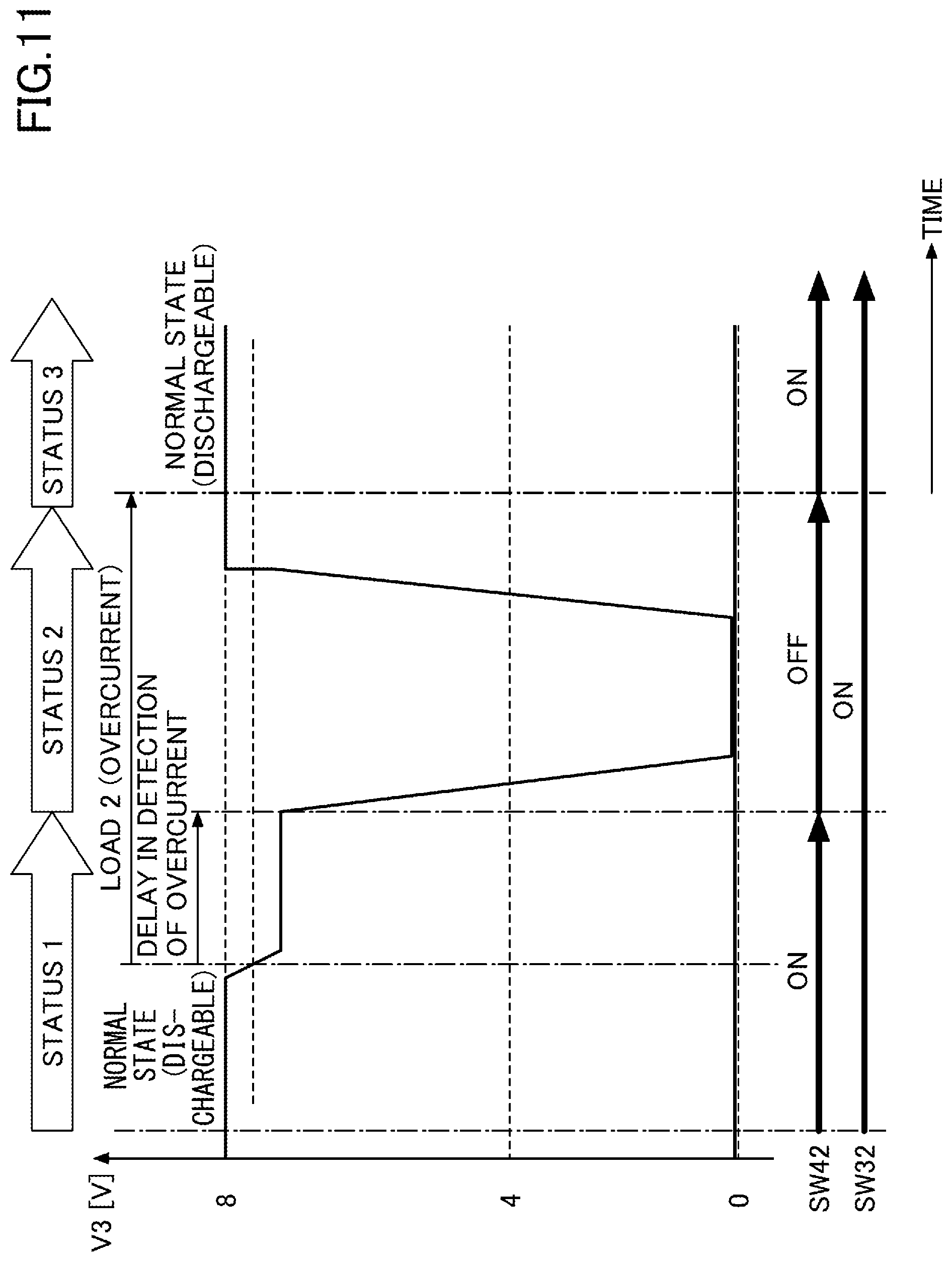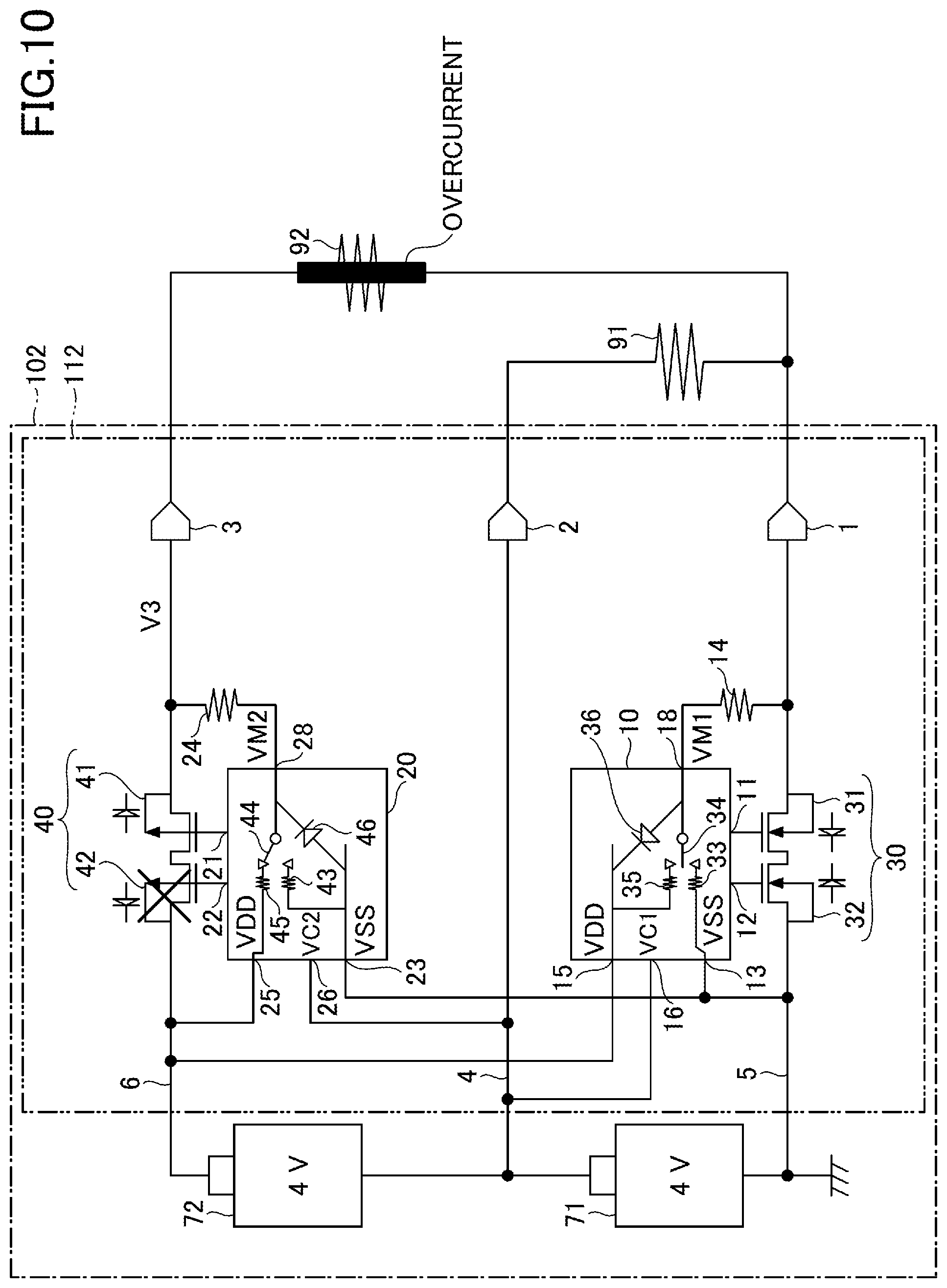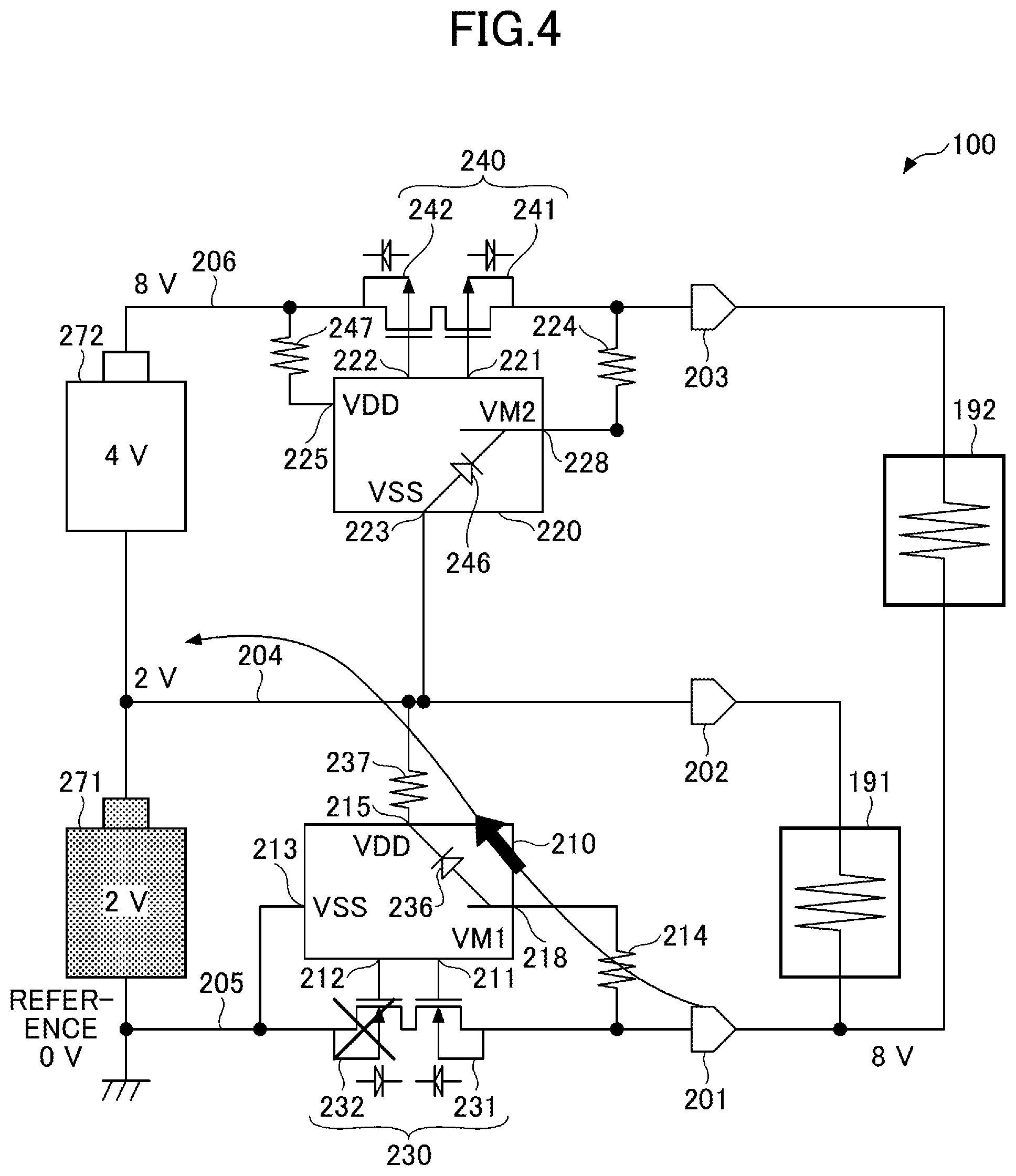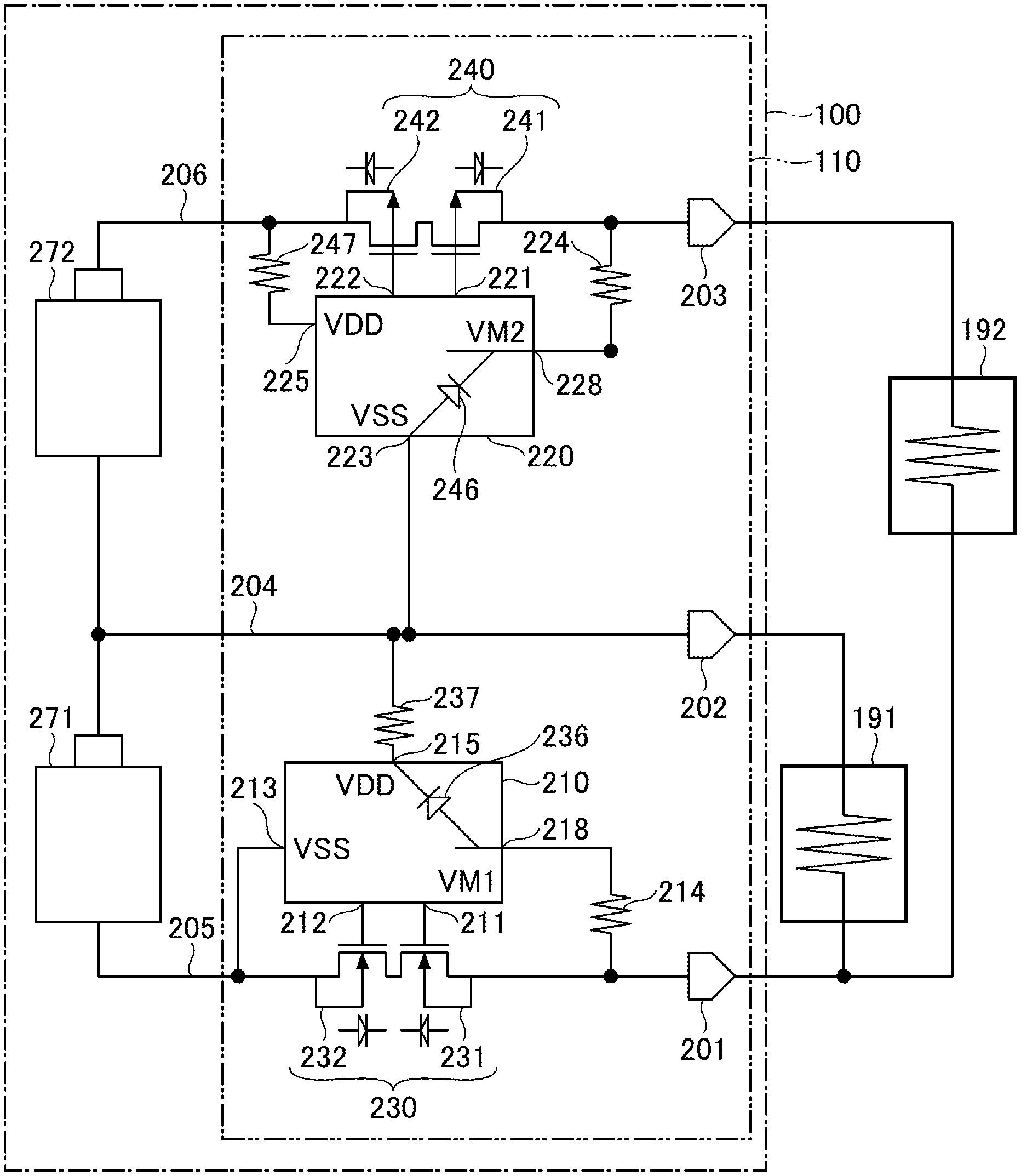 supply a first output voltage to a first load between the first terminal and the second terminal, the first output voltage corresponding to a voltage across the first secondary battery; and supply a third output voltage to a second load between the first terminal and the third terminal, the third output voltage indicating the sum of the first output voltage and a second output voltage, the second output voltage corresponding to a voltage across the second secondary battery; and in response to detecting that the first switching circuit is turned off by the first protection IC and the second switching circuit is turned on by the second protection IC,