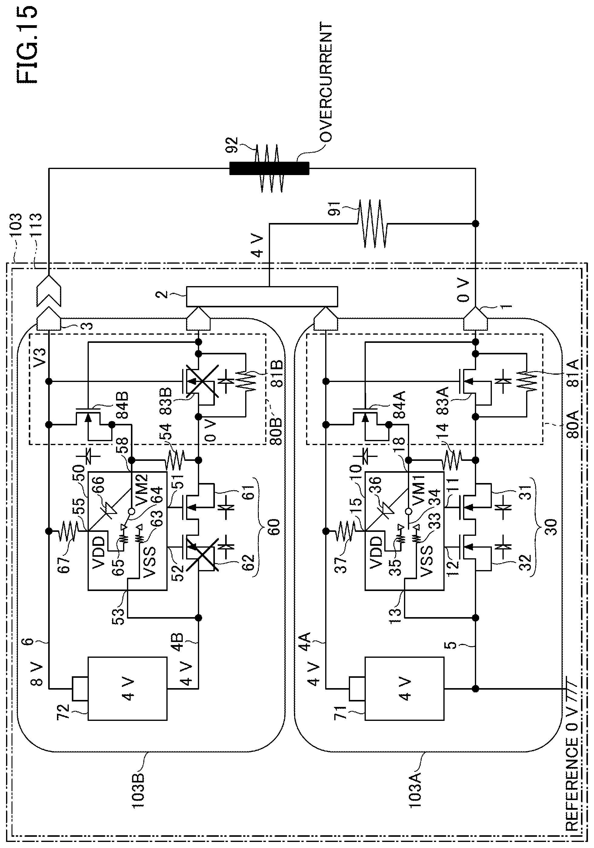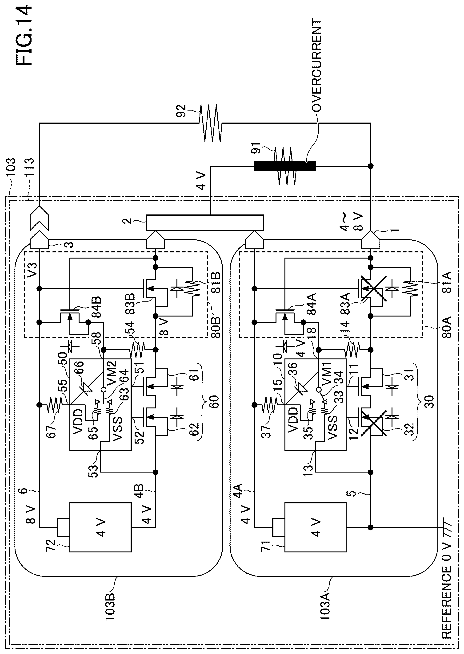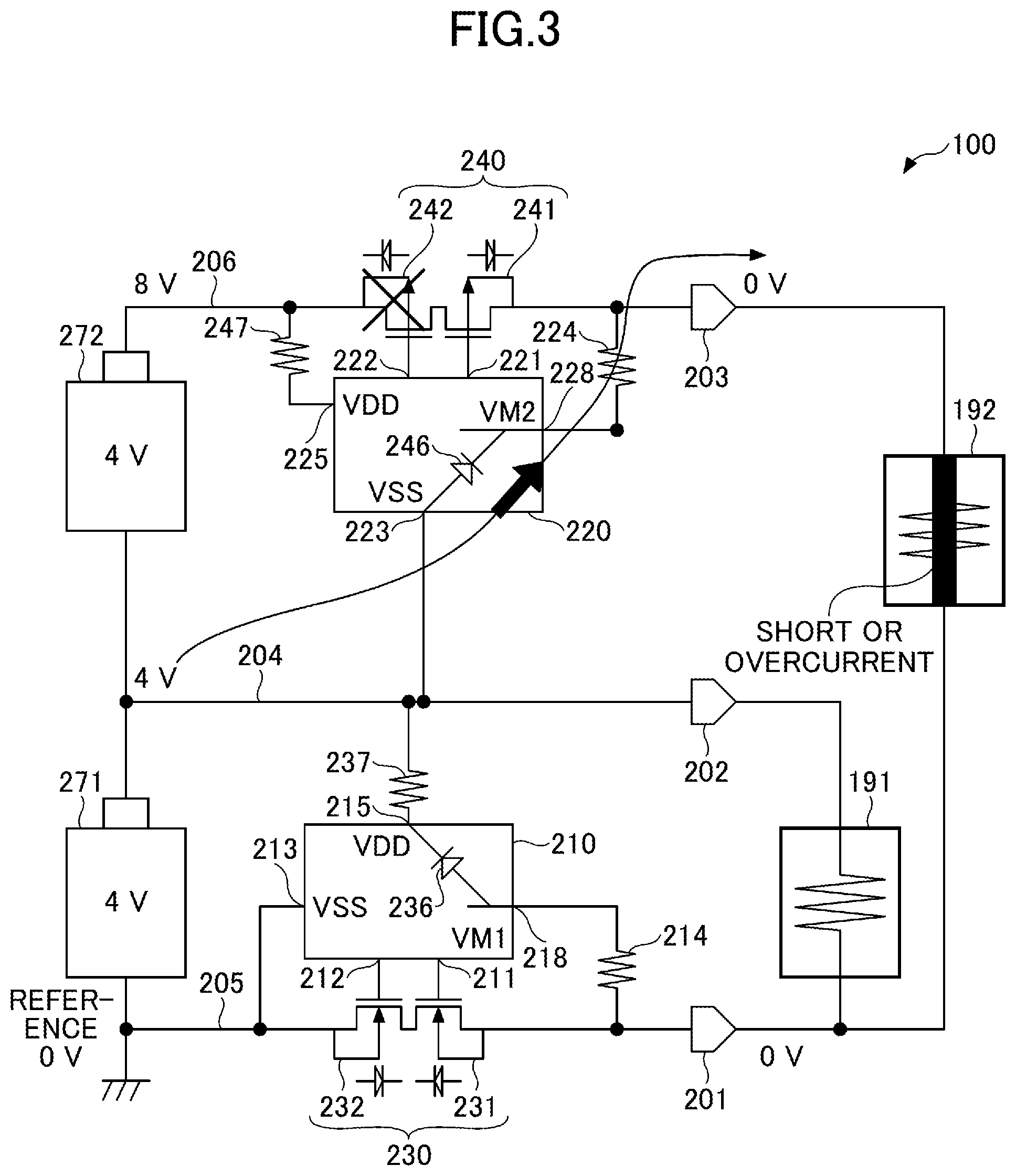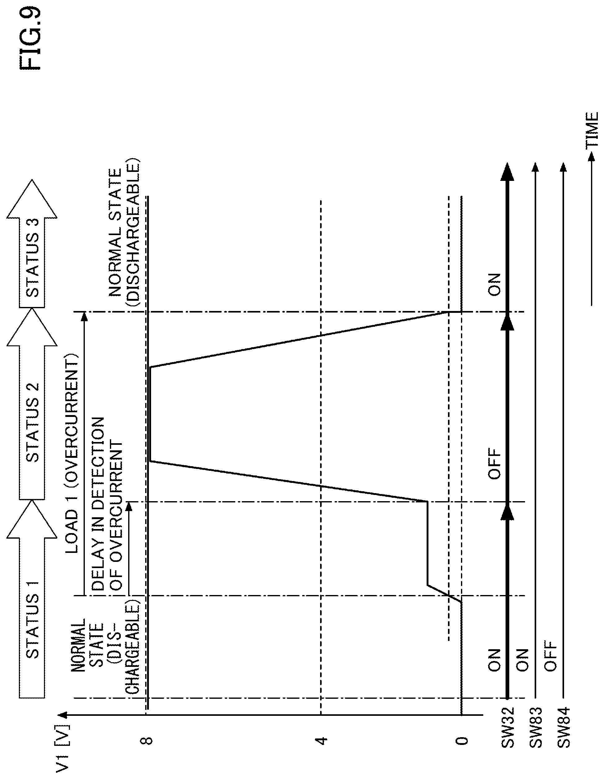 supply a first output voltage to a first load between the first terminal and the second terminal, the first output voltage corresponding to a voltage across the first secondary battery; and supply a third output voltage to a second load between the first terminal and the third terminal, the third output voltage indicating the sum of the first output voltage and a second output voltage, the second output voltage corresponding to a voltage across the second secondary battery; and in response to detecting that the first switching circuit is turned off by the first protection IC and the second switching circuit is turned on by the second protection IC,