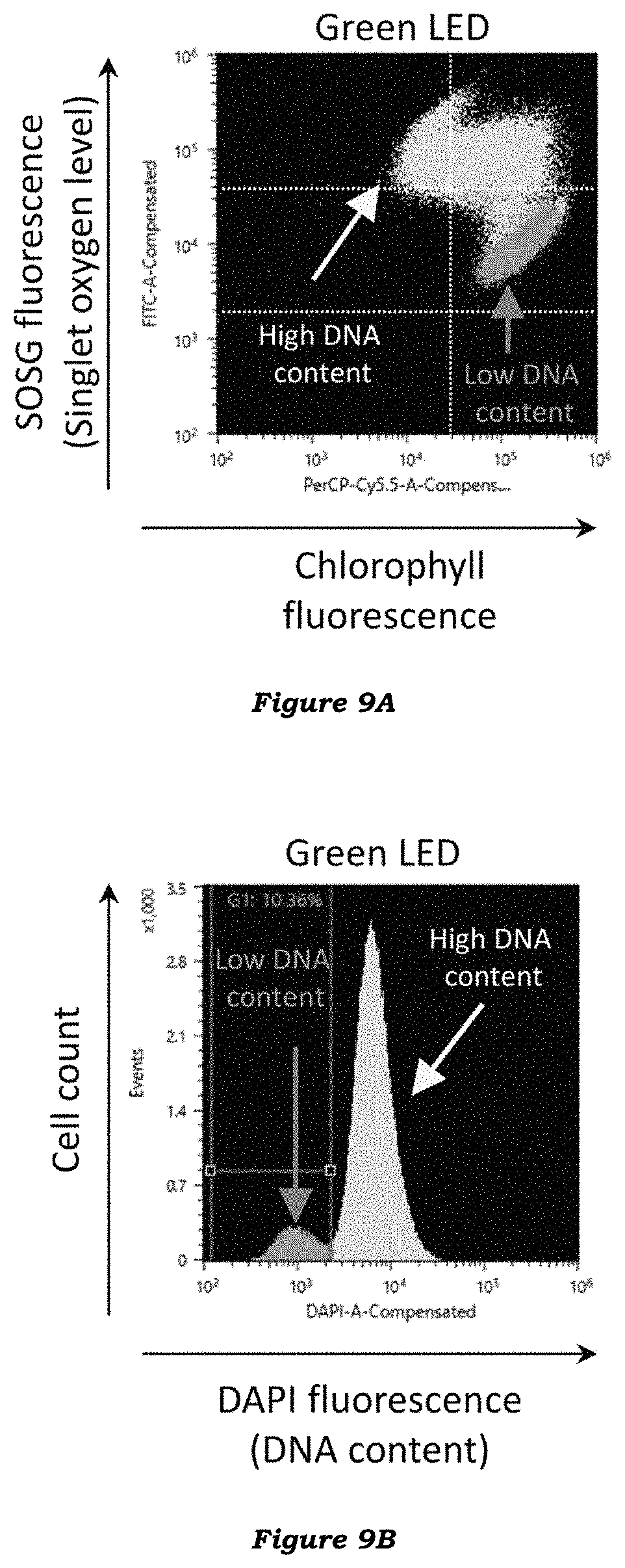 Cultivation medium: 1 mL of the modified HSM medium which is 5-fold increased nitrogen source obtained by adding up to 2.5 g/L of NH4Cl CO2concentration: Not fed Temperature: 30° C. Stirring: 100 rpm After the further cultivation, SOSG fluorescence (excitation wavelength: 488 nm; detection wavelength: 525/50 nm) was analyzed on a Cell Sorter SH800 (SONY). Results: The relative SOSG fluorescence is 40.1 for the algal cells irradiated with red LED light and 12.4 for the algal cells irradiated with green LED light. The data suggest that the amount of singlet oxygen generated in the algal cells by green light irradiation is less than that by red light irradiation. The data also suggest that regardless of whether green or red light, too high energy irradiation causes a high level of singlet oxygen generation in the algal cells, resulting in an adverse effect on the growth rate (and, therefore, on the rate of biomass increase). Controlling the singlet oxygen level and the irradiance can enable an efficient cultivation of algal cells. Methods After the further cultivation, DNA in the cells was fluorescently stained with 4′,6-diamidino-2-phenylindole (DAPI). The SOSG fluorescence (excitation wavelength: 488 nm; detection wavelength: 525/50 nm), DAPI fluorescence (excitation wavelength: 405 nm; detection wavelength: 450/50 nm) and chlorophyll fluorescence (excitation wavelength: 488 nm; detection wavelength: 720/60 nm) were analyzed on a Cell Sorter SH800 (SONY). Results: The results are shown in The cells with a strong SOSG fluorescence (that is, the cells with a high level of singlet oxygen generation) tend to exhibit a strong DAPI fluorescence (i.e., to have a high DNA content) and a weak chlorophyll fluorescence (i.e., to have a low chlorophyll content) ( The irradiation with green LED light (at a photon flux density of 600 μmol/m2/s) for 12 hours increased the percentage of the cells with a strong SOSG fluorescence (that is, the cells with a high level of singlet oxygen generation) ( Without wishing to be bound by any particular theory, the present inventors believe from the results that an increased level of singlet oxygen causes oxidative damage to the algal cells, resulting in cell cycle arrest at the phases when the DNA content is high (the S, G2 and/or M phases) and (simultaneously or subsequently) the decrease of chlorophyll content. Controlling irradiance according to the cell-cycle phases can enable an efficient cultivation of algal cells. Methods About 5 g of freeze-dried algal cells were placed into a lysis microtube, to which then added were a 300 μL volume of glass beads and 500 μL of a 1:1 mixture of acetone and methanol. The cells were homogenized using a multibeads shocker under the following conditions: 30 cycles of 60 sec ON (2,700 rpm)+60 sec OFF (0 rpm) at 4° C. After the homogenates were centrifuged (10,000×g, 5 min., 4° C.), the supernatants were collected. One hundred fifty microliters of the supernatants were evaporated to dryness in a centrifugal evaporator, followed by re-dissolution in 50 μL of chloroform. To each of the thus-obtained solutions, 425 μL of a 2:8 mixture of chloroform and acetonitrile and 25 μL of 20 M trans-β-apo-8′-carotenal (as internal standard) were added. The pigments in the solutions were analyzed by UPLC (ACQUITY UPLC system: Waters) under the following conditions. UPLC/PDA analytic conditions Mobile phase: Eluent A: MeOH:H2O=1:1 (v/v) Results: The resulting liquid chromatograms are given in In the algal cells cultivated under green light irradiation, the native chlorophylls were decreased while mutated chlorophylls appeared ( The algal cells having decreased native chlorophylls might have improved in transmittance of red to blue light and therefore be efficiently cultivated, especially under the artificial irradiation. Methods The Na lamp used was a low-pressure sodium lamp (NX35, Panasonic), the emission spectrum of which is given in A sample (about 8 mL) of the culture was taken from the culture vessel on each day during the main cultivation, and centrifuged (at 50,000×g for 1 minute) to collect Results: In the cells cultivated under irradiation with Na lamp light for 2 days, the biomass exceeded 1.0 g/L. The time course of biomass in the Chlorophyceae cells cultivated under irradiation with Na lamp light is similar to that in the Chlorophyceae cells cultivated under irradiation with green LED light. These results suggest that the irradiation with light in the wavelength range of 520 to 630 nm is effective for efficient cultivation of algal cells irrespective of the type of light source. The contents of all patents, patent applications and references cited in the present specification are incorporated herein in its entirety by reference, as if fully and specifically set forth herein, to the fullest extent permitted by applicable law. It is to be noted that the above embodiments and examples are given by way of illustration only for the purpose of better understanding of the invention. It is to be also understood that the present invention is not limited to the particular configurations, arrangements, process steps, materials, means and devices described in the specification and the appended drawings. Various other changes, modifications and alterations can be made to the embodiments described above without departing from the spirit and scope of the present invention. It is to be further noted that aspects of the invention described with respect to one embodiment, may be incorporated in a different embodiment although not specifically described relative thereto. That is, all embodiments and/or features of any embodiment can be combined in any way and/or combination.CROSS-REFERENCE TO RELATED APPLICATIONS