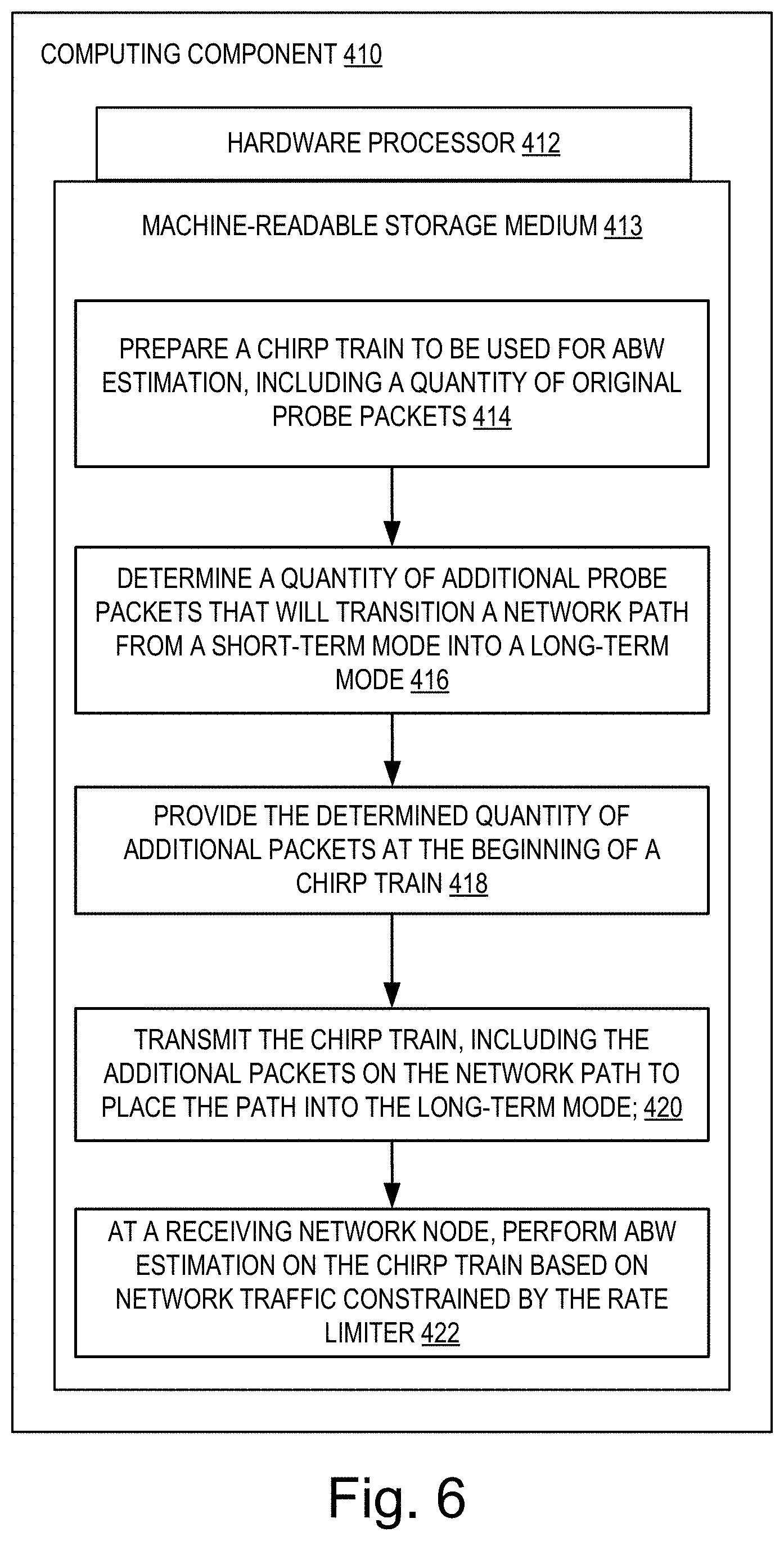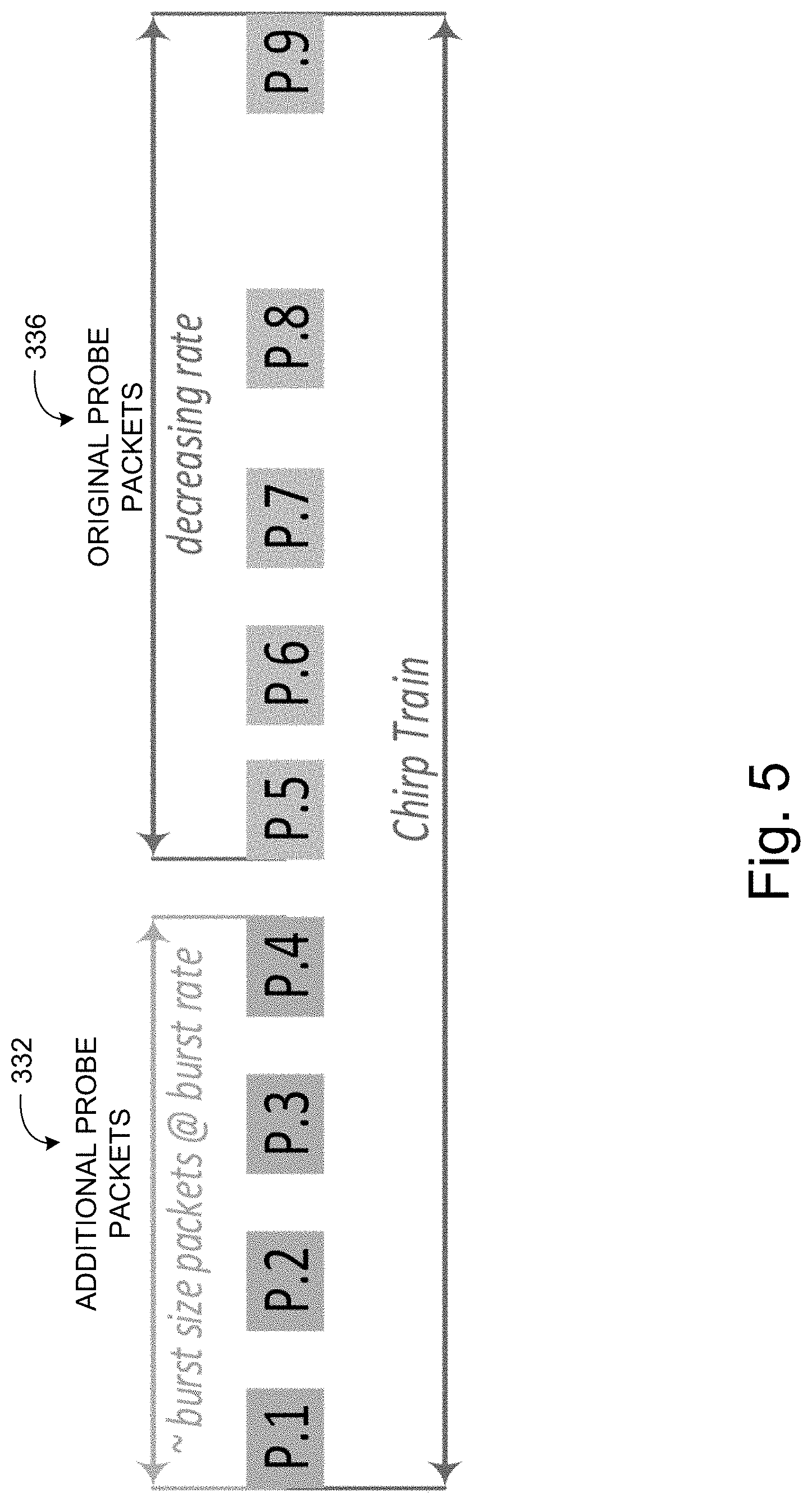 In practice, the number of packets needed to empty the rate limiter bucket can be directly measured over the network path, by measuring how many packets it takes to transition from burst rate to target rate. Measuring this quantity can allow embodiments to avoid having to know all the various rates and having to compute them. As noted above, this can also make embodiments compatible with network policers and network shapers that are not based on a token bucket. If those measurements are done using the chirp train, embodiments may further make the preload size slightly larger than this measured number, so that the change from burst rate to target rate can be detected reliably. A simple way to reduce the overestimation due to capacity fluctuations is to increase the size of the chirp train. If there are vastly more probes sent at target rate than those sent at burst rate, the contribution of the probes at burst rate is reduced. However, this comes at the cost of additional probing overhead. With a decreasing chirp train, the overestimation can be estimated from the ratio of probes at burst rate and target rate in the measurement, and the ratio of burst rate to target rate. With a decreasing chirp train, with burst rate twice the target rate, to get to less than 1% overestimation in ABW, the congested part of the chirp train must be greater than 100 times the burst size, so typically the total chirp train would be 200 times the burst size. Typical burst rates are much more than twice the target rate, increasing those multipliers. A small 5 KB burst size would require chirp trains exceeding 500 to 1000 packets. A larger 25 KB burst size would require chirp trains exceeding 2500 to 5000 packets. Such large chirp trains may present issues. First, they increase overhead, and reduce useful capacity of the network path. Second, they increase congestion, that may cause other flows to slow down. Third, they increase processing cost, because there are more packets to process at the sender and receiver. Fourth, longer trains increase the probability of packet losses due to the extra congestion, and packet loss decrease the accuracy of most PRM methods. Making the chirp train longer has the advantage of increasing the number of packets forwarded at target rate. However, measurements still do include a number of packets not forwarded at target rate, causing overestimation. Some solutions for decreasing chirp trains, measure the average IAT on the middle part of the chirp train and find the first packet that matches it. It can detect the transition from burst rate to target rate, and this enable the BDA to exclude the packets forwarded at burst rate, to select a pair of packets only amongst those forwarded at target rate and therefore to eliminate overestimation. IAT fitting works well on fairly stable links, its effectiveness may decrease on noisy links or links with bursty cross traffic, so it does not work in all conditions. A limitation of the IAT fitting is that it only works if the packet forwarded at burst rate are less than 1/7th of the overall chirp train, otherwise the average IAT cannot be measured reliably. This means that the chirp train should to be somewhat large, a small 5 KB burst size would require chirp trains greater 35 packets, and a larger 25 KB burst size would require more than 175 packets. Other techniques may be used to detect capacity changes that may perform better than IAT fitting. Rate Ratio Peak finds the largest difference between the rate before and after each packet. It usually detects capacity changes more reliably than IAT fitting and can be applied on much smaller chirp trains. A method to detect capacity change in the receive train is important for at least two reasons. First it allows precise removal of the packets forwarded at the burst rate from the received chirp train prior to AWB estimation, even when cross traffic fluctuates and changes the transition point of the rate limiter. Second, it enables computation of an average or typical number of packets needed to transition the rate limiter. As noted above, embodiments may be implemented to preload the chirp train and provide a first packet preload to mitigate rate limiter bursting when using methods such as PRM. Embodiments may be implemented to send a number of packets prior to the chirp train or as part of the start of the chirp train to force the rate limiter into a long-term mode. Embodiments may be implemented to reduce the ABW (available bandwidth) overestimation due to rate limiter bursting and improve available bandwidth estimation accuracy. Further embodiments may fit into existing EDA (excursion detection algorithm) or BDA (bump detection algorithm) of popular available bandwidth estimation methods. Embodiments may also be implemented such that they minimize CPU usage, network overhead and other overheads and minimize the size of the chirp train. As noted above, capacity fluctuations cause overestimation because of bursting, where the initial packets of the chirp train are forwarded at the short-term burst rate rather than the long-term target rate. One way to combat rate limiter bursting is to increase the size of the chirp train, but this increases overhead, as described above. Embodiments may be implemented to add additional packets before the original chirp train, without increasing the size of the original chirp train. The chirp train may then be composed of two parts, the pre-load portion and the original chirp train portion. The original portion may be used for ABW estimation and may remain the same as before the preload was added (i.e., the same number of probes, and the same rates). The preload portion may have a dual use. It may be used to put the rate limiter into its long-term rate and can be used for ABW estimation. Accordingly, in various embodiments the size of the burst preload 332 is chosen to be approximately the burst size, and the rate of the preload is chosen to be approximately t