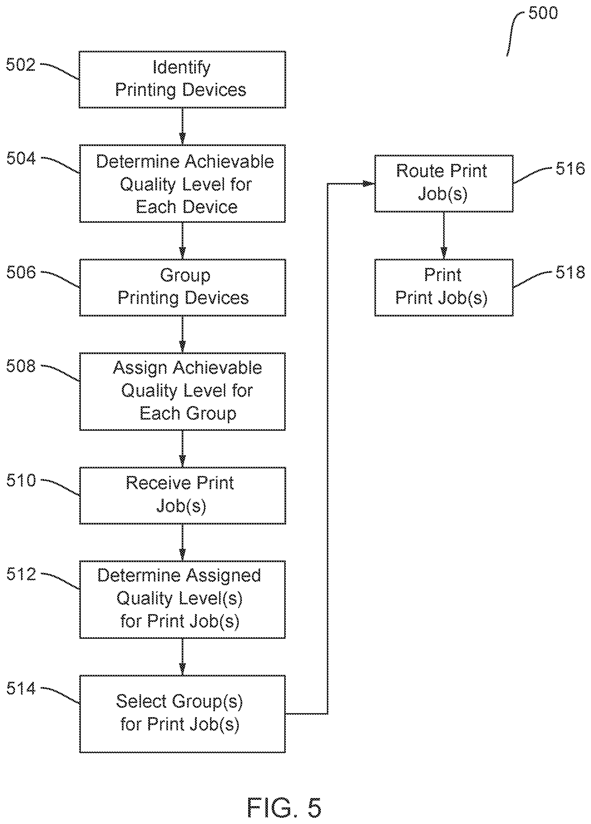 The present invention relates to a print process control system that defines a quality level for a print job and uses the defined quality level to perform printing operations. The defined quality level also may be used to determine a cost associated with the print job. Process control for print shops usually revolves around either matching an industry-standard print condition or matching a repeatable press condition. In this instance, a press is characterized so that the characterization becomes the target for the print shop. In either case, the targets represent the gamut that the press is expected to reproduce reliably. While it is understood that achieving the target gamut means that the press will reproduce print jobs as expected, this standard may be both too strict and too loose in some cases. The act of keeping a press running within tight tolerances requires additional maintenance. The maintenance takes time away from production and, ultimately, from press profitability. In addition, this additional maintenance may not be required to reproduce print jobs at an acceptable level of quality depending on the nature of the print jobs to be printed. While there are inspection systems that can be used to evaluate whether a specific print job achieves the required level of quality, these systems require significant time to setup and must be configured for individual job. These conventional systems do not allow for work with any job in a print job. A print process control method is disclosed. The method includes receiving a print job of a color document. The method also includes parsing job data for the print job related to the color document to identify at least one spot color. The method also includes determining a required level of tolerance for the at least one spot color of the print job. The method also includes routing the print job to a first printing device to process the print job by reproducing the at least one spot color. The method also includes confirming the first printing device can reproduce the at least one spot color for the print job within the required level of tolerance. The method also includes printing the color document of the print job at the first printing device. A method for managing color printing on a printing device is disclosed. The method includes generating a test chart having at least one color patch. The method also includes printing the test chart at a printing device. The method also includes capturing measurement data pertaining to the at least one color patch. The method also includes determining at least one spot color that can be reproduced at the printing device based on the measurement data. The method also includes receiving a print job for a color document. The print job includes job data. The method also includes identifying the at least one spot color from the job data. The method also includes routing the print job to the printing device according to the at least one spot color. A print process control system is disclosed. The system includes an order management system configured to receive a print job of a color document. The order management system also is configured to parse job data for the print job related to the color document to identify at least one spot color. The order management system also is configured to determine a required level of tolerance for the at least one spot color for the print job. The order management system also is configured to route the print job according to the required level of tolerance to reproduce the at least one spot color. The system also includes a printing device configured to capture measurement data to confirm that the printing device can reproduce the at least one spot color for the print job. The printing device also is configured to print the color document of the print job. Various other features and attendant advantages of the present invention will be more fully appreciated when considered in conjunction with the accompanying drawings. Reference will now be made in detail to specific embodiments of the present invention. Examples of these embodiments are illustrated in the accompanying drawings. Numerous specific details are set forth in order to provide a thorough understanding of the present invention. While the embodiments will be described in conjunction with the drawings, it will be understood that the following description is not intended to limit the present invention to any one embodiment. On the contrary, the following description is intended to cover alternatives, modifications, and equivalents as may be included within the spirit and scope of the appended claims. Numerous specific details are set forth in order to provide a thorough understanding of the present invention. The disclosed embodiments may utilize the following definitions: Printer calibration—a process for ensuring consistent color quality generated by printing devices. Test color patch—an area, which may be rectangular, containing a single color on a test color sheet. Target print job—a printed page, containing rows of test color strips. Color measurement tool—a tool, such as a spectrophotometer, for measuring color patches on a test color sheet. The measurement data may consist of International Commission on Illumination (CIE) XYZ or CIELAB values. CIELAB may refer to a color space specified by the CIE to describe all the colors visible to the human eye that is used as a device-independent reference. The disclosed embodiments include a system that allows the print shop to specify and then track the acceptable level of print quality for both individual customers and individual print jobs for the customers. In order to enable the use of this functionality, the disclosed embodiments track customer and job information with an enhancement to include additional functionality about the customer and perhaps about specific print jobs. Specifically, the print shop may define certain levels of quality for print jobs. 