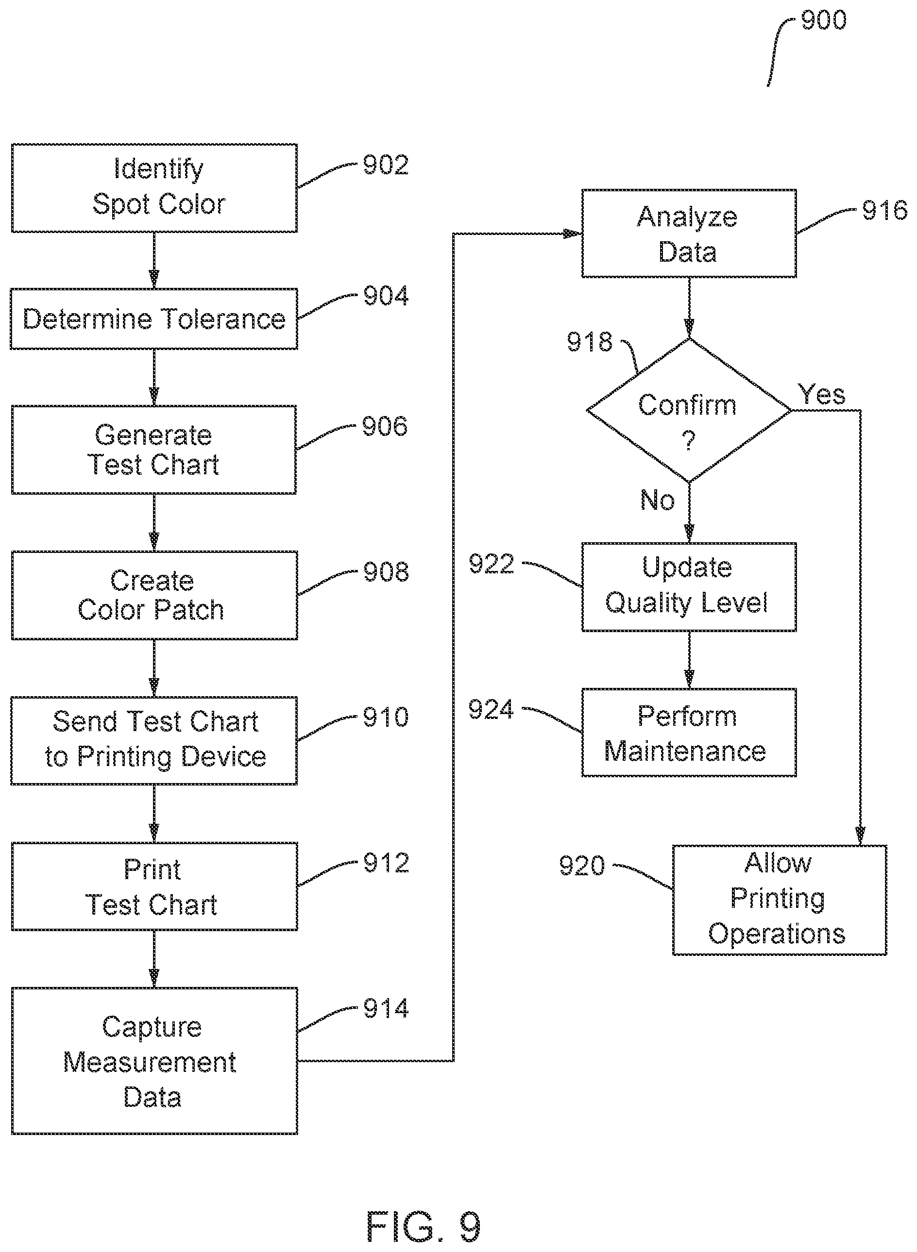 an order management system configured to receive a first print job of a first color document and a second print job of a second color document; parse job data and an image within the first print job related to the first color document and job data and an image for the second print job related to the second color document to identify a plurality of spot colors required to color print the first print job and the second print job; determine required levels of tolerance for the plurality of spot colors; select a first printing device from a plurality of printing devices according to the required levels of tolerance for the plurality of spot colors identified from the respective job data and the respective image; generate a test chart having a plurality of color patches, wherein a color patch of the plurality of color patches corresponds to one of the plurality of spot colors; confirm the first printing device can reproduce at least one spot color of the plurality of spot colors for the first print job within the required level of tolerance for the first print job using captured data; confirm the first printing device cannot reproduce at least one spot color of the plurality of spot colors for the second print job within the required level of tolerance for the second print job using the captured data; route the first print job to the first printing device based on a confirmation that the first printing device can reproduce the at least one spot color of the plurality of spot colors for the first print job within the required level of tolerance; and routing the second print job to a second printing device based on a confirmation that the first printing device cannot reproduce the at least one spot color of the plurality of spot colors for the second print job within the required level of tolerance; and the first printing device configured to print the test chart including the plurality of color patches; measure the plurality of color patches to capture data for the plurality of spot colors; provide the captured data to the order management system; print the first color document of the first print job. 8. The print process control system of capture the data pertaining to the plurality of color patches using a color measurement tool. 9. The print process control system of 10. The print process control system of