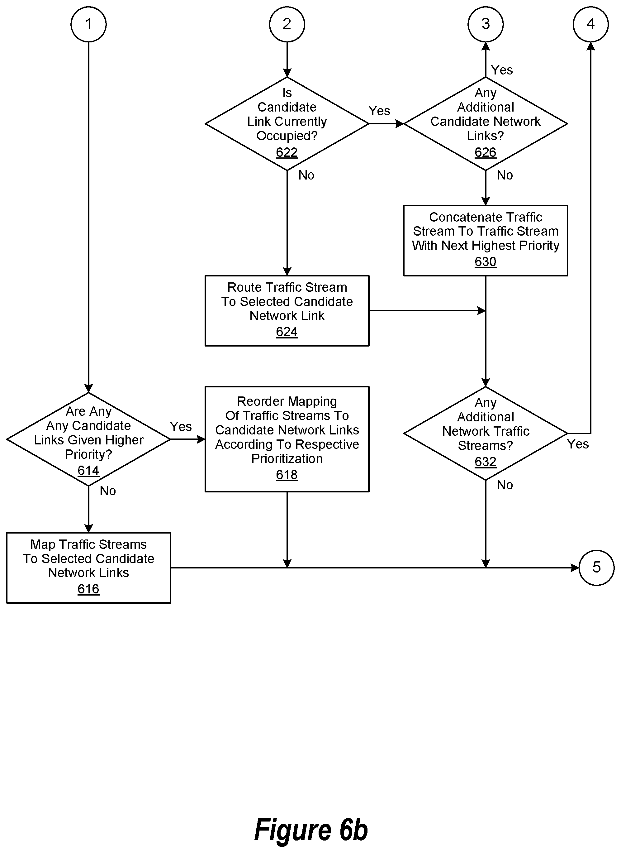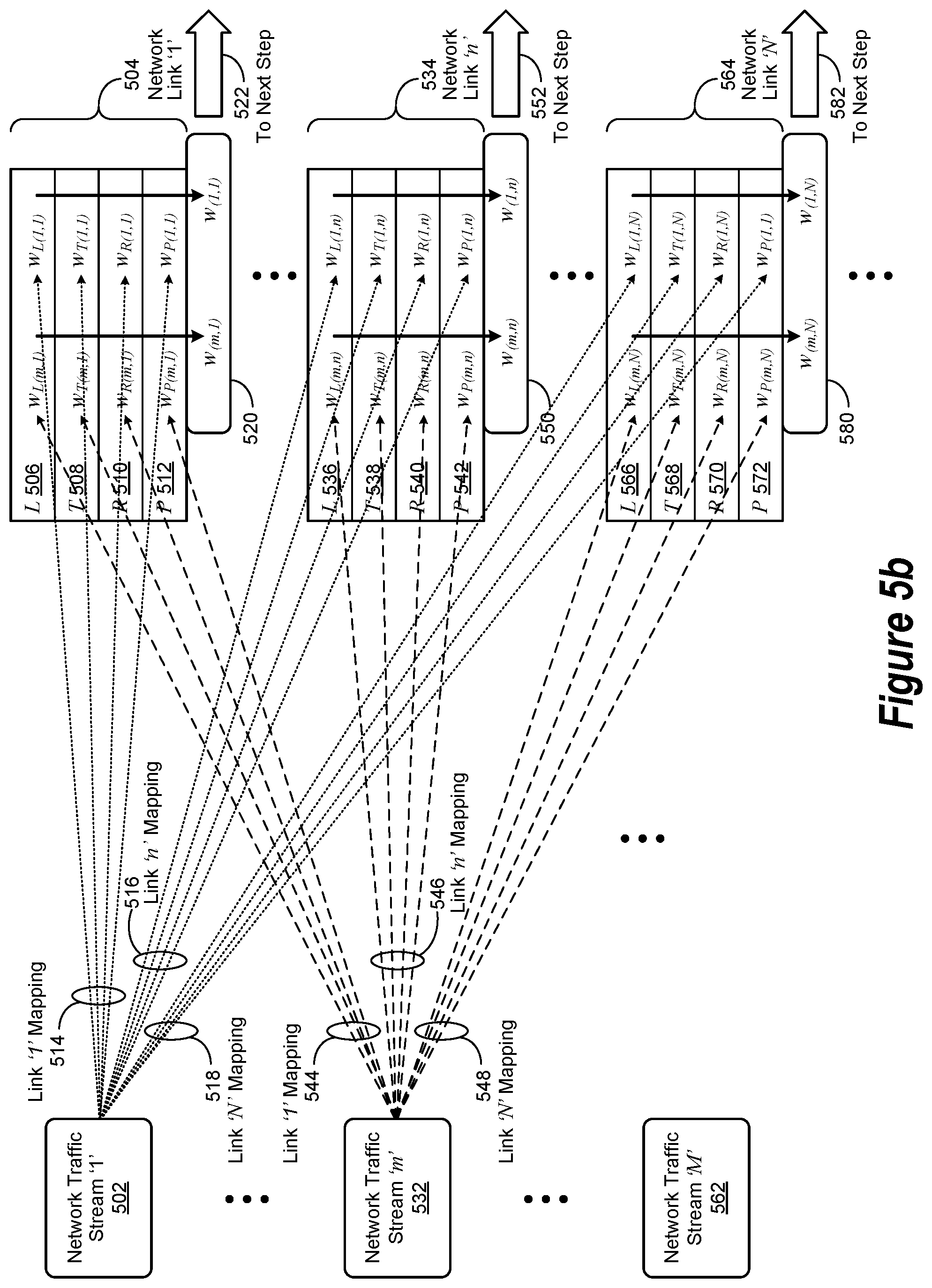 where wi(m,n)denotes the relative importance of the ith QoS capability (e.g., L 536, T 538, R 540, P 542) of network link ‘n’ 534 In certain embodiments, once network link mapping 592 operations are completed, the resulting network link mappings, such as network link mappings ‘1’ 514, 544, ‘n’ 516, 546, and ‘N’ 518, 548 shown in Accordingly, in certain embodiments, the network link preference mapping matrix may be implemented to provide the best candidate network link 520, 550, 580 for the QoS parameters of a particular network traffic stream (e.g., network traffic streams ‘1’ 502, and ‘m’ 532 through ‘M’ 562). Likewise, in certain embodiments, the network link preference mapping matrix may be implemented to provide the next best candidate network link (e.g., 2nd, 3rdand 4thbest candidates, and so forth). In various embodiments, certain next steps 522, 552, 582 may be performed, such as routing a particular network traffic stream (e.g., network traffic streams ‘1’ 502 and ‘m’ 532 through ‘M’ 562) to a particular network link (e.g., network links ‘1’ 504 and ‘n’ 534 through ‘N’ 564). A determination is then made in step 614 whether any candidate network links have been given a higher priority to other network traffic streams. If not, then the active streams of network traffic are respectively mapped to their first candidate network links in step 616. Otherwise, the mapping of network traffic streams to their candidate network links is reordered in step 618 to reflect their prioritization. However, if it was determined in step 610 to map streams of network traffic incrementally, then a network traffic stream is selected in step 620 to map to its first candidate network link. A determination is then made in step 622 whether the first candidate network link is currently occupied by another stream of network traffic. If not, then the network traffic stream is routed in step 624 to its selected candidate network link. Otherwise, a determination is made in step 626 whether any additional candidate network links (e.g., a 2nd, 3rd, or 4thcandidate) are available. If so, then the next candidate network link is selected in step 628 and the process is continued with step 622. Otherwise, the network traffic stream is concatenated in step 630 to the network traffic stream with the next highest priority. Thereafter, or after the operations in step 624 are completed, a determination is made in step 632 whether there are any additional network traffic streams to be mapped to a candidate network link. If so, the process is continued, proceeding with step 620. However, if it was determined in step 608 that it was permissible to split an individual stream of network traffic across two network links, then a determination is made in step 636 whether to incrementally map the stream of network traffic to a single network link. If not, then each stream of network traffic is respectively mapped to multiple network links in step 638 according to the distribution of their individual weighting, described in greater detail herein. Otherwise, a determination is made in step 640 whether to perform incremental mapping of each network traffic stream to multiple network links. If not, then each stream of network traffic is mapped in step 642 to multiple network links according to time-based network traffic stream weighting. Otherwise, each stream of network traffic is mapped in step 644 to multiple network links according to session-based network traffic stream waiting. As used herein, a session broadly refers to an interval of time during which a user device may be used by a user for a particular user device context, described in greater detail herein. Thereafter, or once the operations have been completed in steps 616, 618, 638, and 642, or if it was determined in step 632 that there were no additional network traffic streams, then the attainment of the respective QoS parameters of each network traffic stream is assessed in step 646. Thereafter, a determination is made in step 648 whether the QoS parameters for each network traffic stream has been met. If not, then weighting factors and network traffic routing are adjusted in step 650 and the process is continued, proceeding with step 643. Otherwise, a determination is made in step 652 whether to end QoS network traffic routing operations. If not, then the process is continued, proceeding with step 604. Otherwise, QoS network traffic routing operations are ended in step 654. In certain embodiments, the wireless dock 716 may likewise be implemented provide user devices ‘1’ 702, ‘2’ 704, ‘3’ 710, and so forth, wireless access to the LAN 224, or the WAN 230, or both, via one or more Wireless Local Area Network (WLAN) links 712. Likewise, in certain embodiments, the wireless dock 716 may be implemented to establish one or more network links to one or more peripherals 236, such as a printer, via a wired 714 network link, or one or more WLAN 712 links, or a combination thereof. In certain embodiments, the wireless dock 716 may be implemented to provide a connection to one or peripherals, such as monitors ‘A’ 706 and ‘B’ 708 via a wired connection 722. Examples of such wired connections 722 include a Universal Serial Bus (USB) connection, an IEEE 1394 connection, a Digital Visual Interface (DVI) connection, a DisplayPort connection, a High-Definition Multimedia Interface (HDMI) connection, and so forth. In certain embodiments, the wireless dock 716 may likewise be implemented to provide one or more Personal Area Network (PAN) links with one or more input/output (I/O) devices, such as a keyboard 208, a mouse 210, a gaming controller 212, a headset 216, and so forth. In various embodiments, user devices ‘1’ 702, ‘2’ 704, ‘3’ 710, and so forth may be implemented to support certain Dual-Band Simultaneous (DBS) approaches familiar to skilled practitioners of the art that allow two or more concurrent