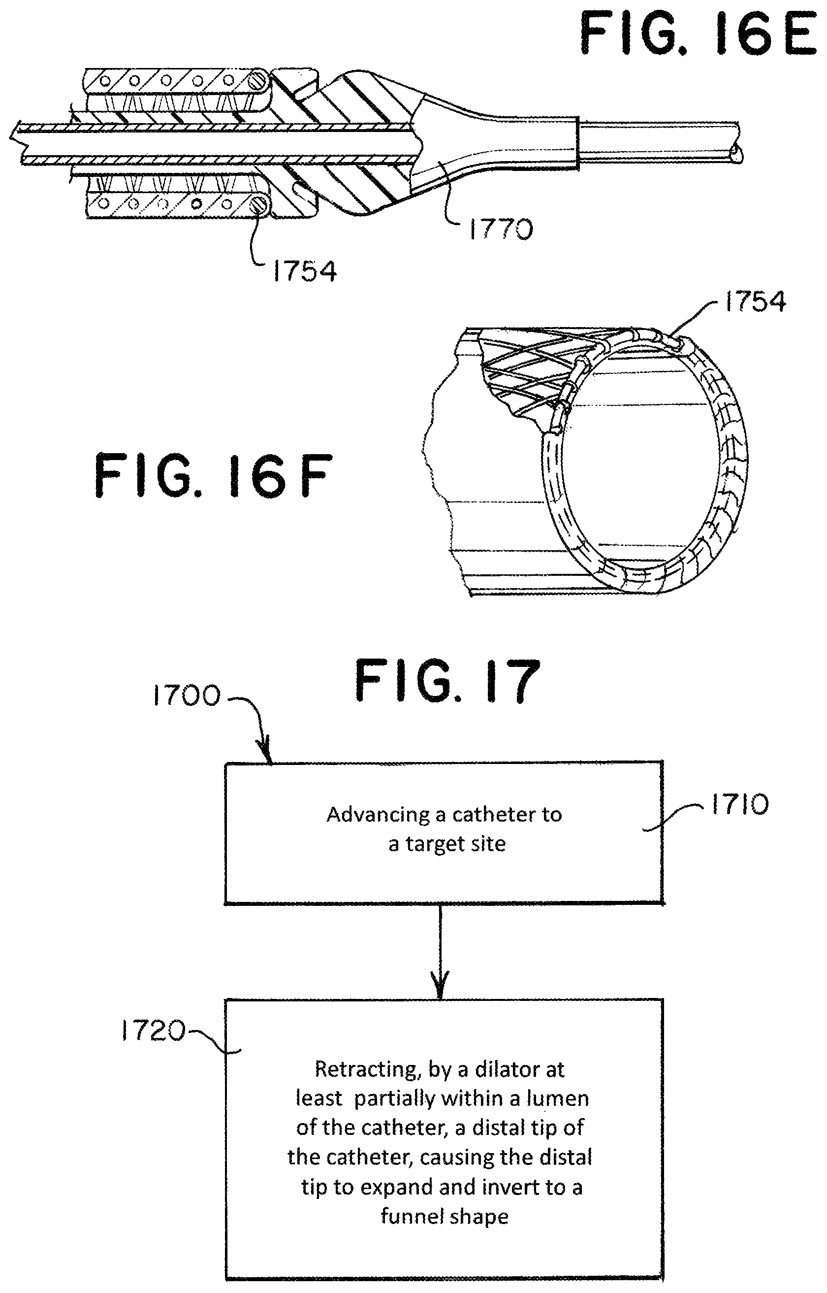 advancing the catheter to a target site; retracting, by a dilator at least partially within a lumen of the catheter, a pull ring approximate a distal tip of the catheter, causing the distal tip to expand and invert to a funnel shape, the pull ring and a proximal end of the distal tip each comprising mating surfaces configured to snap lock together. 16. The method of restricting, by the funnel shape, flow in the blood vessel. 17. The method of withdrawing the dilator from the catheter; aspirating through the catheter to stimulate a thrombus into a mouth of the funnel shape; and withdrawing the catheter with the thrombus from a patient. 18. The method of capturing an occlusive thrombus with a mechanical thrombectomy device; and withdrawing the mechanical thrombectomy device into the funnel shape of the catheter.