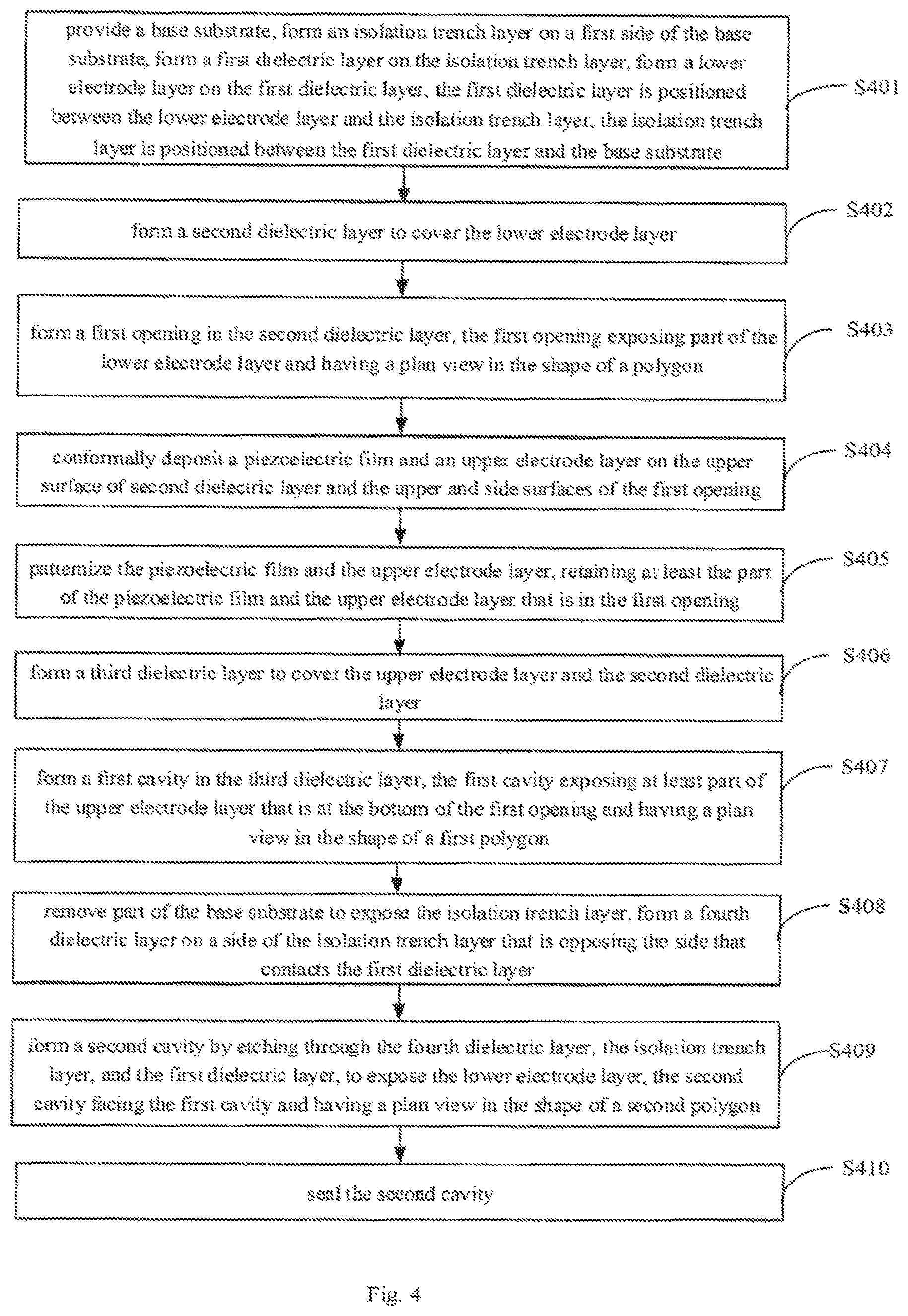 an isolation trench layer; a first dielectric layer formed on a first side of the isolation trench layer; a lower electrode layer formed on the first dielectric layer, the lower electrode layer being above the isolation trench layer, and the first dielectric layer being positioned between the lower electrode layer and the isolation trench layer; a second dielectric layer formed on the first dielectric layer and the lower electrode layer; an opening in the second dielectric layer, the opening exposing part of the lower electrode layer and having a plan view in the shape of a polygon; a piezoelectric film formed to cover part of the second dielectric layer and fill part of the opening; an upper electrode layer formed on the piezoelectric film; a third dielectric formed to cover both the upper electrode layer and the second dielectric layer; a first cavity formed in the third dielectric layer, the first cavity having a plan view in the shape of a first polygon; a fourth dielectric layer formed on a second side of the isolation trench layer, so that the isolation trench layer is positioned between the fourth dielectric layer and the first dielectric layer; a second cavity extending through the fourth dielectric layer, the isolation trench layer, and the first dielectric layer and having a plan view of a second polygon, the first and second cavities facing each other and their plan views forming an overlapped region with an outline in the shape of a third polygon that does not have any parallel sides; and an acoustic resonance film comprising the lower electrode layer, the piezoelectric film, and the upper electrode layer. 6. The semiconductor apparatus of a fifth dielectric layer on the third dielectric layer. 7. The semiconductor apparatus of a first assistant substrate; and a first bonding layer formed on the first assistant substrate and being bonded with the fifth dielectric layer to seal the first cavity, wherein the first cavity extending through the third and fifth dielectric layers and exposing at least part of the upper electrode layer. 8. The semiconductor apparatus of a first cover layer positioned between the third dielectric layer and part of the upper electrode layer and sealing the first cavity; and at least one first release hole extending through a portion of the first cover layer, the third dielectric layer, and the fifth dielectric layer that are on top of the first cavity, wherein the first release hole is filled and sealed by a first filling material, wherein the first filling material also covers the upper surface of the fifth dielectric layer. 9. The semiconductor apparatus of a second assistant substrate; and a second bonding layer formed on the second assistant substrate and being bonded with the fourth dielectric layer to seal the second cavity. 10. The semiconductor apparatus of a second cover layer formed on the surface of the fourth dielectric layer and sealing the second cavity; and at least one second release hole extending through a portion of the second cover layer that is facing the second cavity and being filled and sealed by a second filling material. 11. The semiconductor apparatus of a contact hole extending through the fourth dielectric layer, the isolation trench layer, the first dielectric layer, and the piezoelectric film to electrically connect to the upper electrode layer, wherein the contact hole comprises a liner layer and a conductive material inside. 12. The semiconductor apparatus of an adhesive layer positioned between the piezoelectric film and the lower electrode layer; and one or more insulation layer positioned in at least one of: between the lower electrode layer and the adhesive layer, and between the upper electrode layer and the piezoelectric film.