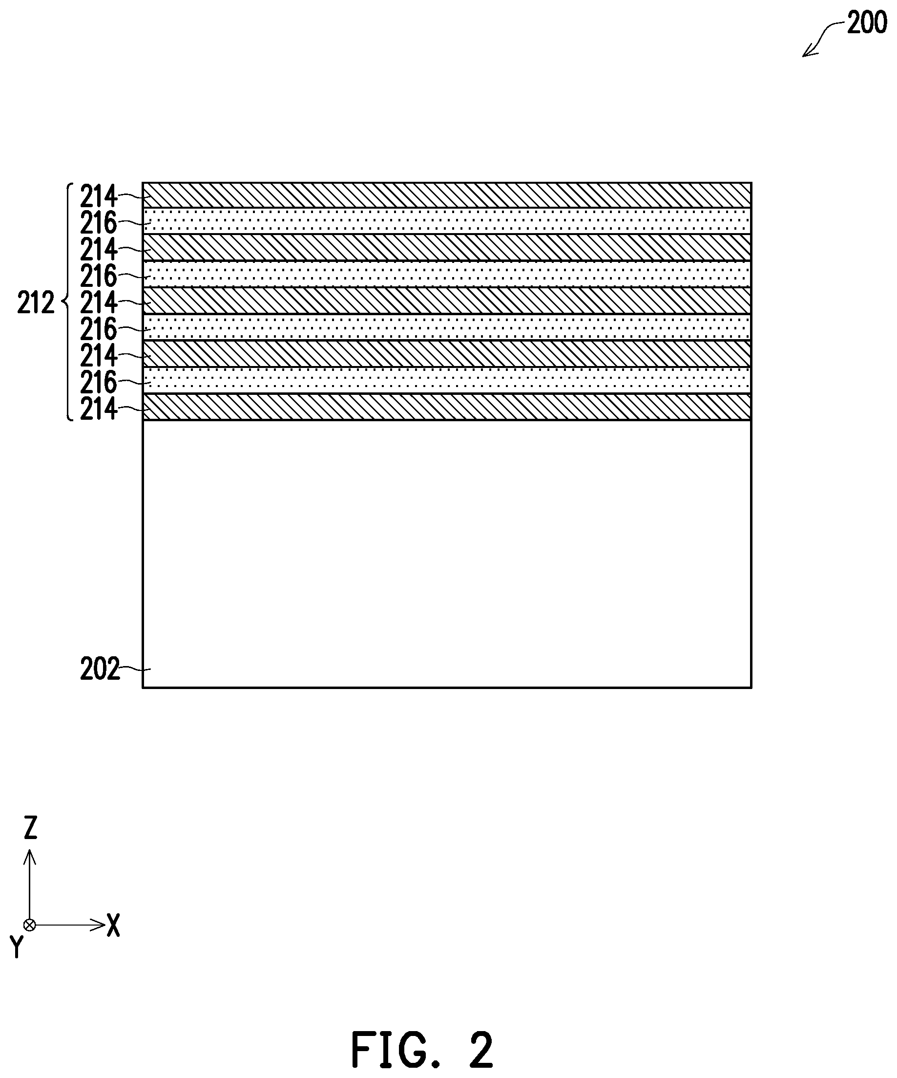 [0019]At operation 104, the method 100 (FIG. 1A) forms one or more epitaxial layers over the substrate 202, as shown in FIG. 2. In some embodiments, an epitaxial stack 212 is formed over the substrate 202. The epitaxial stack 212 includes epitaxial layers 214 of a first composition interposed by epitaxial layers 216 of a second composition. The first and second composition may be different. In an embodiment, the epitaxial layers 214 are SiGe and the epitaxial layers 216 are silicon. However, other embodiments are possible including those that provide for a first composition and a second composition having different oxidation rates and/or etch selectivity. In some embodiments, the epitaxial layer 214 includes SiGe and where the epitaxial layer 216 includes silicon, the silicon oxidation rate is less than the SiGe oxidation rate. It is noted that five (5) layers of epitaxial layers 214 and four (4) layers of epitaxial layers 216 are illustrated in FIG. 2, which is for illustrative purposes only and not intended to be limiting beyond what is specifically recited in the claims. It can be appreciated that any number of epitaxial layers may be formed in the epitaxial stack 212; the number of layers depending on the desired number of channels regions for the device 200. In some embodiments, the number of epitaxial layers 216 is between 2 and 10, such as 4 or 5.